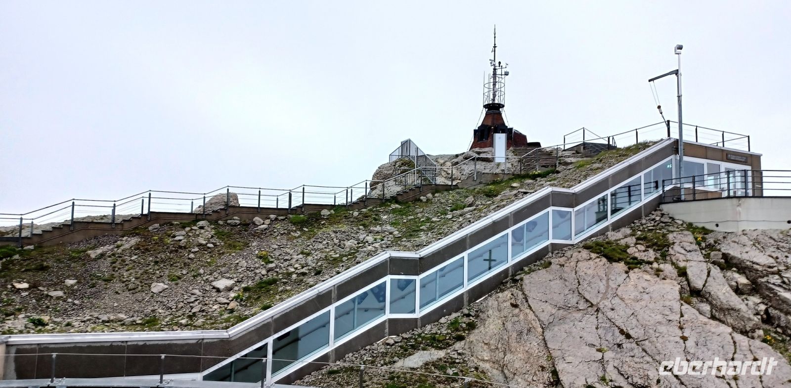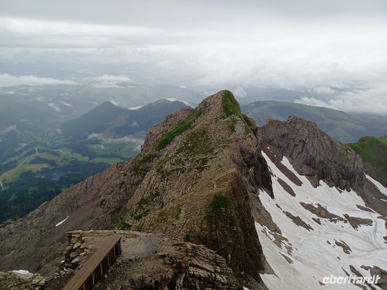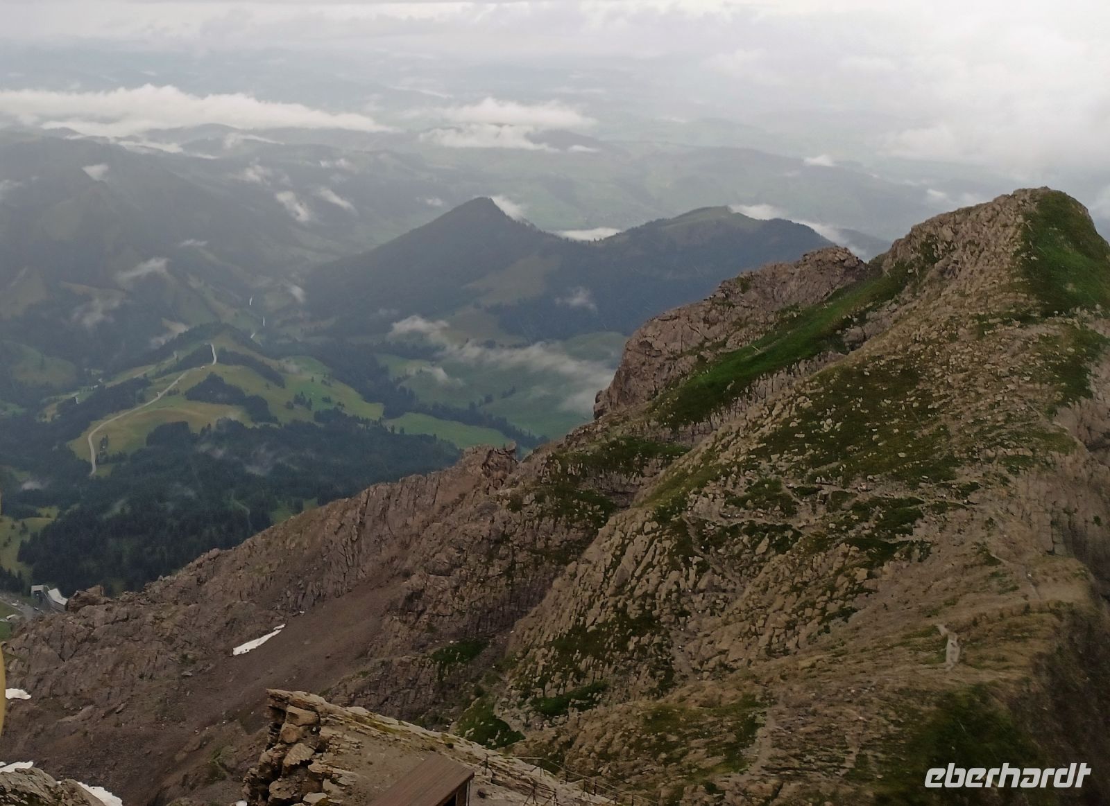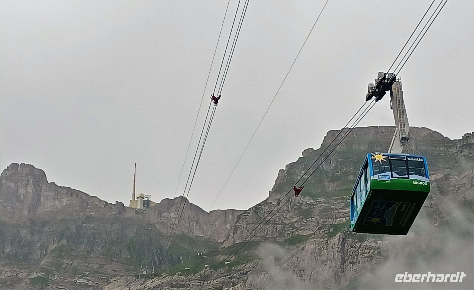 13.7.2023. Heute haben wir unser Frühstück an einem besonderen Ort. Hoch oben auf der Säntis-Spitze befindet sich das Bergrestaurant. Als wir die Koffer in den Bus laden, ist der Berg frei von Wolken, das lässt hoffen. Als wir aber mit der großen Gondel aufwärts fahren, umgibt uns das Gebräu einer mächtigen Wolke. Regentropfen klatschen an die Fenster der Bahn, aber kurz vor der Spitze durchdringen wir den Nebel und der Blick wird frei auf einen Teil der gigantischen Berge, darunter liegt die Wolkendecke – ein einmaliger Anblick.