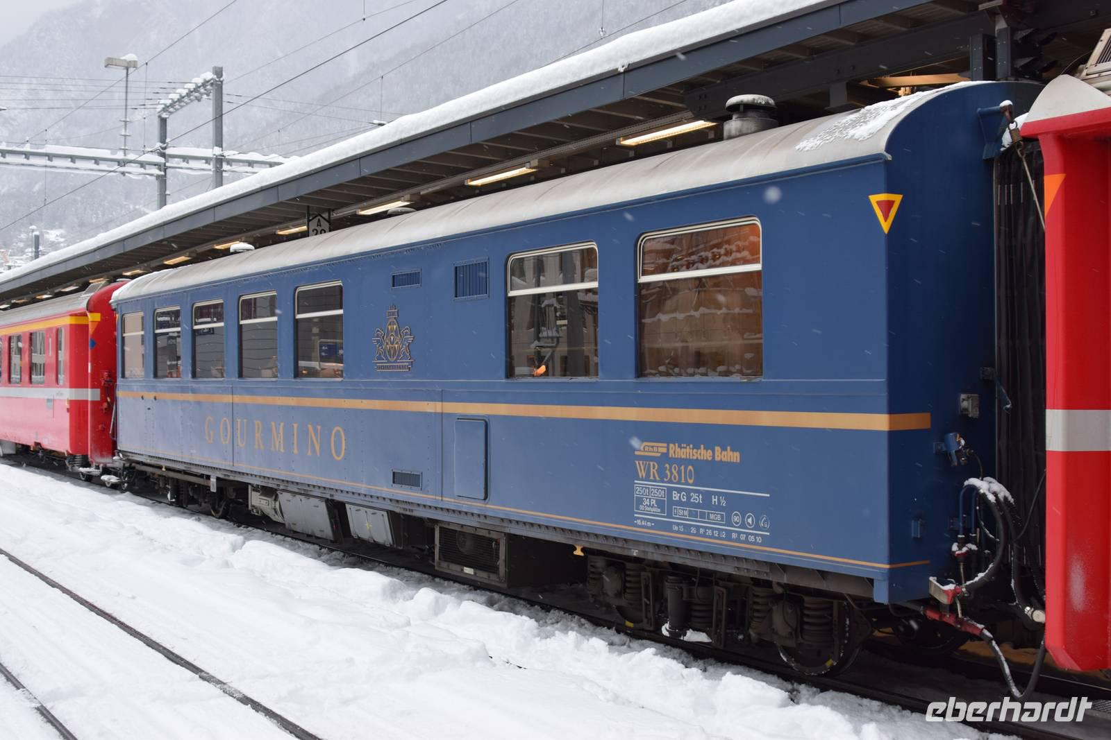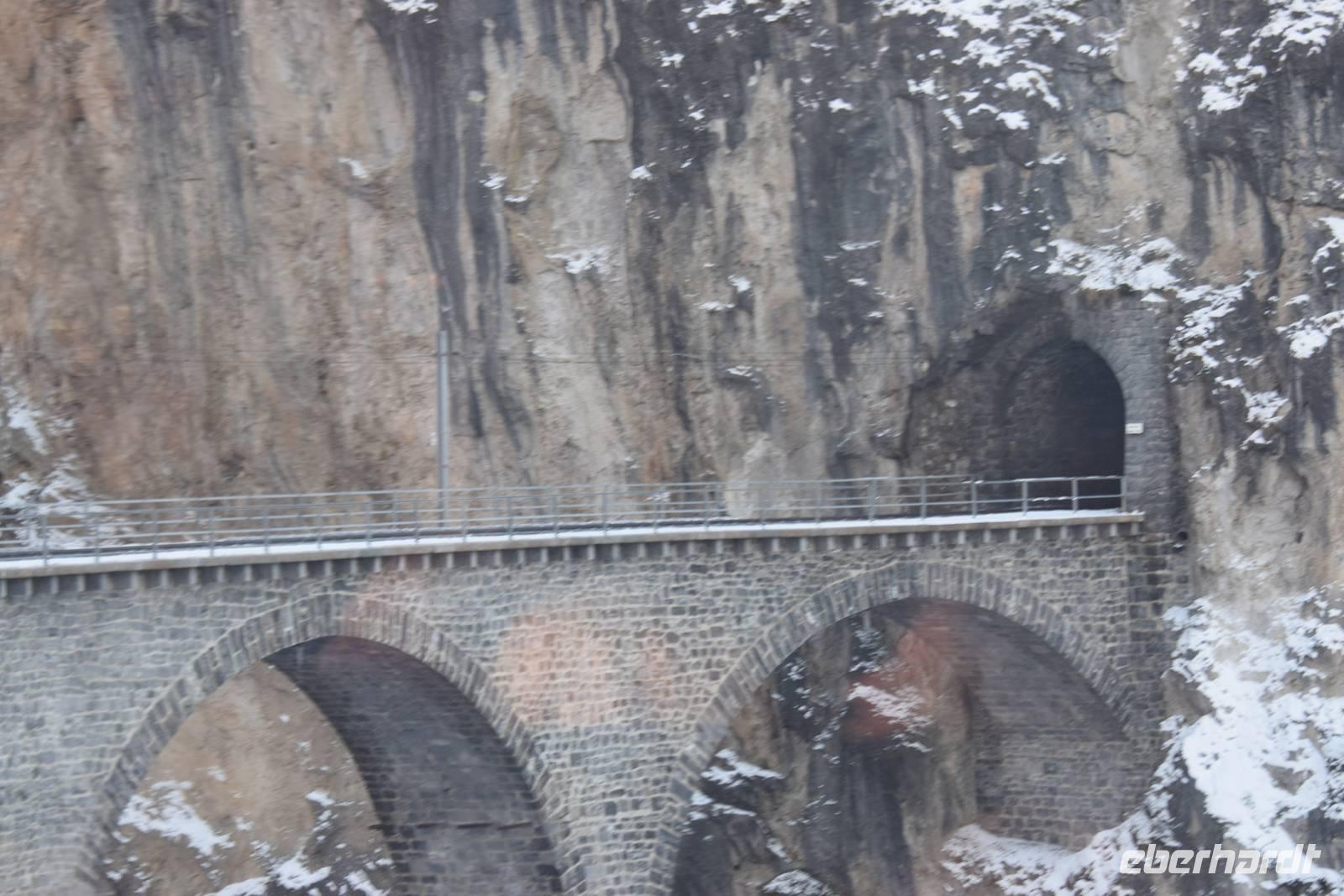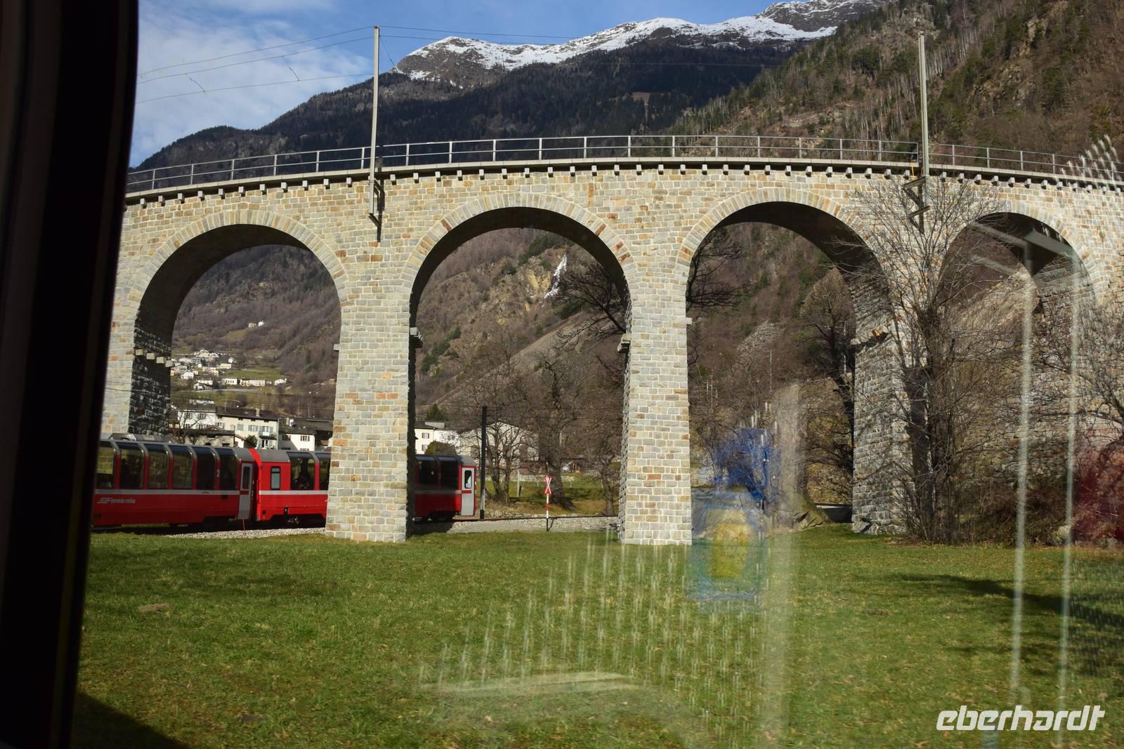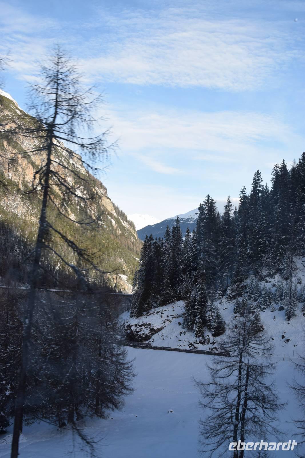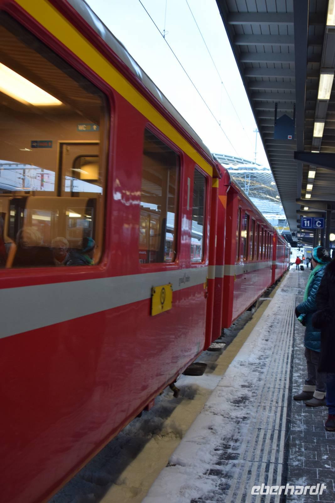 Ein kurzer Spaziergang führt uns zum Bahnhof Tiefencastel. Wieder ist ein Wagon für uns reserviert. Fast dreieinhalb Stunden fahren wir durch eine spektakuläre Landschaft. Immer wieder hört man das aufregende Klicken der Fotoapparate. Wir können uns nicht satt sehen an der winterlich verschneiten Umgebung. Durch Lautsprecher werden wir darüber informiert, welches Viadukt wir gerade überqueren oder welche Berge zu sehen sind. Zwischendurch erfreut uns ein italienischer Kellner mit seinem ausgesprochenen Humor.