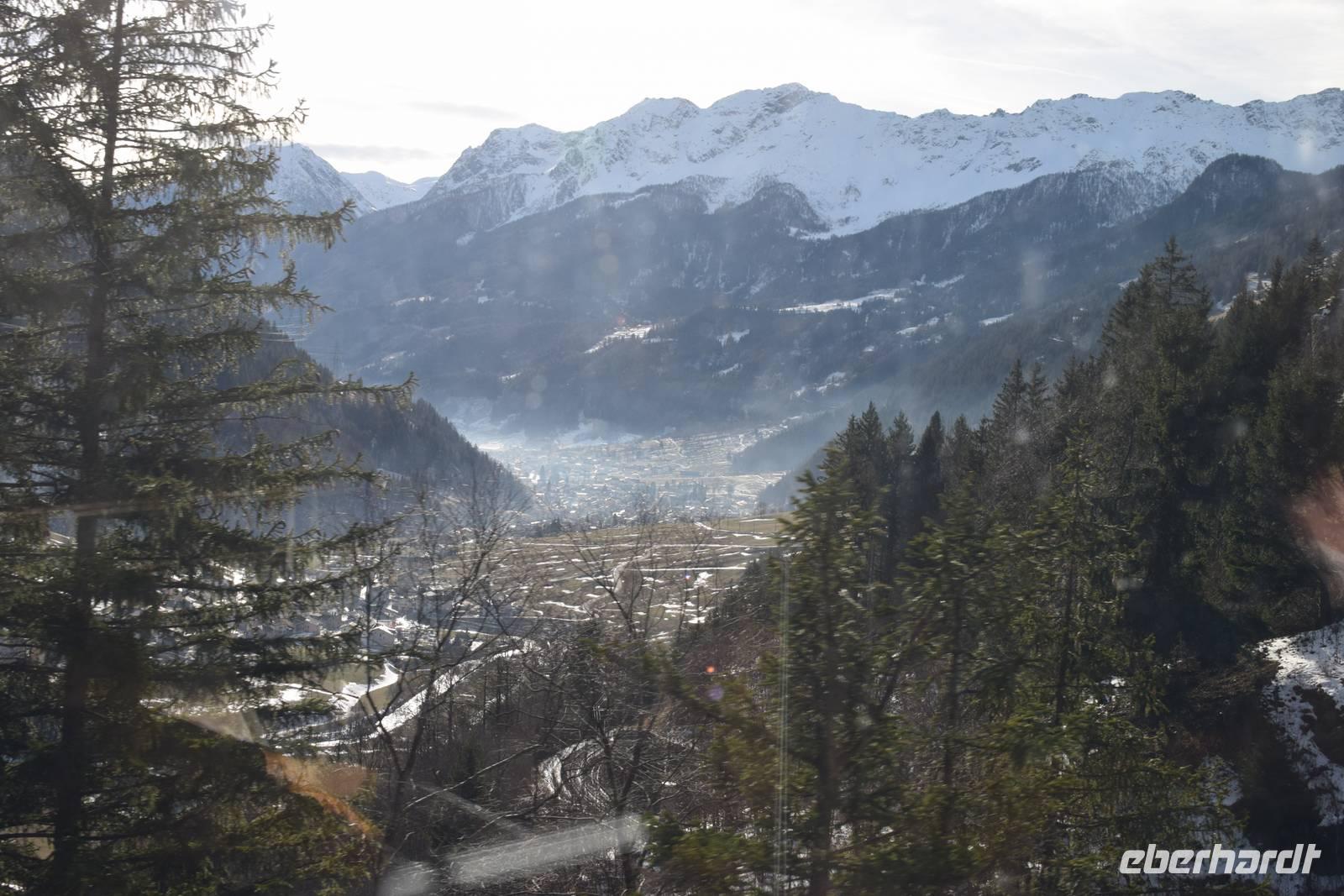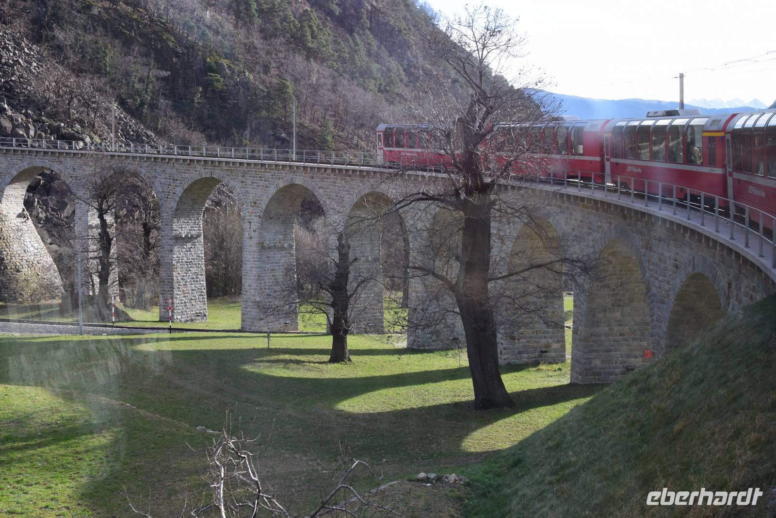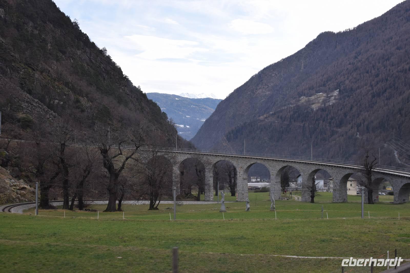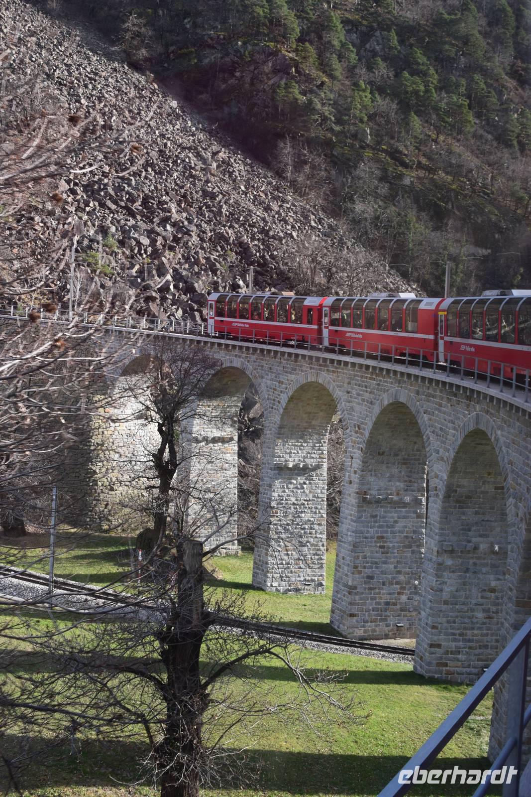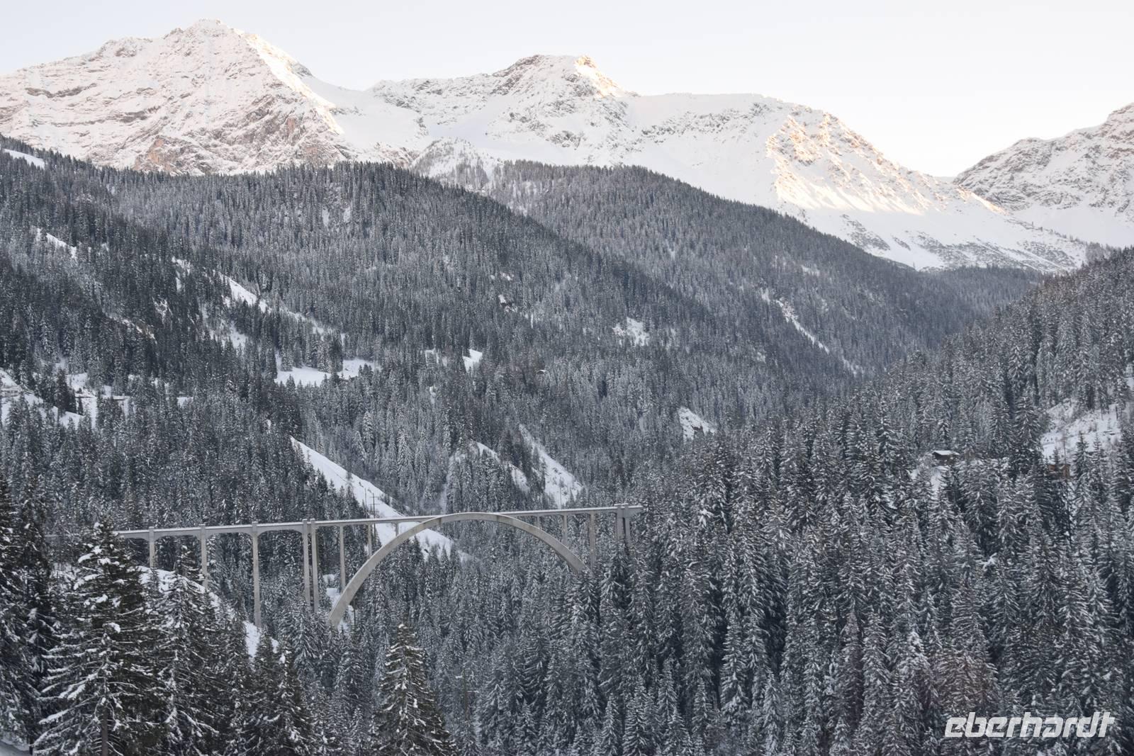 Ein kurzer Spaziergang führt uns zum Bahnhof Tiefencastel. Wieder ist ein Wagon für uns reserviert. Fast dreieinhalb Stunden fahren wir durch eine spektakuläre Landschaft. Immer wieder hört man das aufregende Klicken der Fotoapparate. Wir können uns nicht satt sehen an der winterlich verschneiten Umgebung. Durch Lautsprecher werden wir darüber informiert, welches Viadukt wir gerade überqueren oder welche Berge zu sehen sind. Zwischendurch erfreut uns ein italienischer Kellner mit seinem ausgesprochenen Humor.