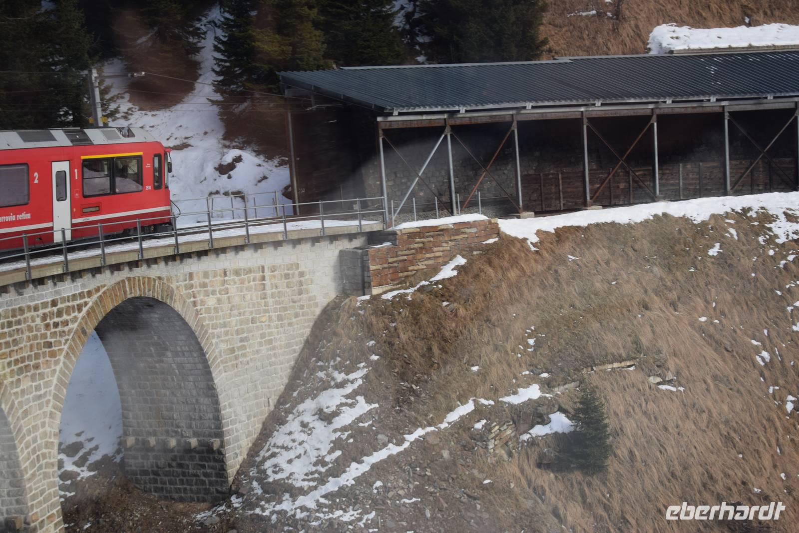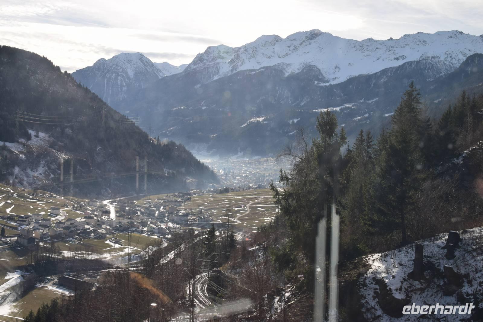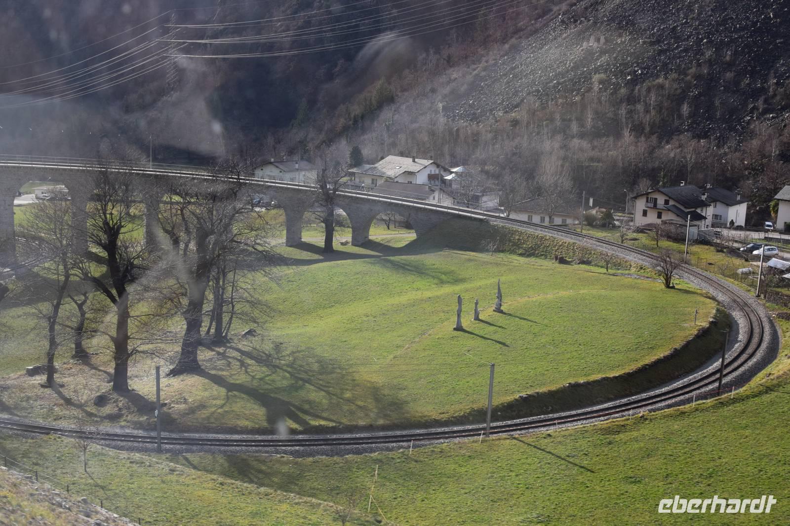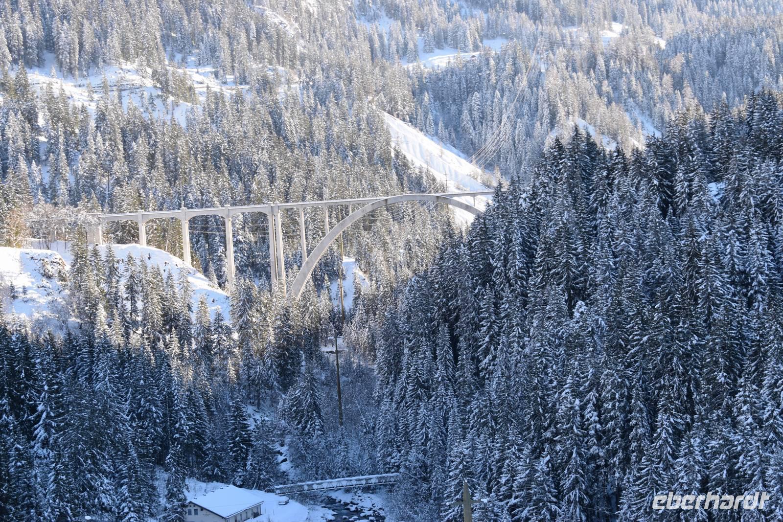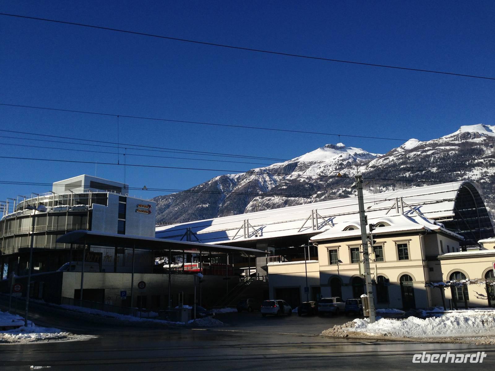 Ein kurzer Spaziergang führt uns zum Bahnhof Tiefencastel. Wieder ist ein Wagon für uns reserviert. Fast dreieinhalb Stunden fahren wir durch eine spektakuläre Landschaft. Immer wieder hört man das aufregende Klicken der Fotoapparate. Wir können uns nicht satt sehen an der winterlich verschneiten Umgebung. Durch Lautsprecher werden wir darüber informiert, welches Viadukt wir gerade überqueren oder welche Berge zu sehen sind. Zwischendurch erfreut uns ein italienischer Kellner mit seinem ausgesprochenen Humor.