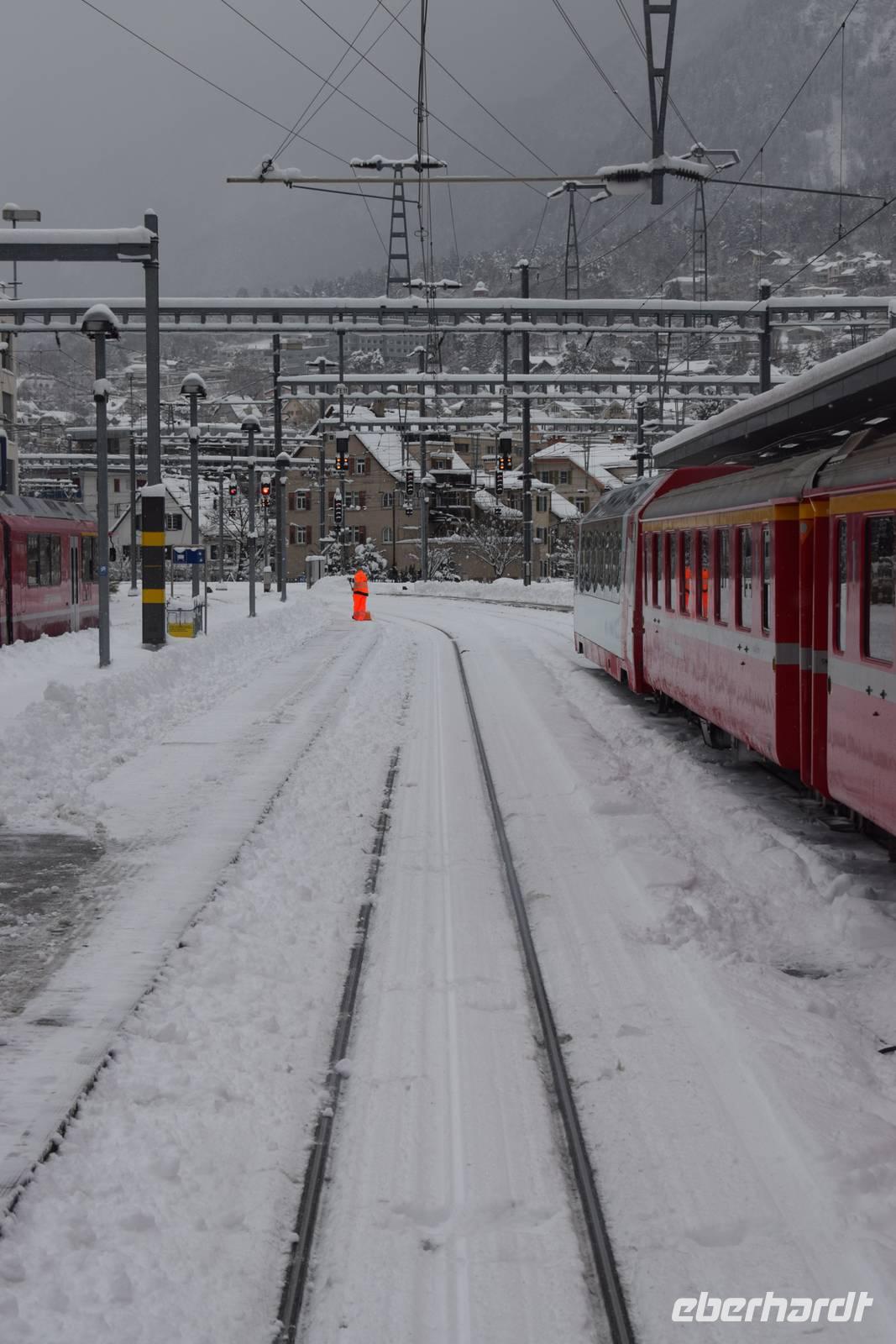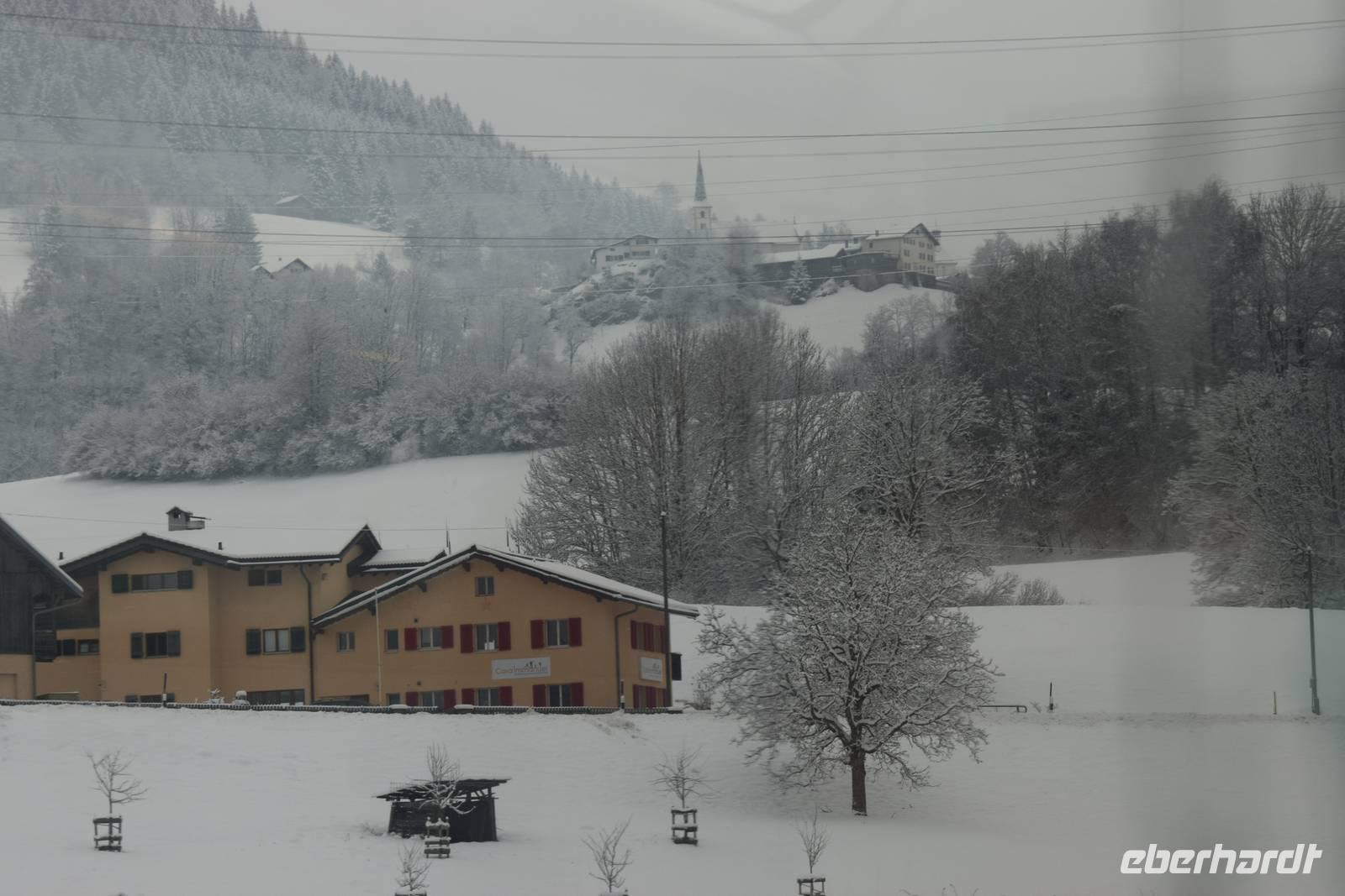 Freundlicherweise dürfen wir bereits um 6.45 Uhr frühstücken, obwohl es offiziell erst ab 7.00 Uhr eingeplant ist. Wir jedoch starten schon um 7.30 Uhr unseren ersten Ausflug. Mit dem Bus fahren wir bis Chur. Extra für unsere Gruppe wird ein Panoramawagen angekoppelt. 08.56 Uhr beginnt unsere Fahrt durch die traumhaft verschneite Winterlandschaft auf den Spuren des Glacier-Express nach Disentis.