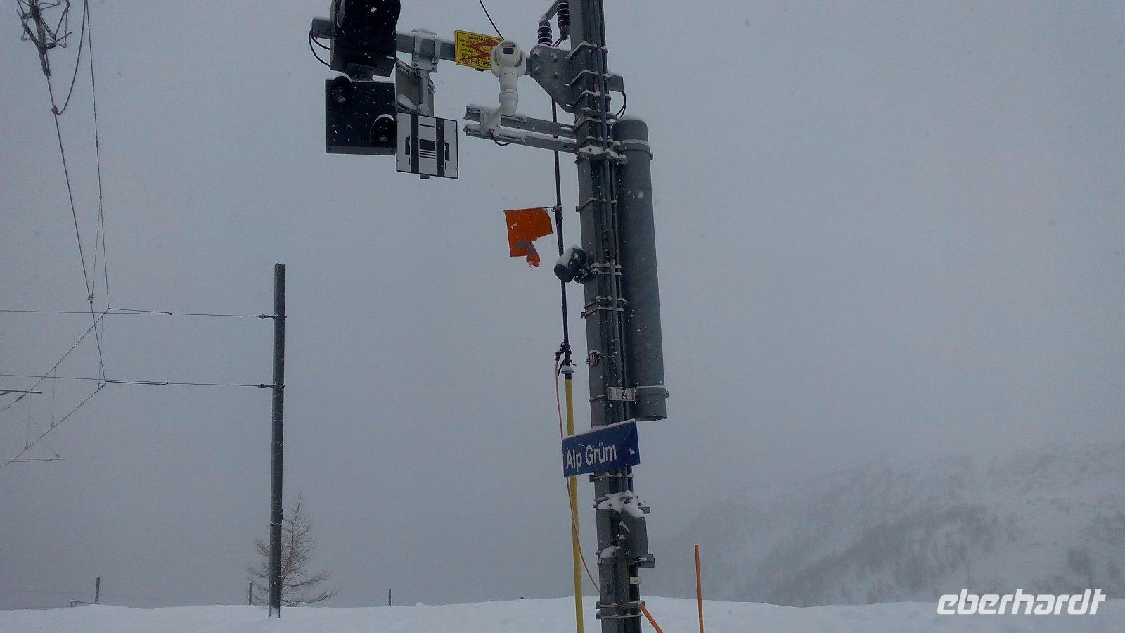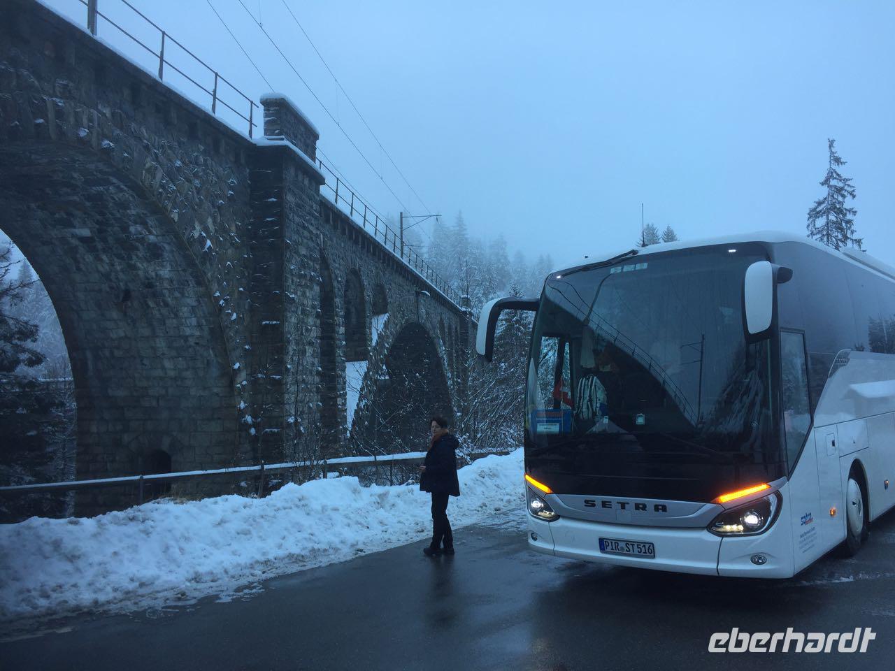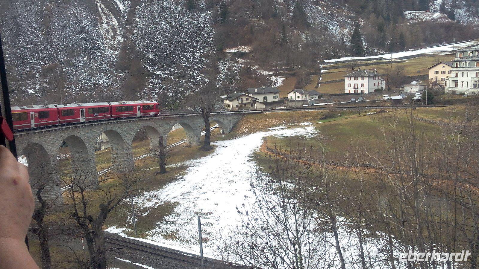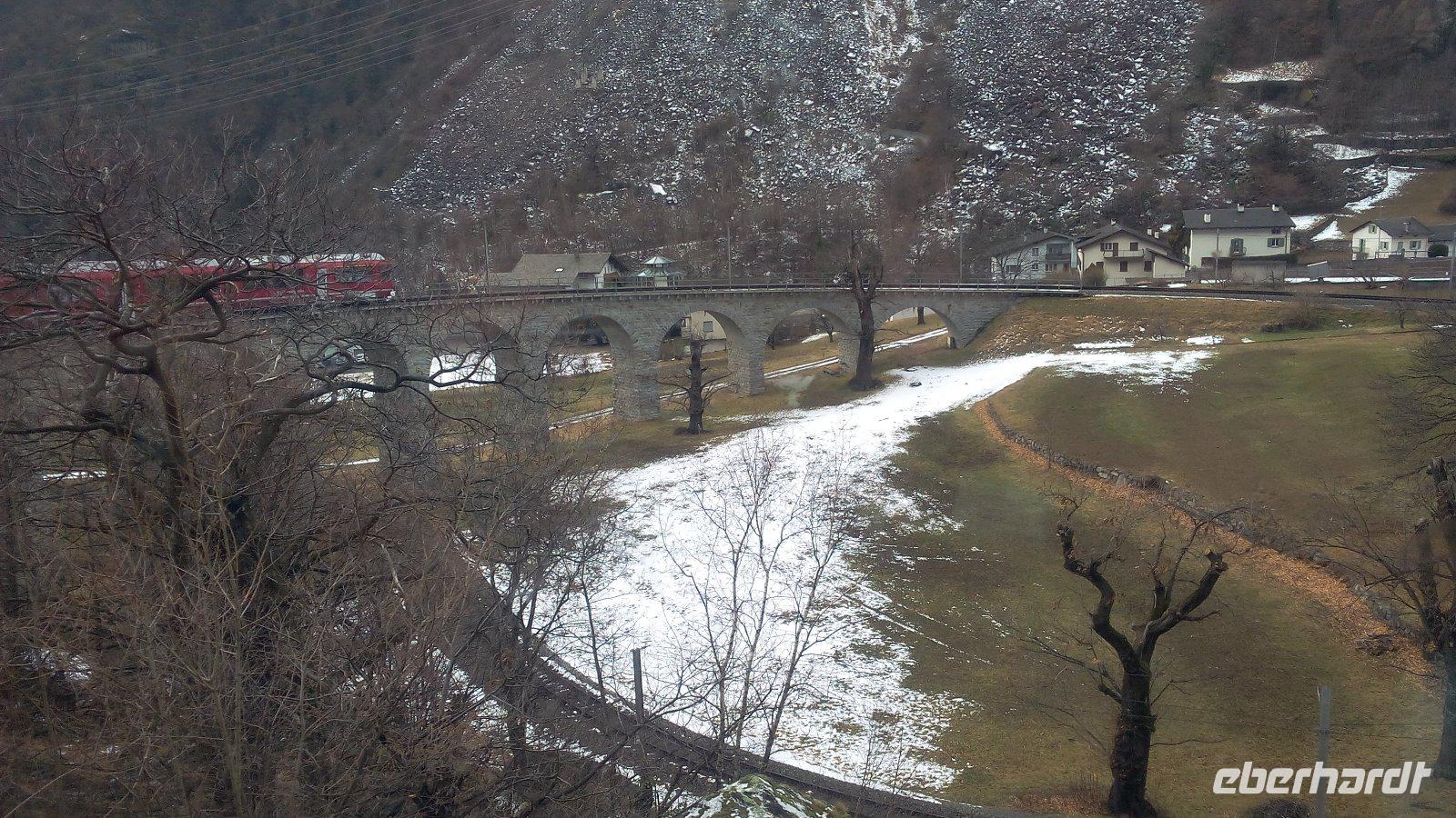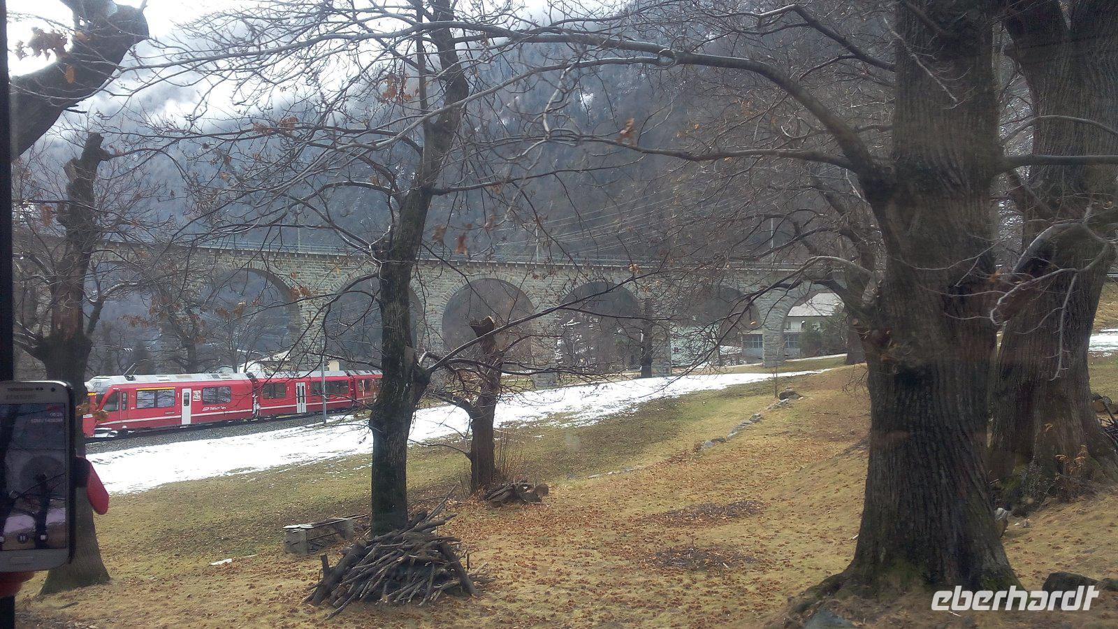 haben wir einen kurzen Aufenthalt und genießen den Wind, Schnee und die herrliche Winterlandschaft. Der Kreisviadukt bei Brusio zieht noch einmal die Aufmerksamkeit aller Reisegäste auf sich.