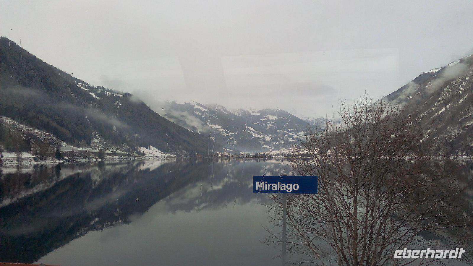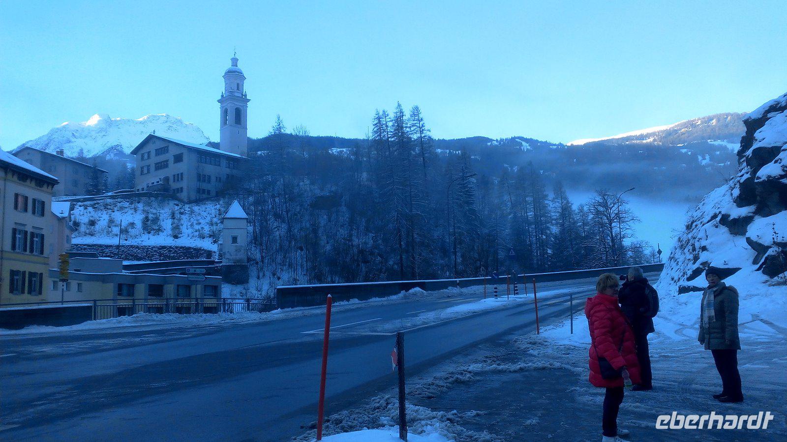 Die letzte Nacht hat es geschneit. Wir haben eine herrliche Sicht auf Tiefencastel, als wir uns am Bahnhof treffen. Wir beginnen von hieraus unser erstes Bahnerlebnis. Italien ist heute unser Ziel. Wir fahren mit dem Bernina-Express, der höchsten Bahnverbindung, die offen - ohne Scheiteltunnel - über die Alpen führt, nach Tirano. Begeisterung bei allen Gästen, vor allem natürlich bei den Fotografen. Die Berge und Gletscher verschmolzen ineinander bei derartigen winterlichen Bedingungen. Unsere Gedanken sind bei Jörg, hoffentlich kommt er gut über die Pässe. In