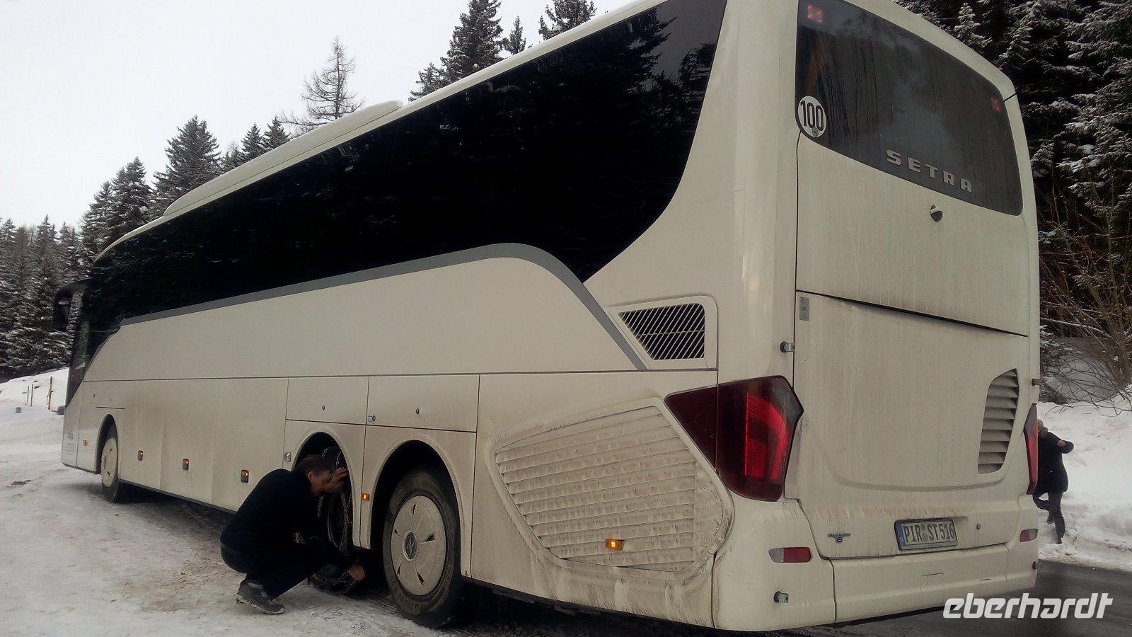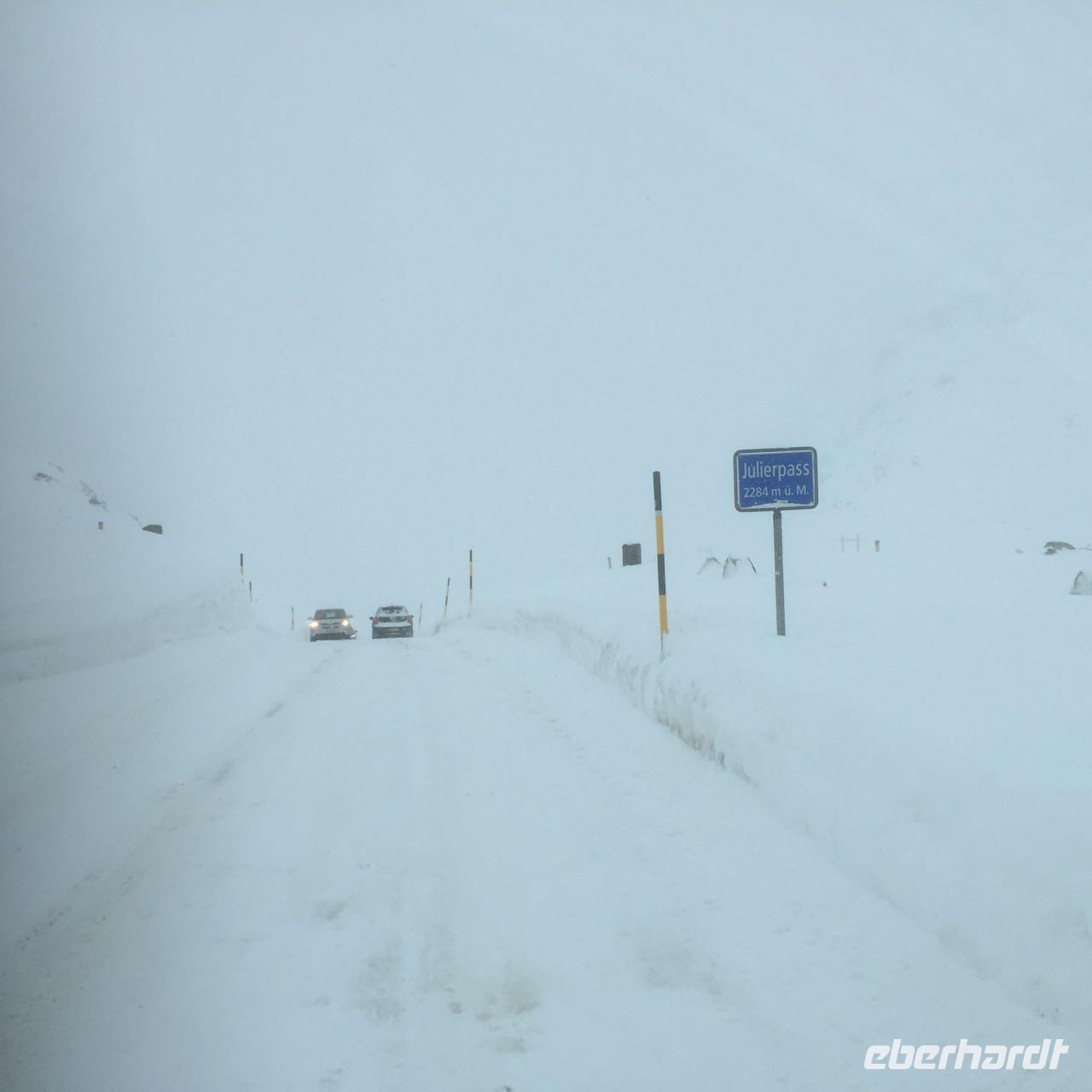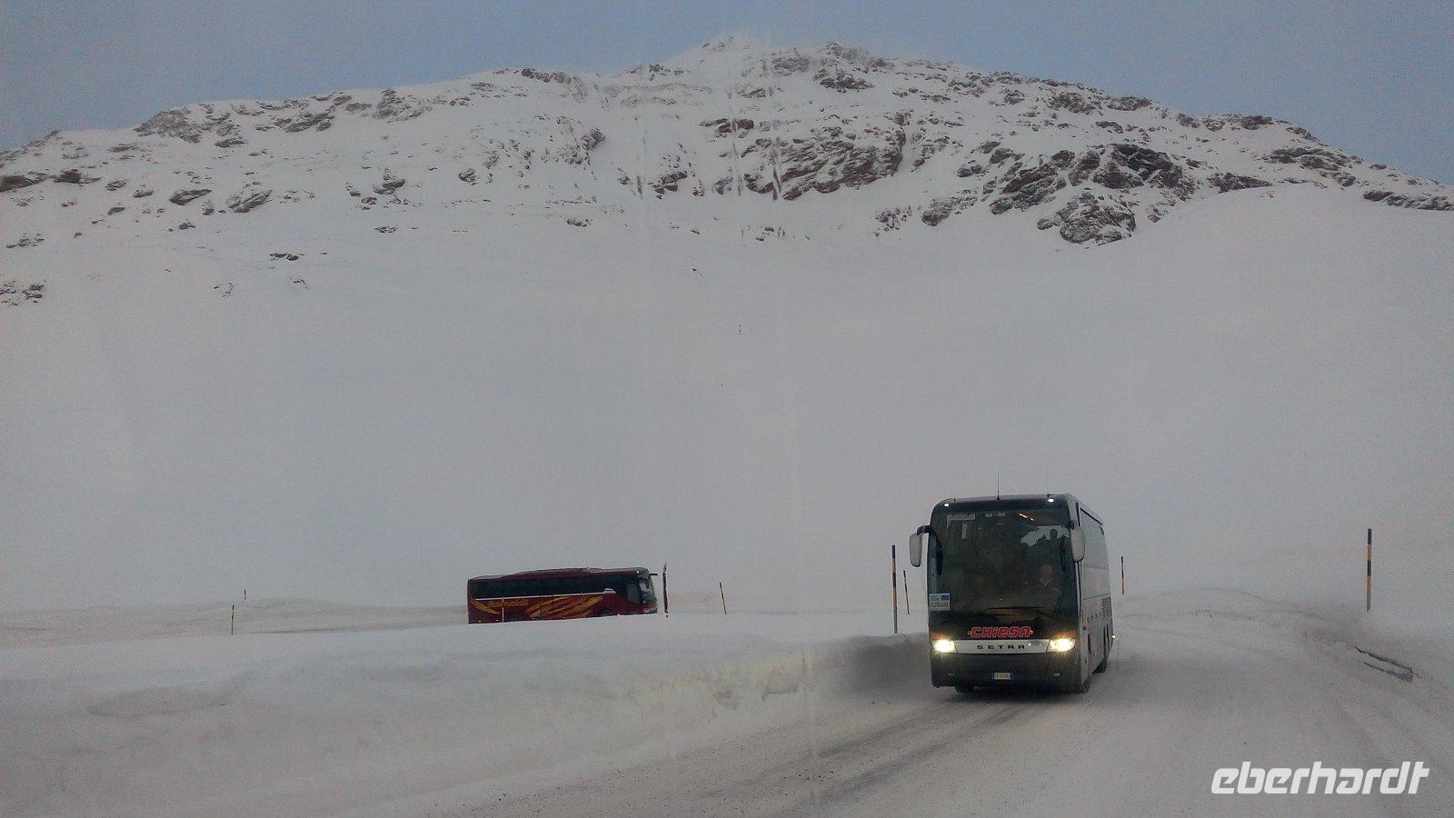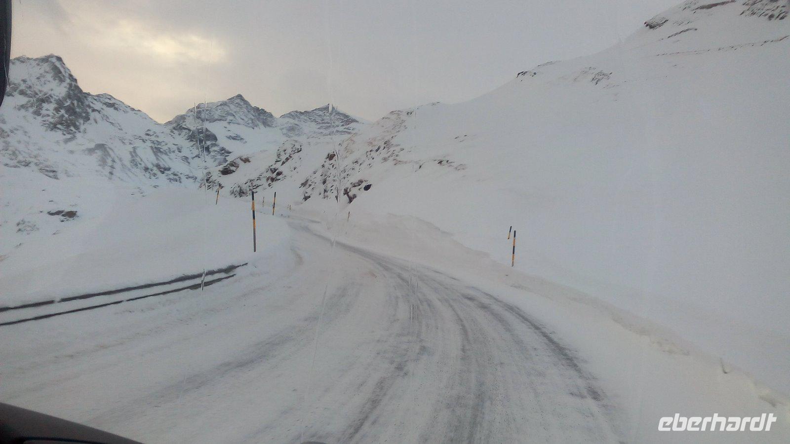 Auf dem Weg zurück erleben wir die winterlichen Bedingungen noch einmal anders. In Tirano noch ohne Schnee und Temperaturen um 6 Grad fahren wir am Kreisviadukt in Brusio vorbei zum Berninapass (2323m). Auf halber Strecke zum Pass muss Jörg die Schneeketten aufziehen. Wir genießen derweilen den Glühwein. Mit den Schneeketten kommen wir sicher über den Pass. Das Wetter ändert sich und wir haben einen besseren Blick auf den Moteratschgletscher. Gegen 17.00 kommen wir in St. Moritz an. Wir sehen St. Moritz Bad und Dorf beleuchtet. Es ist beeindruckend diesen Ort im Winter zu erleben, der Wintersportort , der in aller Welt der berühmte exklusivste und teuerste der Alpen ist. Sehr beeindruckend ist unsere anschließende "Nachtfahrt" über den Julierpass (2284m) und durch das Oberalpstein (23 km lange Tal der Julia) mit den beleuchteten Orten.