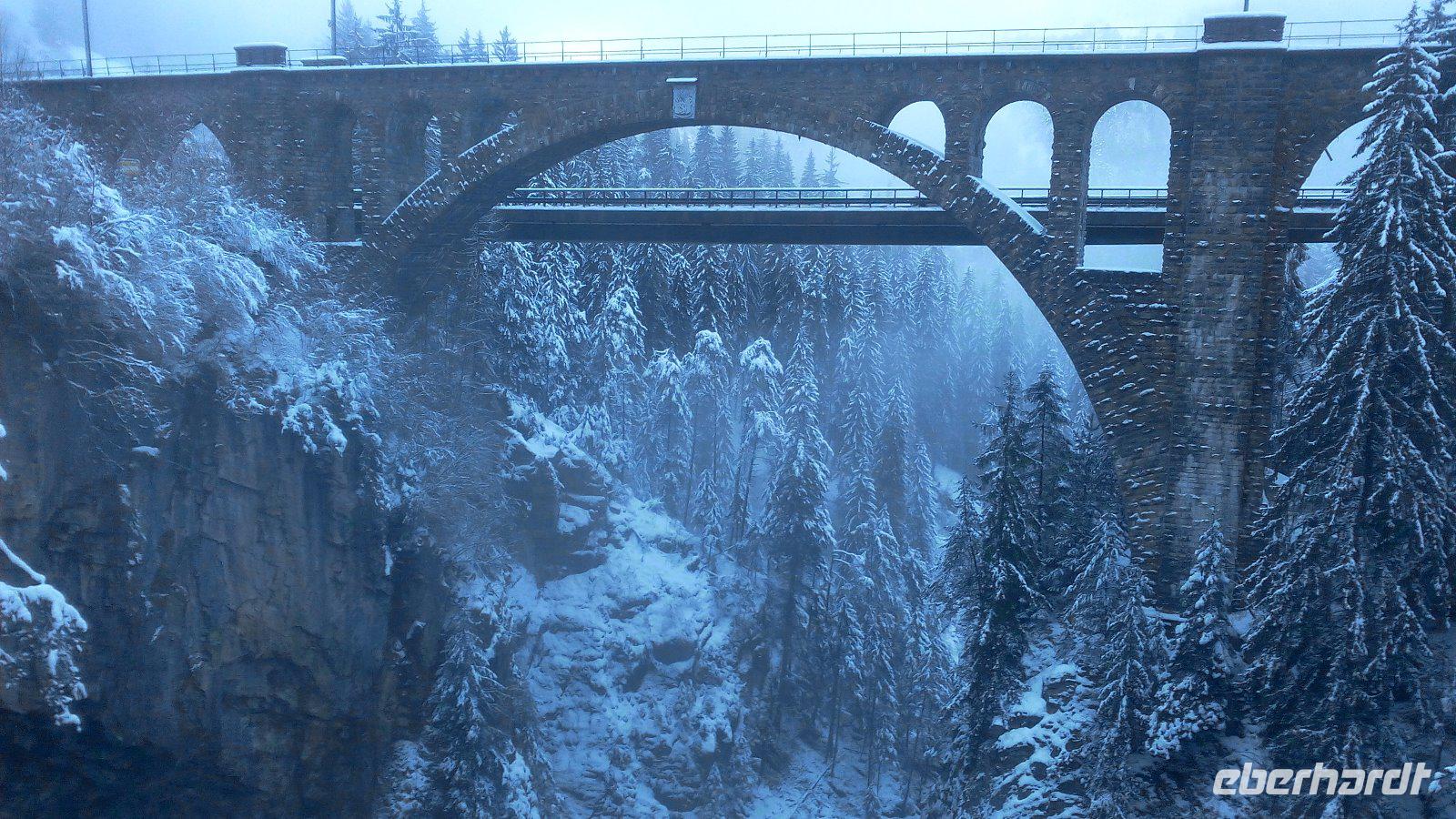 Das Jahr 2017 geht zu Ende. Wir beginnen den Tag entspannt. Wir fahren mit dem Bus nach Chur. Auf dem Weg dahin nehmen wir uns Zeit ein wichtiges Viadukt auf der Eisenbahnstrecke Thusis - Filisur zu fotografieren. Es ist das Soliser Viadukt, das den Fluss Albula überspannt. Die Brücke ist 85 m hoch und 164 m lang und ein Muss für die Fotografen.