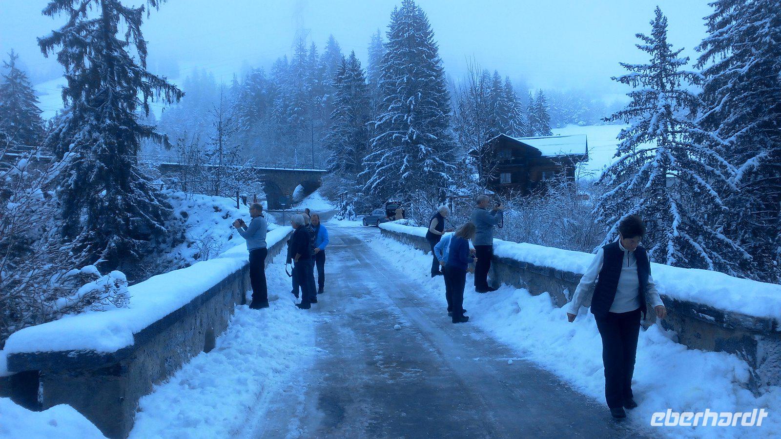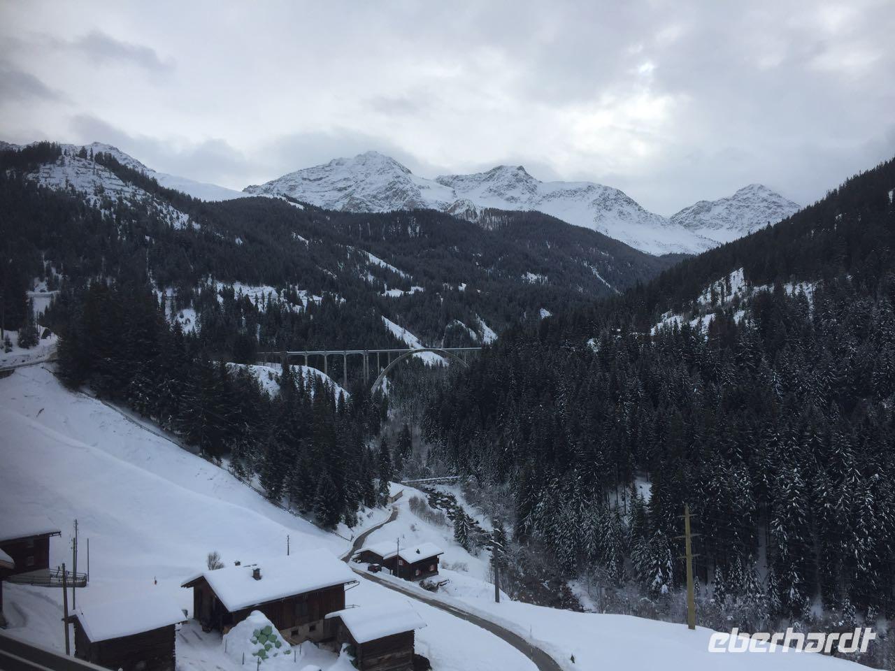 Gegen 10 Uhr beginnen wir unsere Neujahrsfahrt. Auf der Strecke nach Chur lauschen wir dem Neujahrskonzert und stehen bald vor dem Bahnhof von Chur. Hier startet unser Arosa Express und in Erwartung auf die Fahrt wissen wir natürlich, dass auf der Strecke von Chur nach Arosa ein Viadukt der besonderen Art auf uns wartet.
