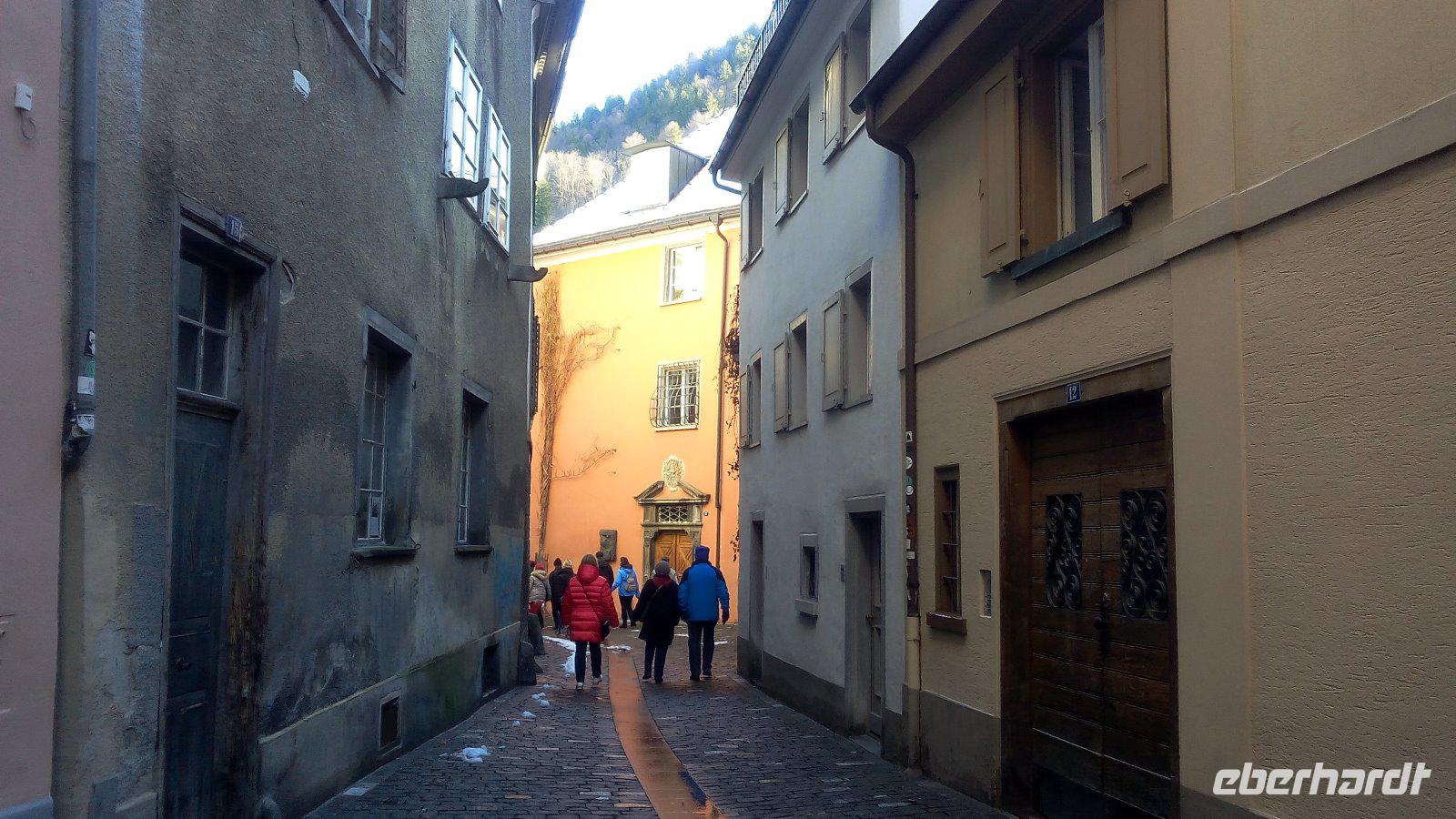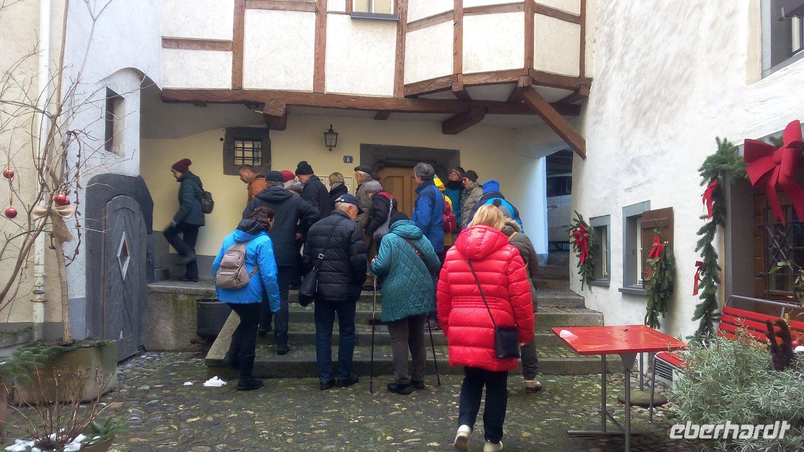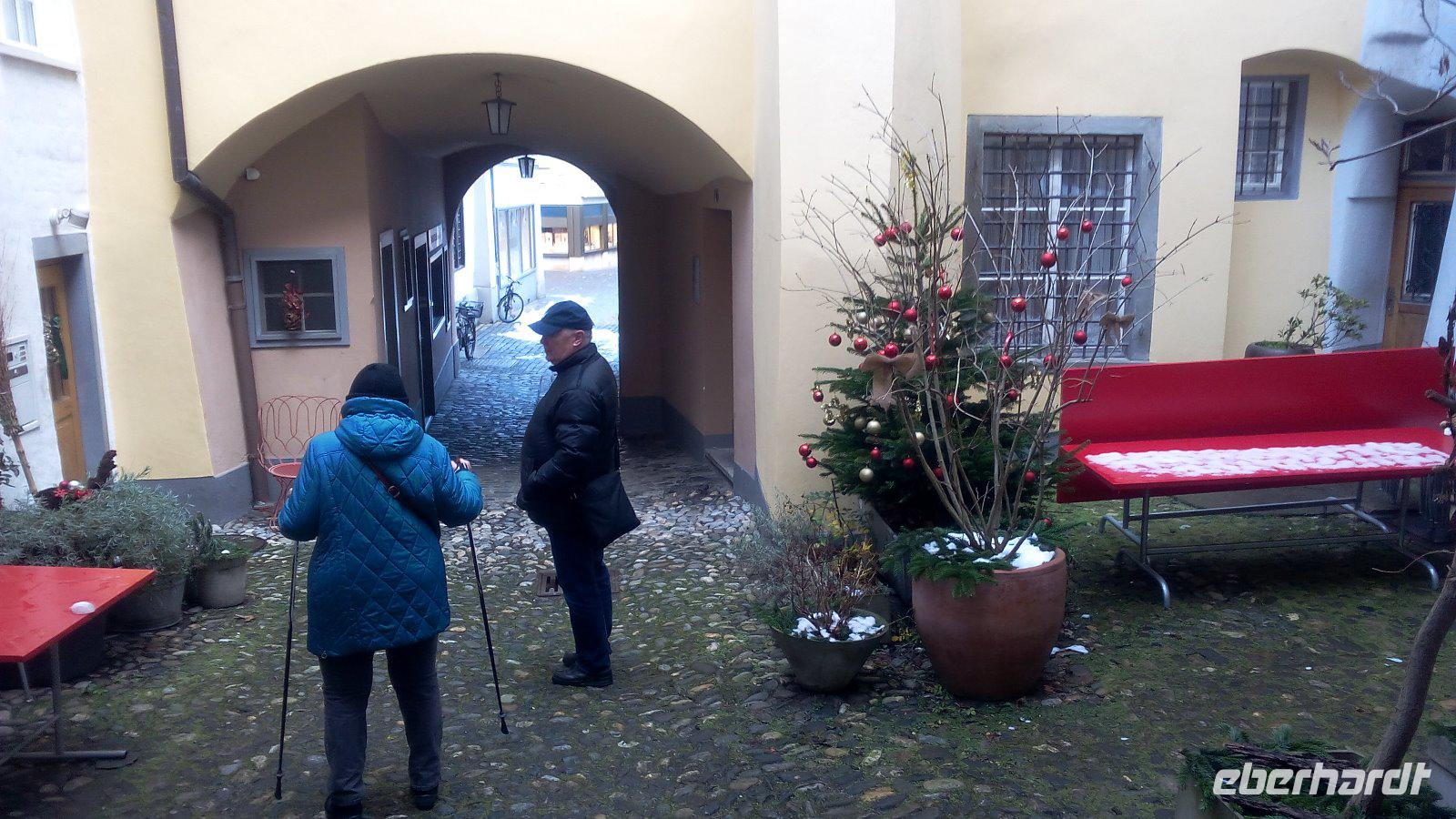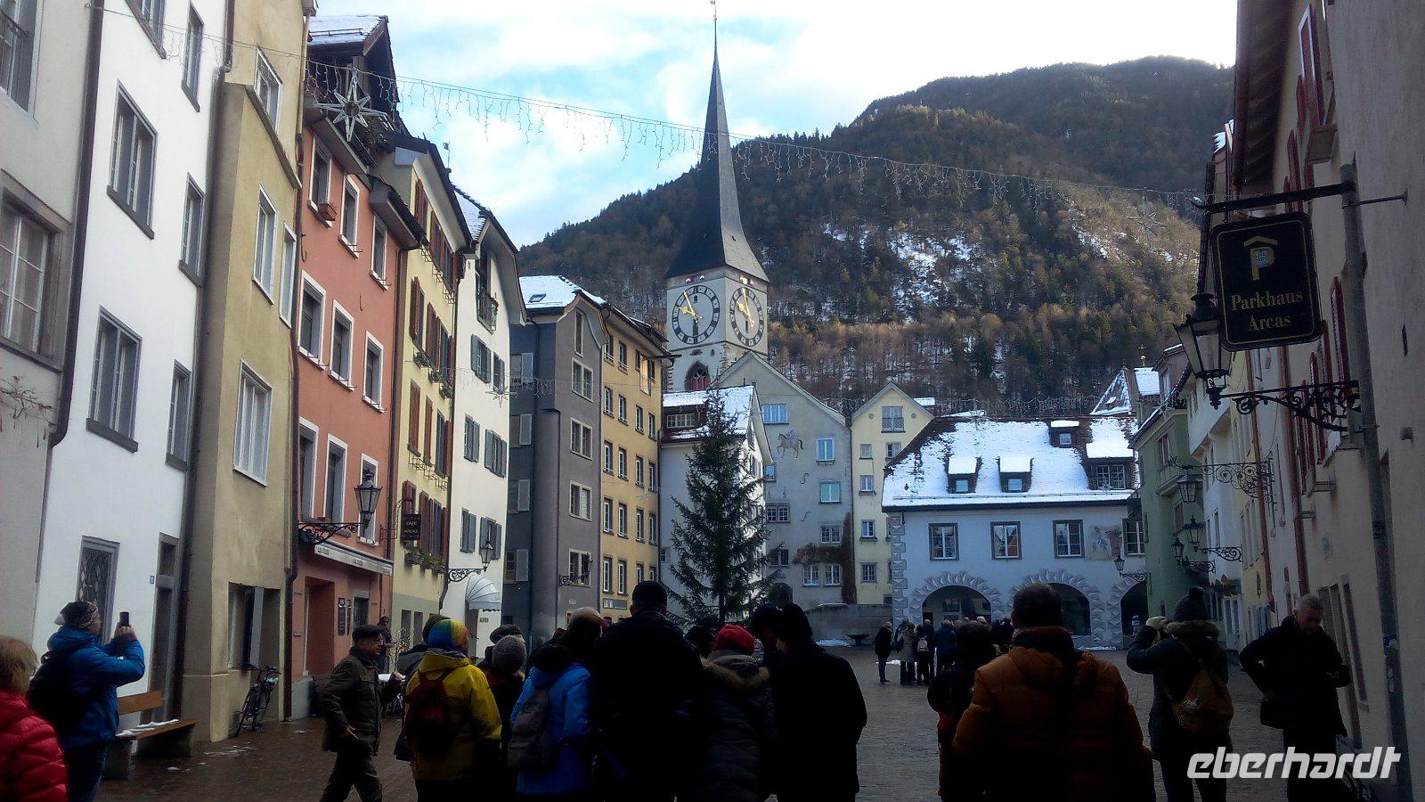 Jetzt müssen wir uns aber sputen. In Chur werden wir schon von 2 Stadtführerinnen erwartet. Unser Stadtführerinnen vermitteln uns die Geschichte und die Bedeutung der ältesten Stadt der Schweiz sehr anschaulich. Unser Spaziergang führt uns zur Kathedrale zur Kirche St. Martin und über den Platz in die Reichsgasse. Interessant ist, wie viel kleine Gassen die Stadt hat und was es zu den kleinen Fenstern alles zu erzählen gibt. Beeindruckend ist das Rathaus mit der Gewölbehalle . Auf dem Weg zum Bahnhof kommen wir noch am Bündner Kunstmuseum vorbei .Eine Stadt, die viel zu bieten hat und ein weiterer Besuch notwendig ist, um die einst mächtige Bischofsstadt noch besser kennenzulernen.Im Bahnhof treffen wir uns an dem schönen großen Weihnachtsbaum und laufen gemeinsam zum Bahnsteig. Der Waggon ist auch heute für uns reserviert. Unsere Fahrt auf den Spuren des GlacierExpress kann beginnen.