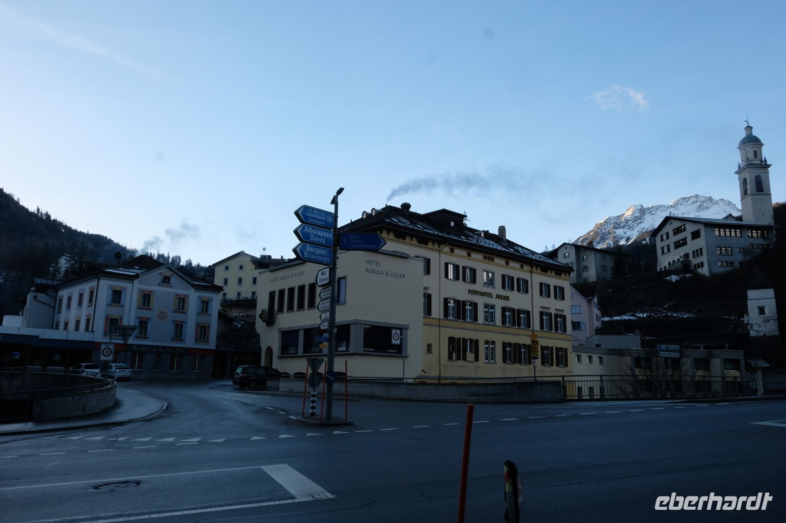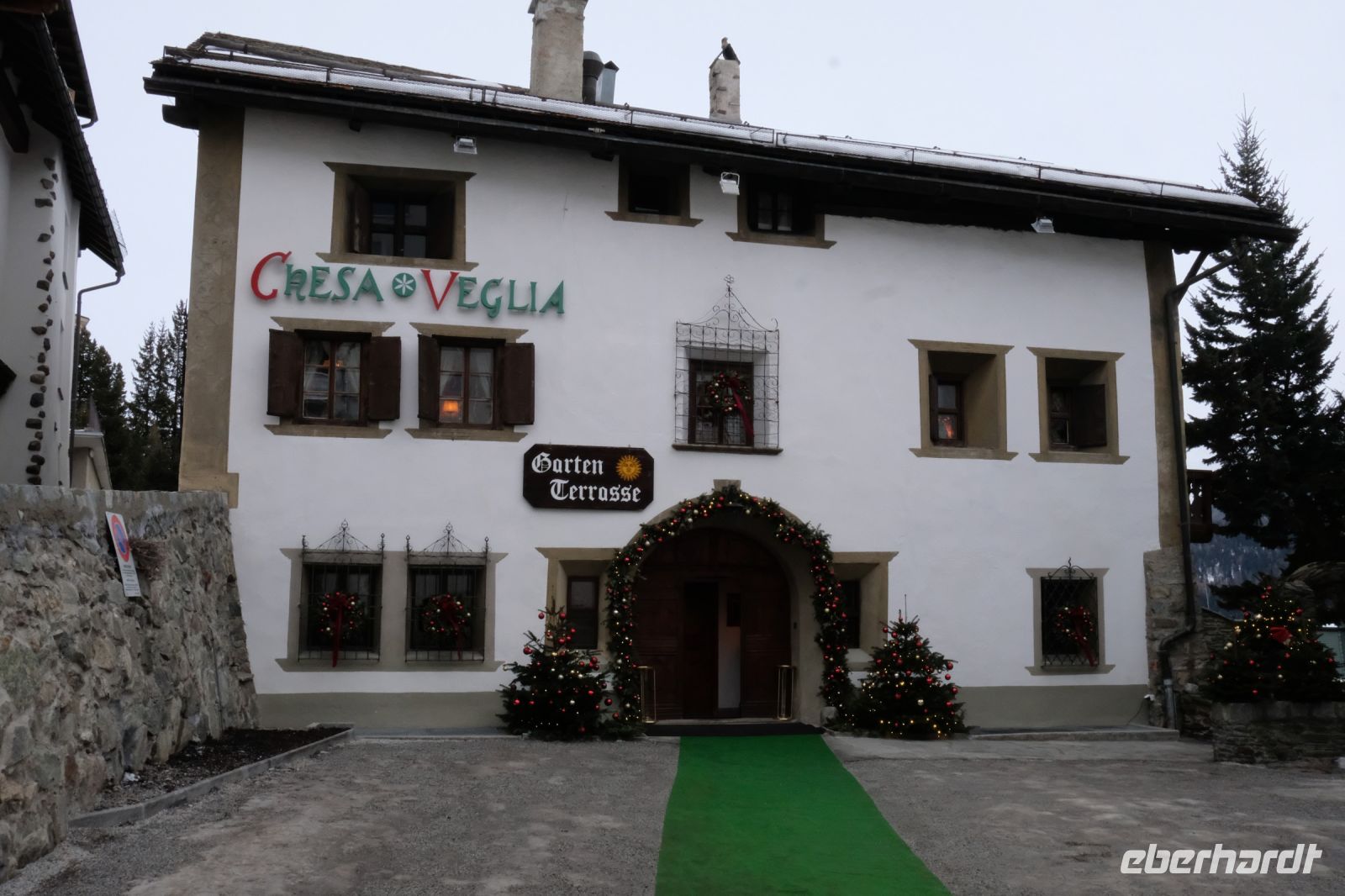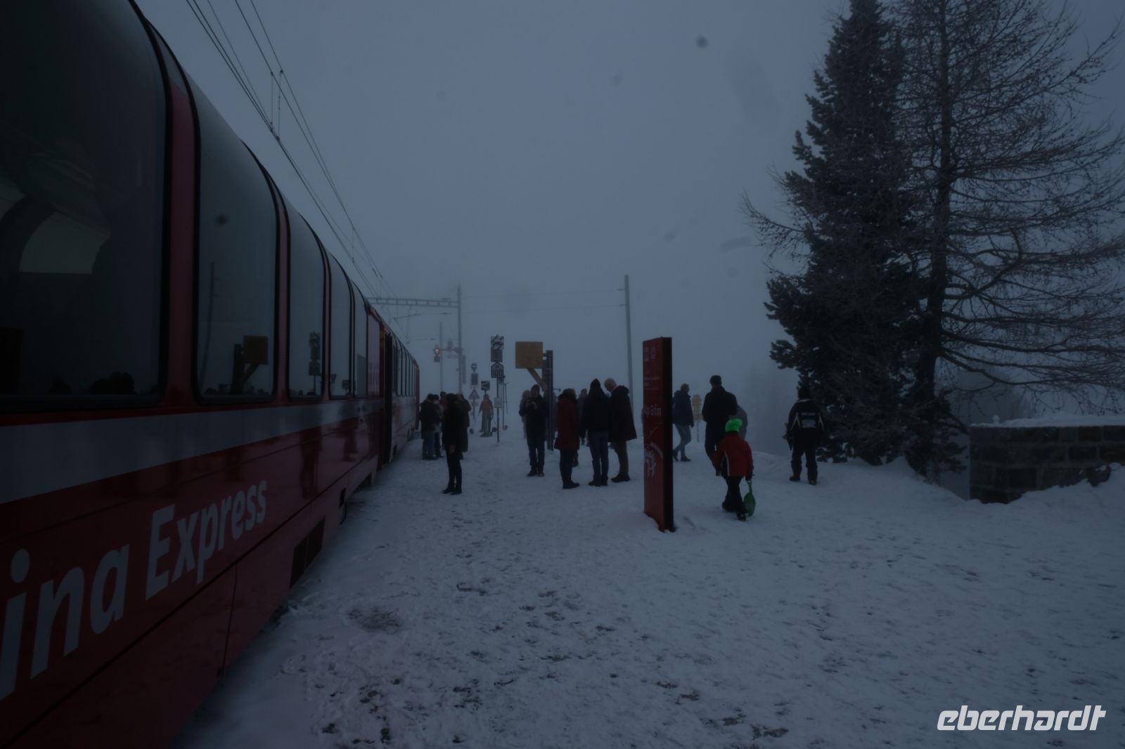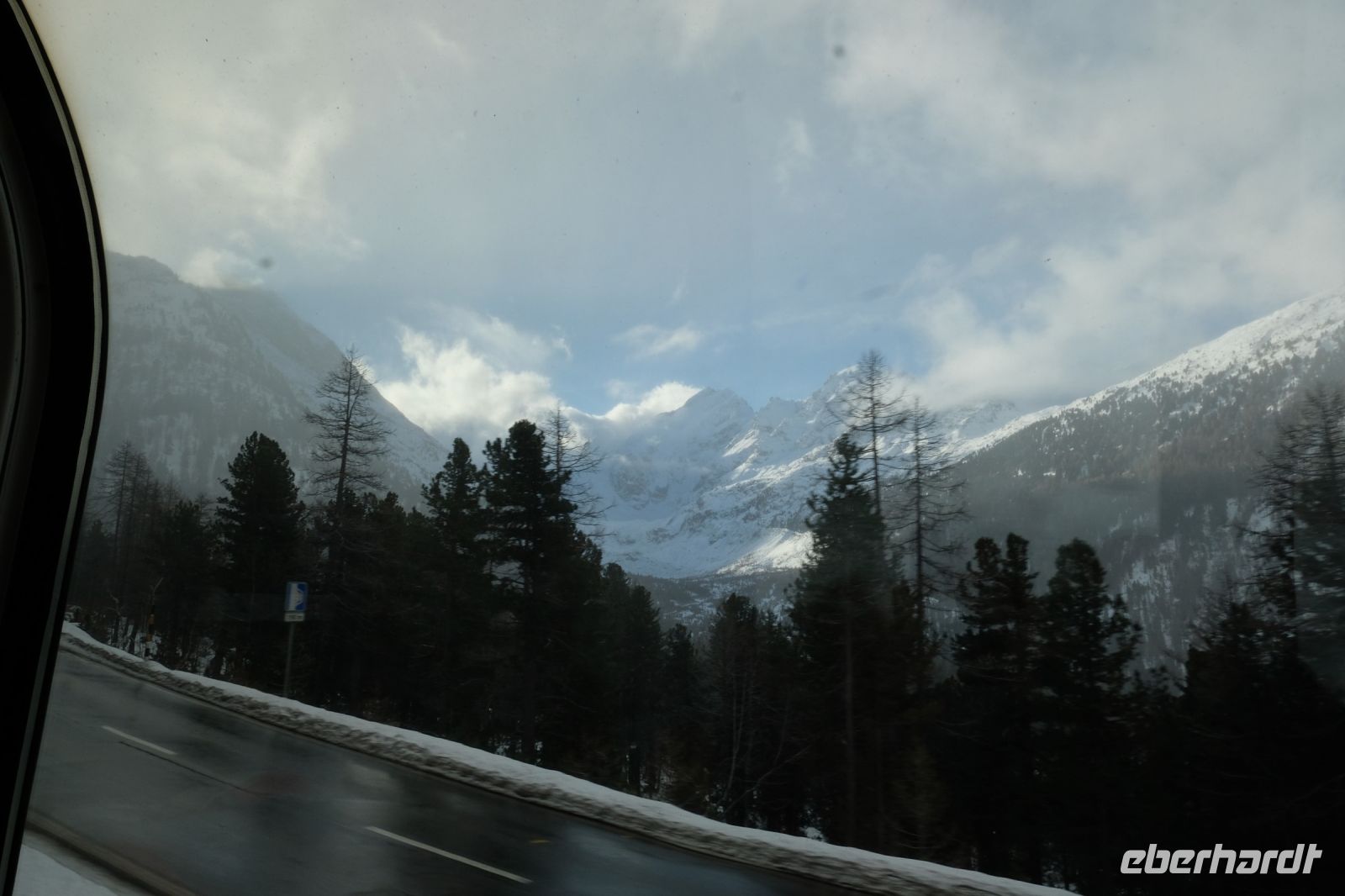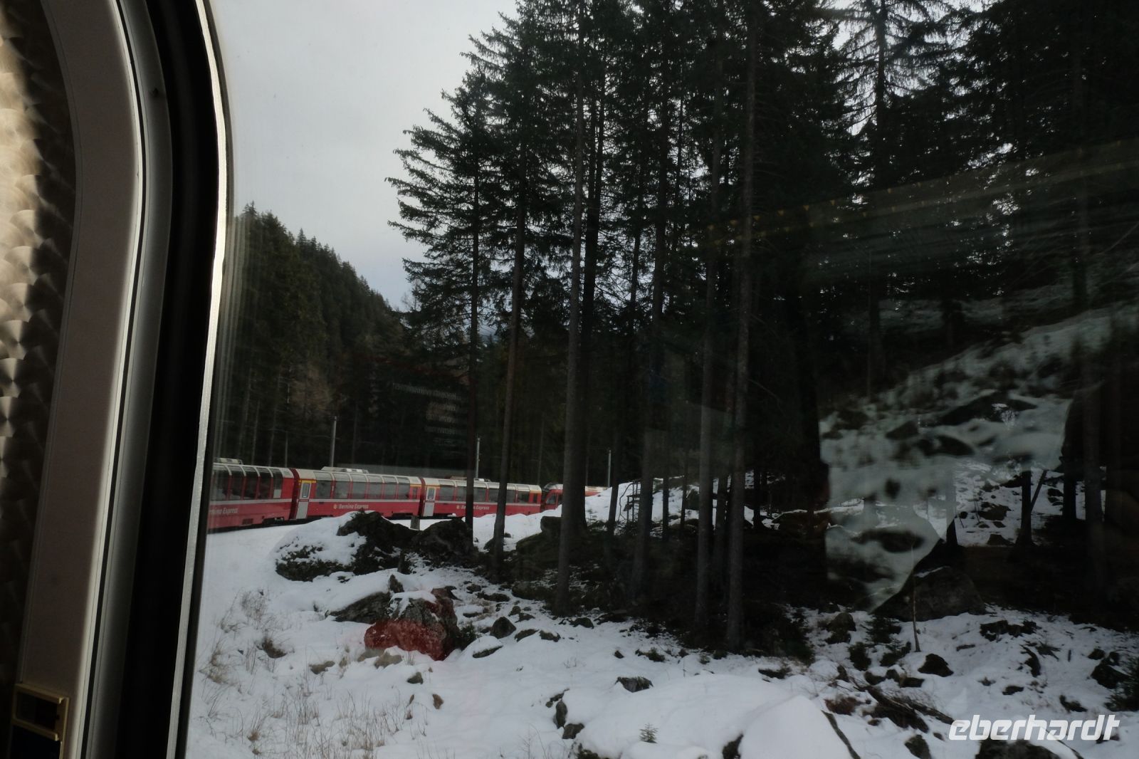 Nach dem Frühstück unternahmen wir einen kleinen Spaziergang zum nahegelegenen Bahnhof Tiefencastel. Dort angekommen fuhren wir mit dem Bernina-Express die legendäre Bahnstrecke bis zum Endpunkt in Tirano. Vorbei an Pontresina, dem immer kleiner werdenden Morteratschgletscher erreichten wir Alp Grüm. Hier hielt der Bernina Express länger und wir hatten Gelegenheit, auszusteigen und zu fotografieren. Leider war der Nebel hier oben so stark, sodass wir nichts sahen. Danach ging es wieder bergab, und der Nebel verzog sich. Am Kreisviadukt in Brusio erlebten wir die hohe Kunst der Eisenbahntechnik, denn hier ermöglicht das angelegte Viadukt eine künstliche Streckenausweitung auf engsten Raum, damit die Bahn den Höhenunterschied meistern kann. Schnell ging es über die schweizerisch-italienische Grenze und kurz danach erreichten wir Tirano. Leider lädt dieser Ort im Winter nicht zum Verweilen ein. Unser Busfahrer Daniel wartete bereits, und so konnten wir sofort in Richtung St. Moritz zurückfahren. Der Nebel nahm wieder zu und so hatten wir auf dem Bernina-Pass zwar keine Sicht, aber der Bordservice kam zum Einsatz. In St Moritz konnten wir uns 2 Stunden Zeit nehmen um den Ort ein wenig kennenzulernen. So kurz vor Silvester waren die Einkaufsstraßen und die Cafes gut gefüllt. Die Weihnachtsdekoration war in der Abendstimmung besonders zu genießen. Zurück über der Julierpass, ging die Fahrt zum Hotel. Zum Abendessen wurde uns wieder ein vorzügliches 4-Gang-Menü von freundlichen Mitarbeitern gereicht, was den gelungenen Tag abrundete.