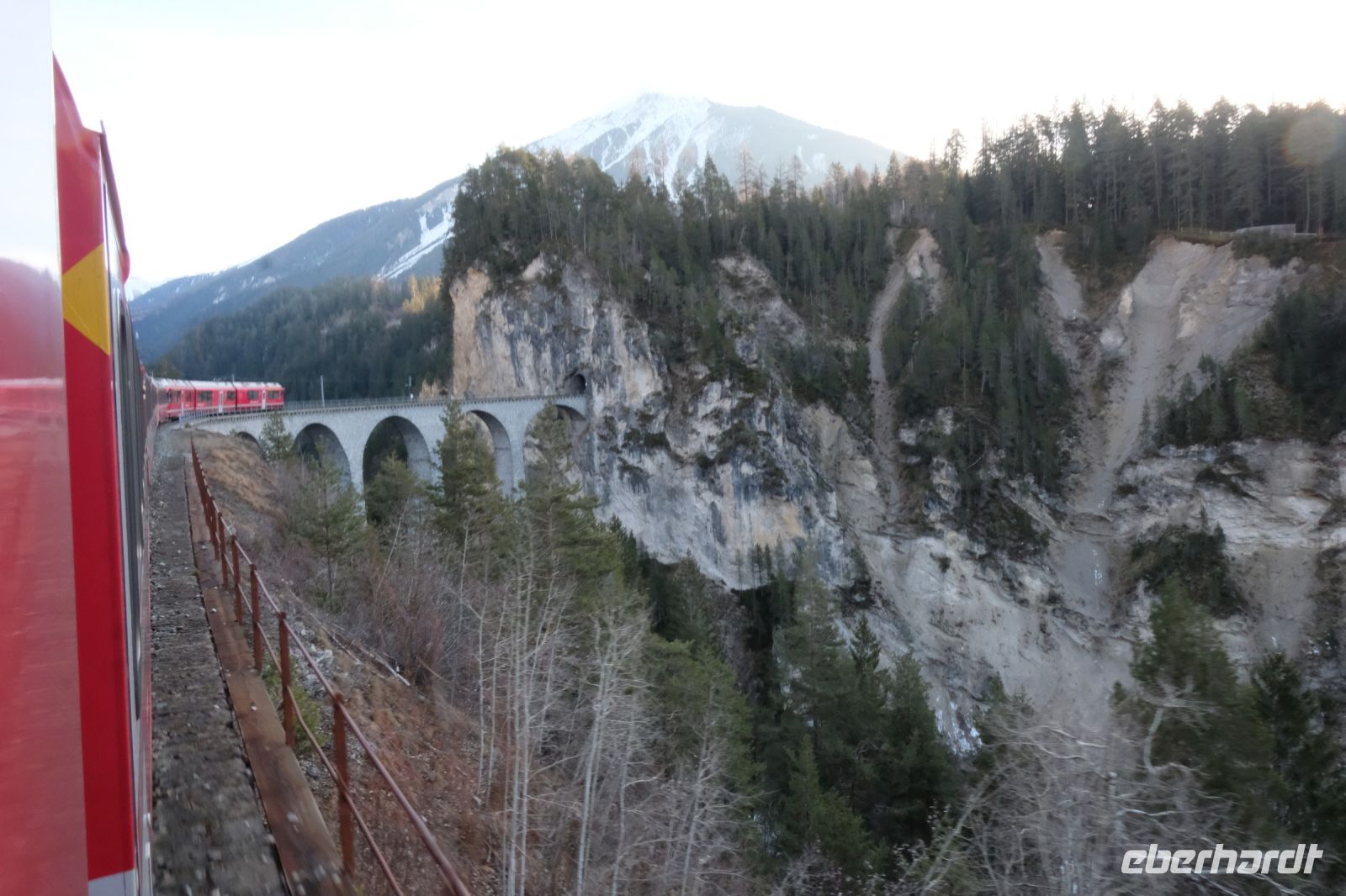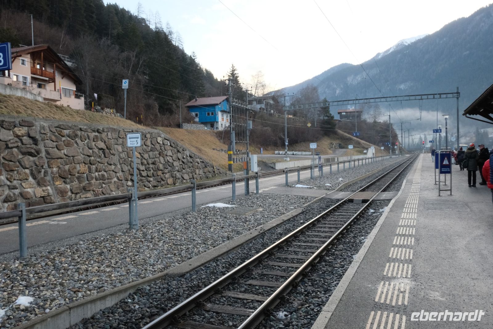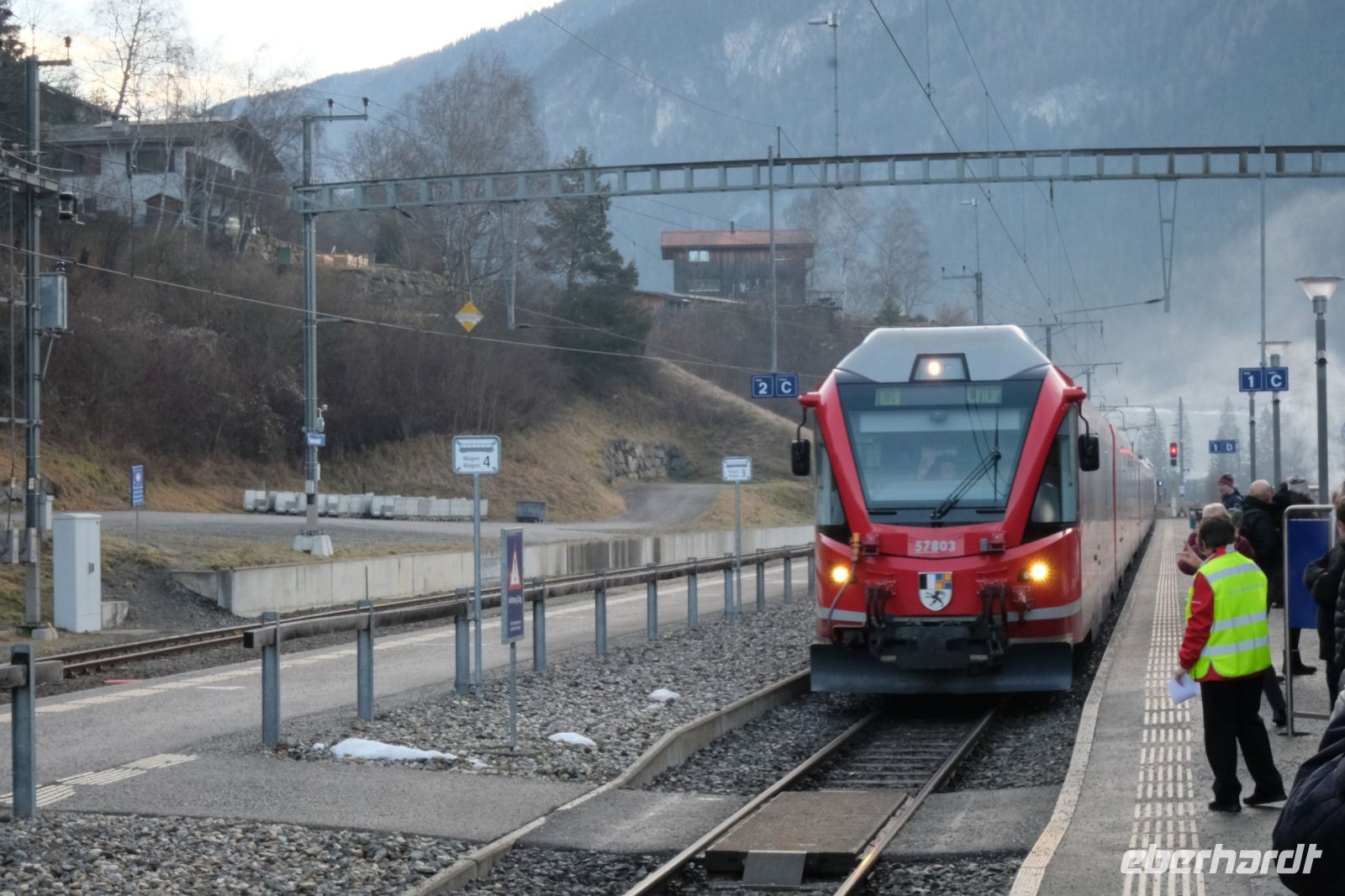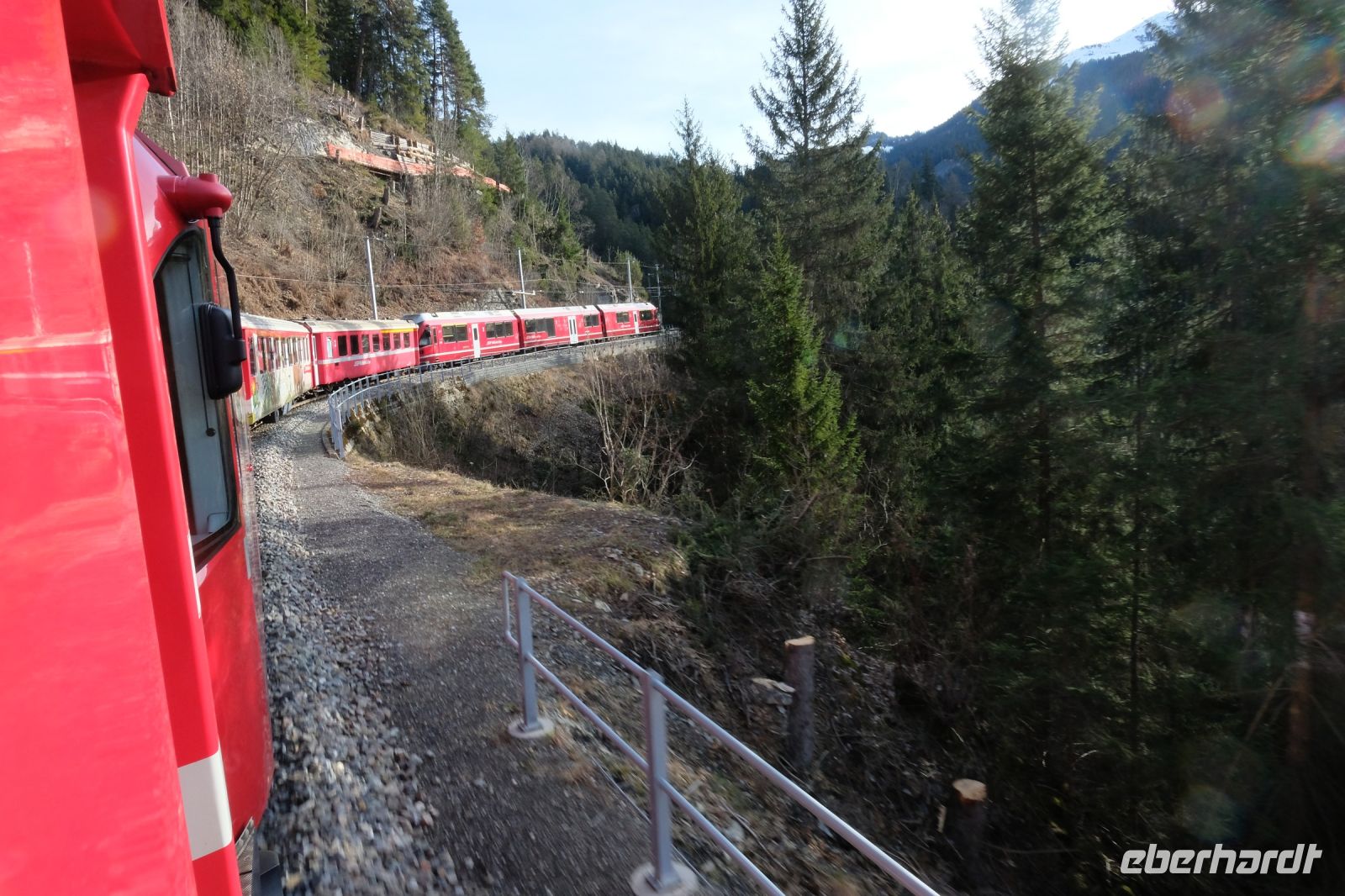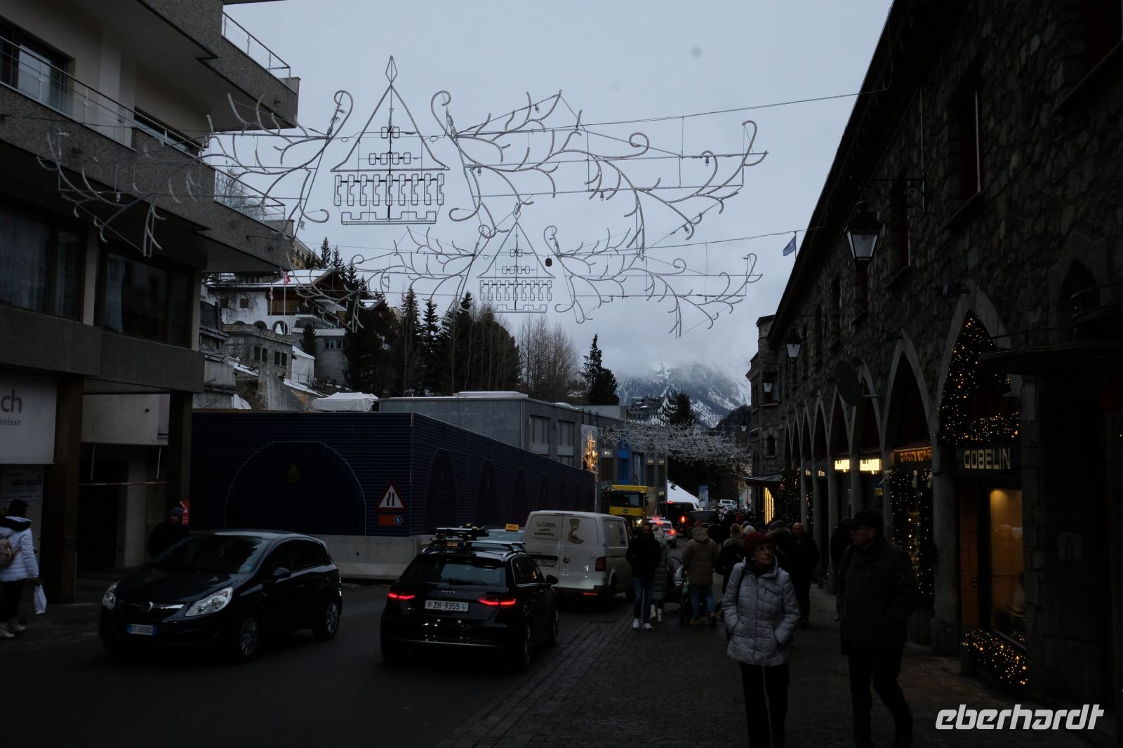 Nach dem Frühstück unternahmen wir einen kleinen Spaziergang zum nahegelegenen Bahnhof Tiefencastel. Dort angekommen fuhren wir mit dem Bernina-Express die legendäre Bahnstrecke bis zum Endpunkt in Tirano. Vorbei an Pontresina, dem immer kleiner werdenden Morteratschgletscher erreichten wir Alp Grüm. Hier hielt der Bernina Express länger und wir hatten Gelegenheit, auszusteigen und zu fotografieren. Leider war der Nebel hier oben so stark, sodass wir nichts sahen. Danach ging es wieder bergab, und der Nebel verzog sich. Am Kreisviadukt in Brusio erlebten wir die hohe Kunst der Eisenbahntechnik, denn hier ermöglicht das angelegte Viadukt eine künstliche Streckenausweitung auf engsten Raum, damit die Bahn den Höhenunterschied meistern kann. Schnell ging es über die schweizerisch-italienische Grenze und kurz danach erreichten wir Tirano. Leider lädt dieser Ort im Winter nicht zum Verweilen ein. Unser Busfahrer Daniel wartete bereits, und so konnten wir sofort in Richtung St. Moritz zurückfahren. Der Nebel nahm wieder zu und so hatten wir auf dem Bernina-Pass zwar keine Sicht, aber der Bordservice kam zum Einsatz. In St Moritz konnten wir uns 2 Stunden Zeit nehmen um den Ort ein wenig kennenzulernen. So kurz vor Silvester waren die Einkaufsstraßen und die Cafes gut gefüllt. Die Weihnachtsdekoration war in der Abendstimmung besonders zu genießen. Zurück über der Julierpass, ging die Fahrt zum Hotel. Zum Abendessen wurde uns wieder ein vorzügliches 4-Gang-Menü von freundlichen Mitarbeitern gereicht, was den gelungenen Tag abrundete.