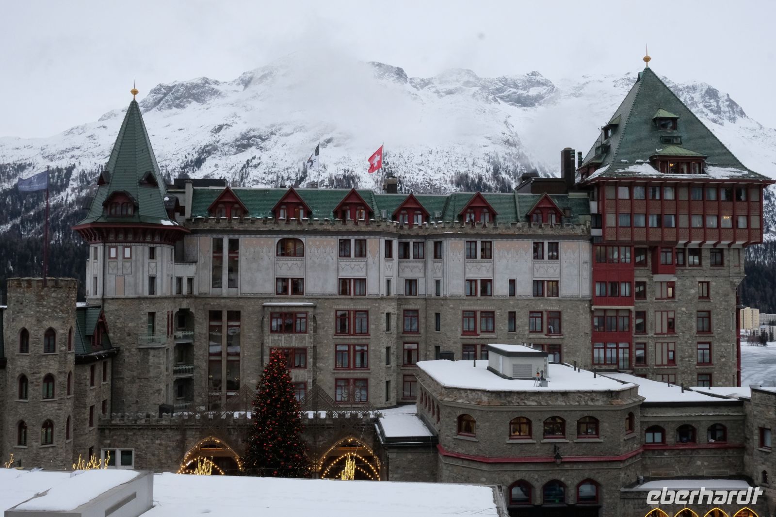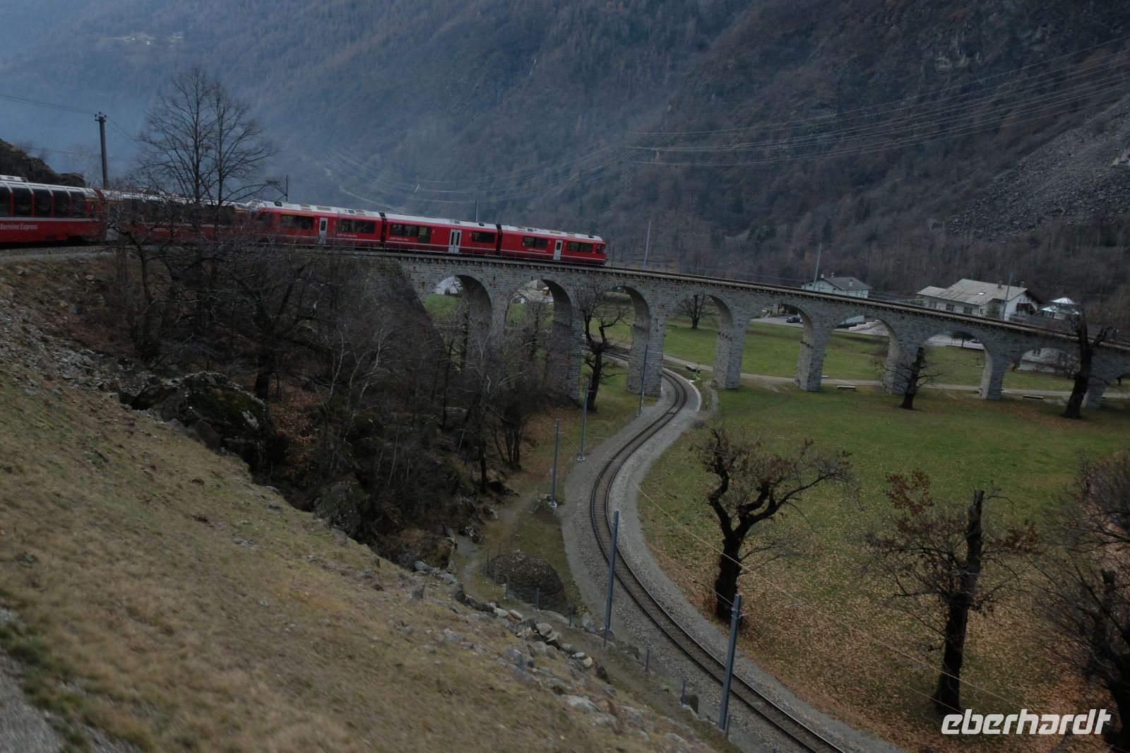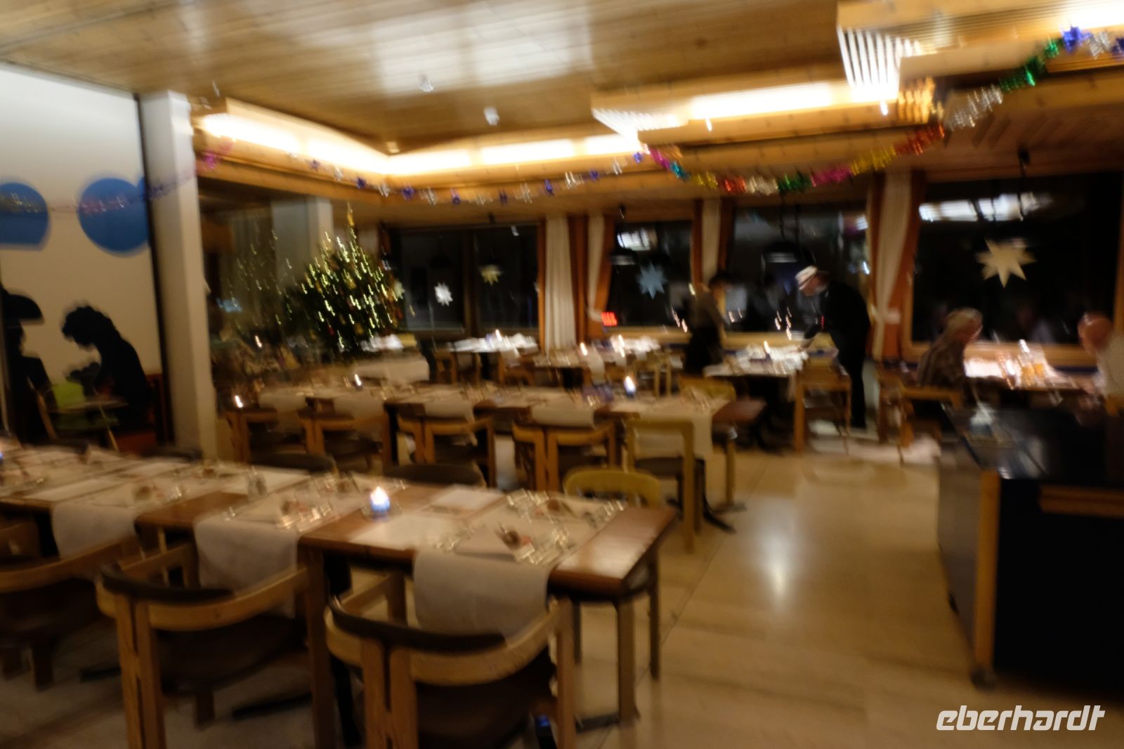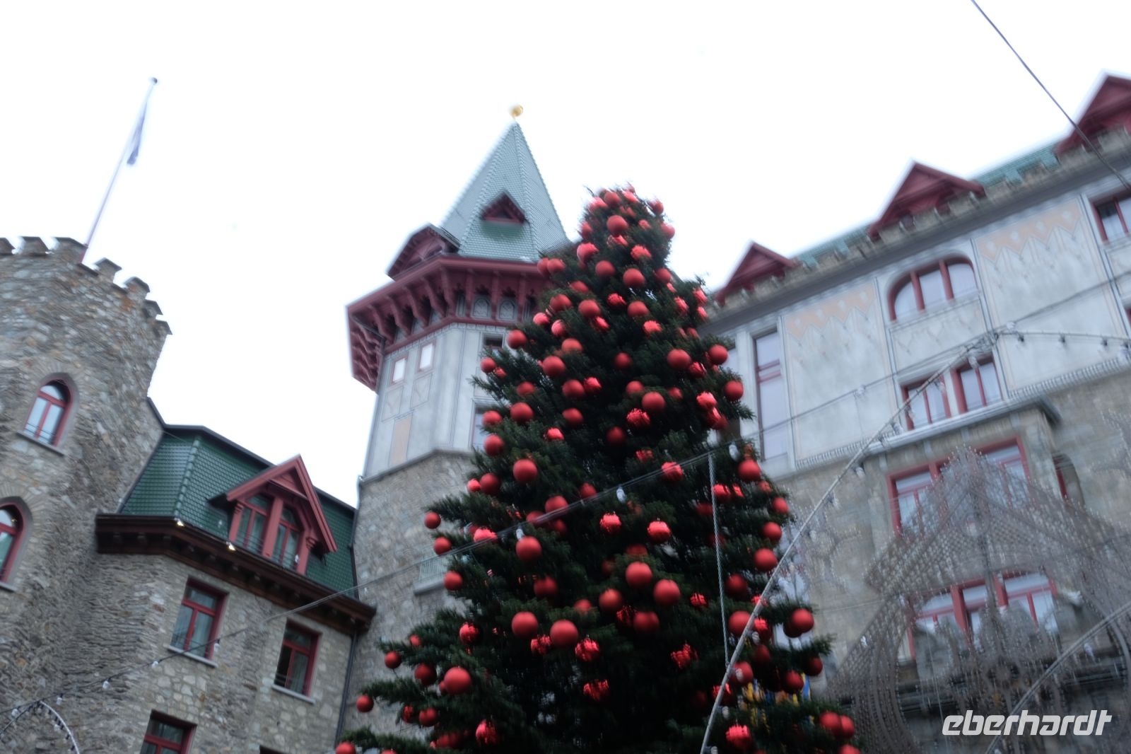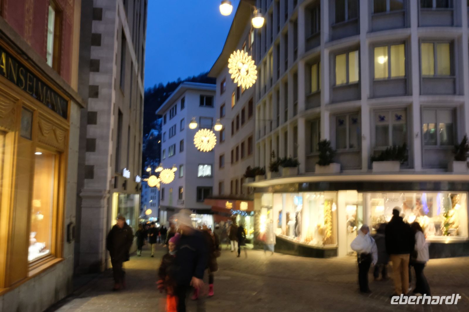 Nach dem Frühstück unternahmen wir einen kleinen Spaziergang zum nahegelegenen Bahnhof Tiefencastel. Dort angekommen fuhren wir mit dem Bernina-Express die legendäre Bahnstrecke bis zum Endpunkt in Tirano. Vorbei an Pontresina, dem immer kleiner werdenden Morteratschgletscher erreichten wir Alp Grüm. Hier hielt der Bernina Express länger und wir hatten Gelegenheit, auszusteigen und zu fotografieren. Leider war der Nebel hier oben so stark, sodass wir nichts sahen. Danach ging es wieder bergab, und der Nebel verzog sich. Am Kreisviadukt in Brusio erlebten wir die hohe Kunst der Eisenbahntechnik, denn hier ermöglicht das angelegte Viadukt eine künstliche Streckenausweitung auf engsten Raum, damit die Bahn den Höhenunterschied meistern kann. Schnell ging es über die schweizerisch-italienische Grenze und kurz danach erreichten wir Tirano. Leider lädt dieser Ort im Winter nicht zum Verweilen ein. Unser Busfahrer Daniel wartete bereits, und so konnten wir sofort in Richtung St. Moritz zurückfahren. Der Nebel nahm wieder zu und so hatten wir auf dem Bernina-Pass zwar keine Sicht, aber der Bordservice kam zum Einsatz. In St Moritz konnten wir uns 2 Stunden Zeit nehmen um den Ort ein wenig kennenzulernen. So kurz vor Silvester waren die Einkaufsstraßen und die Cafes gut gefüllt. Die Weihnachtsdekoration war in der Abendstimmung besonders zu genießen. Zurück über der Julierpass, ging die Fahrt zum Hotel. Zum Abendessen wurde uns wieder ein vorzügliches 4-Gang-Menü von freundlichen Mitarbeitern gereicht, was den gelungenen Tag abrundete.