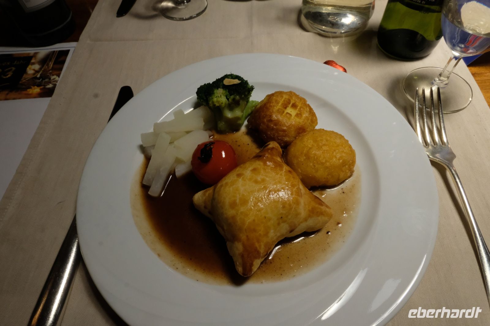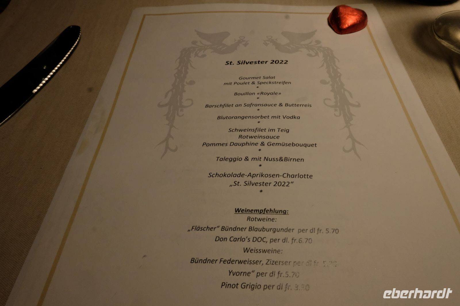 Nach einem ausgiebigen Frühstück fuhren wir nach Chur. 2 Stadtführer erwarteten uns zu einem 90 minütigem Stadtrundgang. Interessantes und Wissenswertes mit einer Brise Humor vermischt, vermittelten sie uns über ihre Stadt. Schließlich ist es die älteste Stadt der Schweiz. Anschließend fuhren wir auf den Spuren des Glacier-Express nach Disentis. Vor allem die Durchfahrt durch die Rheinschlucht war für alle ein wichtiges Fotomotiv. In Disentis angekommen erwartete uns schon unser Bus, und Daniel hatte den Bordservice schon vorbereitet. Einige Gäste besuchten noch das ehrwürdige Kloster. Die Benediktinerabtei wurde um das Jahr 700 gegründet und trägt den Namen des Heiligen Martin und präsentiert sich heute im baulichen Zustand des späten 17. Jahrhunderts. Dank seines Gymnasiums ist das Kloster noch heute eine wichtige Bildungsstätte der Region. Besonders beeindruckt zeigten sich viele Gäste von der Klosterkirche. Anschließend ging die Fahrt mit unserem Bus über Laax und Flims zurück zum Hotel. Vorher machten wir noch einen kurzen Fotostopp am Soliser Viadukt. Bevor die Silvestervorbereitungen begannen war für unsere Gäste noch die Möglichkeit für eine Tasse Kaffee mit selbst zubereitetem Kuchen, es war lecker. 19.15 Uhr begann die Silvesterfeier an festlich eingedeckten Tischen. Wir wurden mit einem 7-Gänge-Menü überrascht. Die Speisenfolge zog sich bis 23.30 Uhr sodass keine lange Weile aufkam. Begleitet wurden wir von einem Alleinunterhalter, der für viel Stimmung sorgte. Pünktlich 24.00 Uhr konnten wir mit einem Glas Sekt auf unsere Gesundheit, Frieden und immer wieder schöne Reisen anstoßen.
