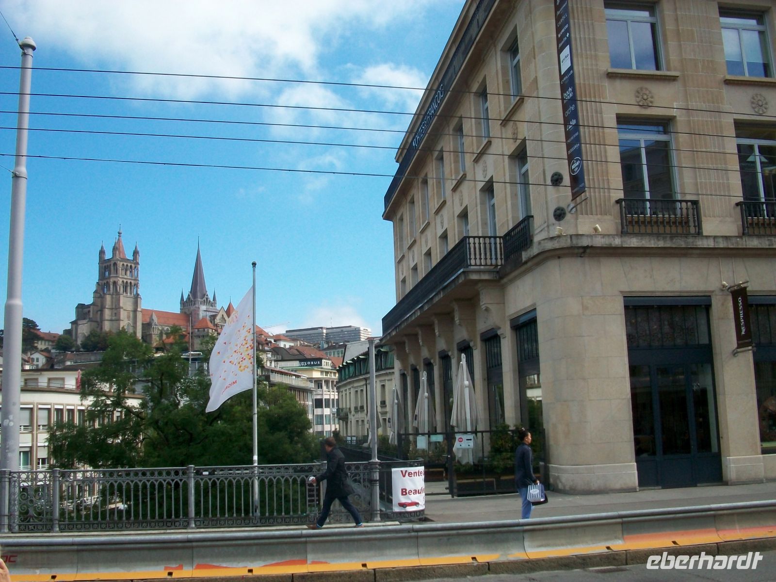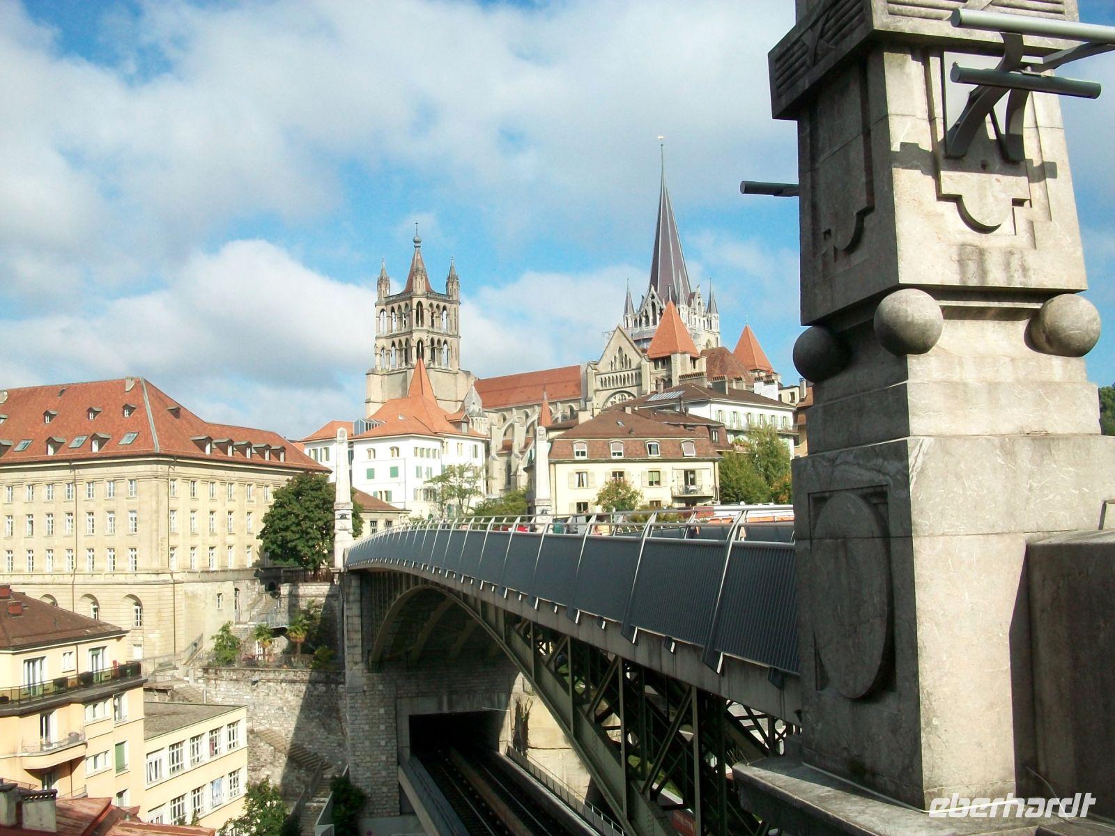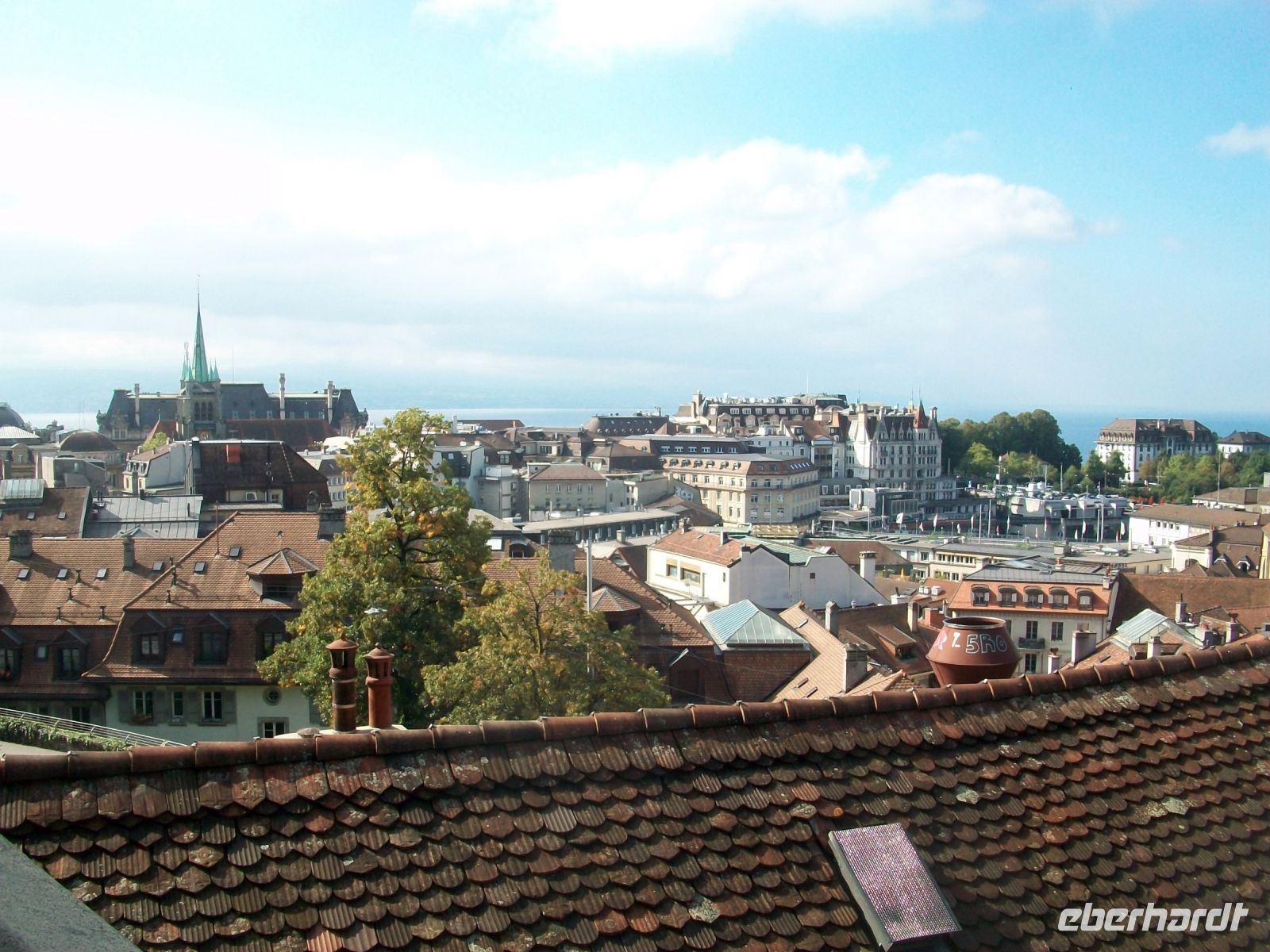 Ab Zweisimmen geht es auf Schmalspur weiter; wir haben hier in einem bequemen Panoramawagen des „Golden Pass“ platzgenommen und mit ihm gelangen wir immer weiter westlich. Bald künden uns die französischsprachigen Schilder an, dass wir über die Sprachgrenze gekommen sind und nach einiger Zeit sehen wir von oben die mächtige Wasserfläche des Genfer Sees vor uns, leider im Dunst, liegen. Ein letzter Umstieg in Montreux – dann bringt uns der Zug unserem heutige Ziel entgegen, dem schönen Ort Lausanne; am morgigen Tag werden wir hier auf Erkundungen gehen.