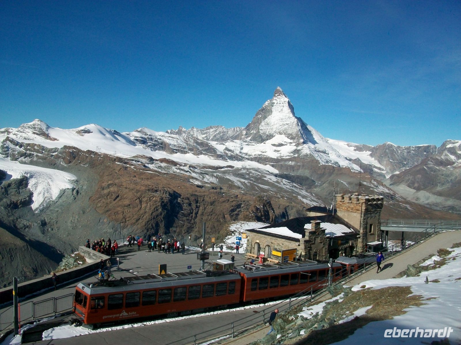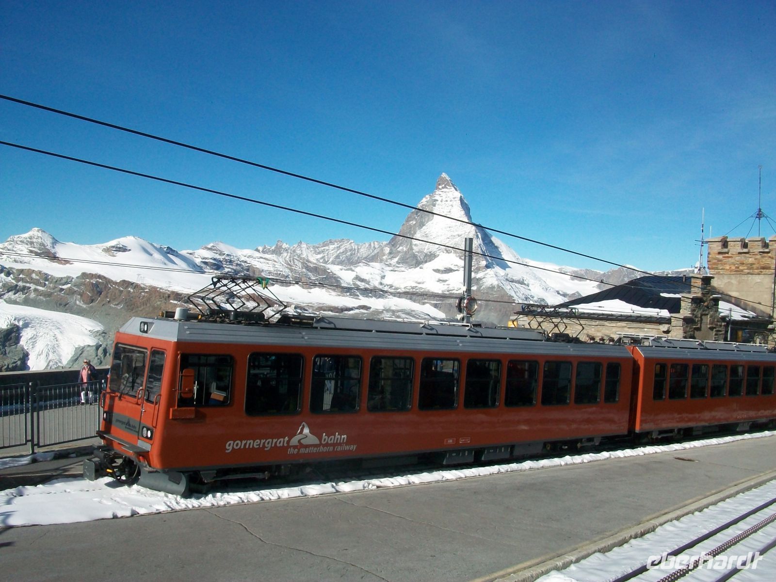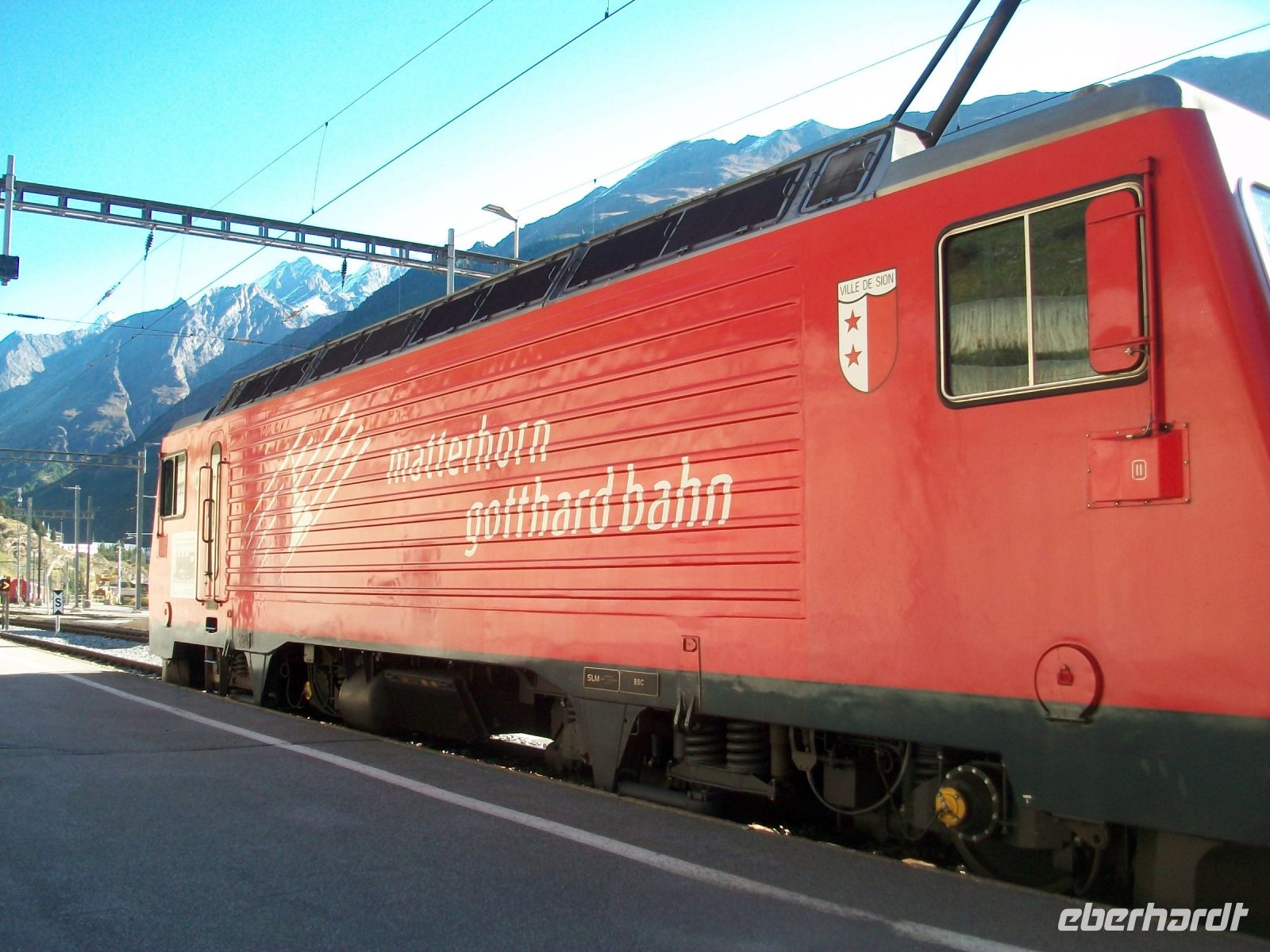 Am Nachmittag verlassen wir die schöne Stadt; der Zug trägt uns entlang des Sees dem Wallis zu, dieser Kanton wird nun unser Ziel sein. Weinberge zeugen hier im Tal, welches vom Fluss Rhone durchflossen wird, vom edlen Tropfen der hier gezogen wird. Den Weinanbau sehen wir bis wir den Ort Visp erreichen; hier wechseln wir den Zug um, wieder auf schmaler Spur, hinauf nach Zermatt zu gelangen. Nur wenige Kilometer im schroffen Tal unterwegs und schon zeigen sich im Hintergrund die in der Nachmittagssonne im ewigen Eis strahlenden 4 000er. Das macht Vorfreude auf den morgigen Tag; Endstation für heute ist der Kopfbahnhof von Zermatt, wenige Meter in Richtung Zentrum – und wir werden vom Berg der Berge, dem Matterhorn begrüßt. Mit dieser unbeschreiblichen Impression lassen wir den Tag langsam ausklingen.