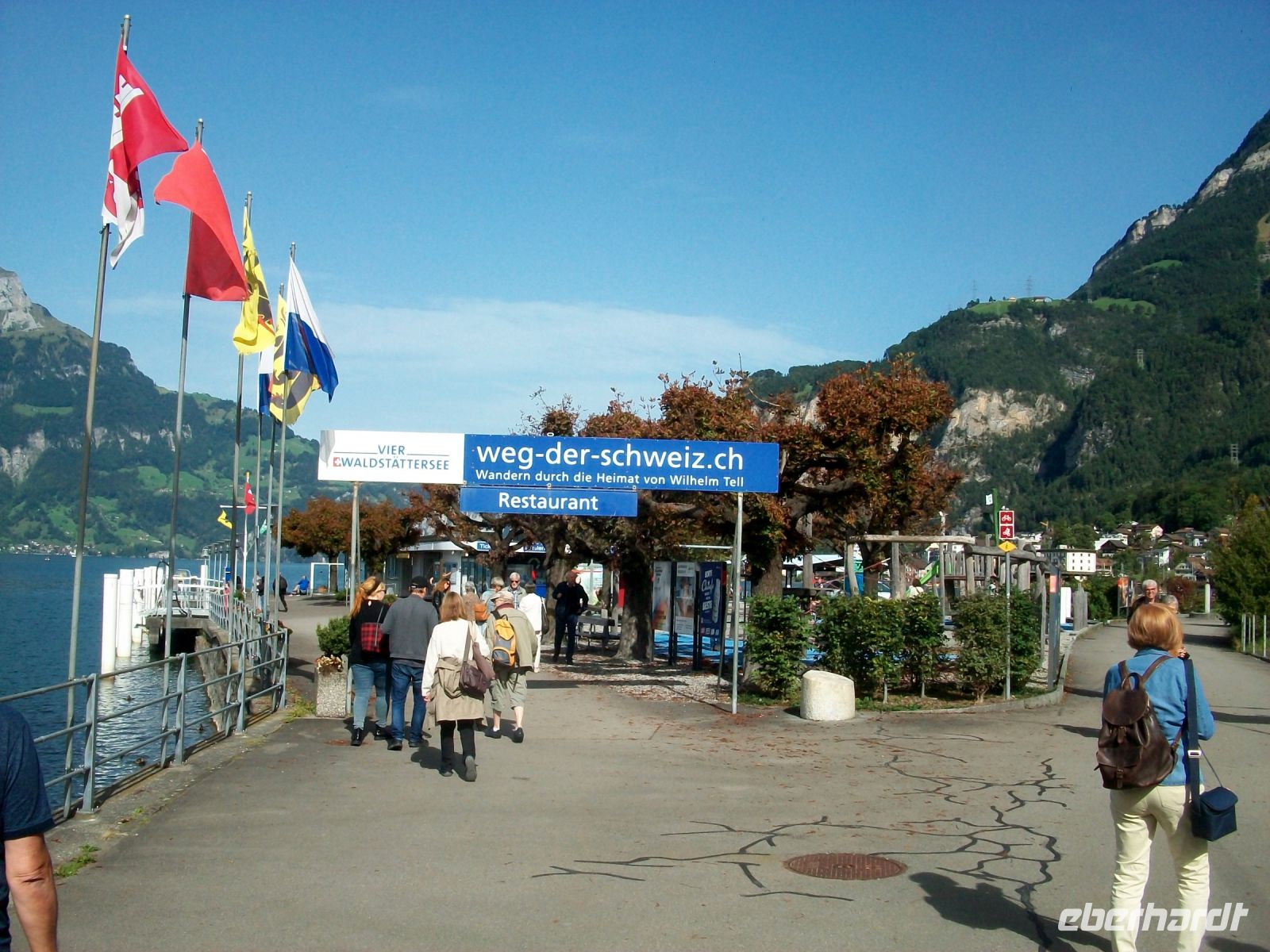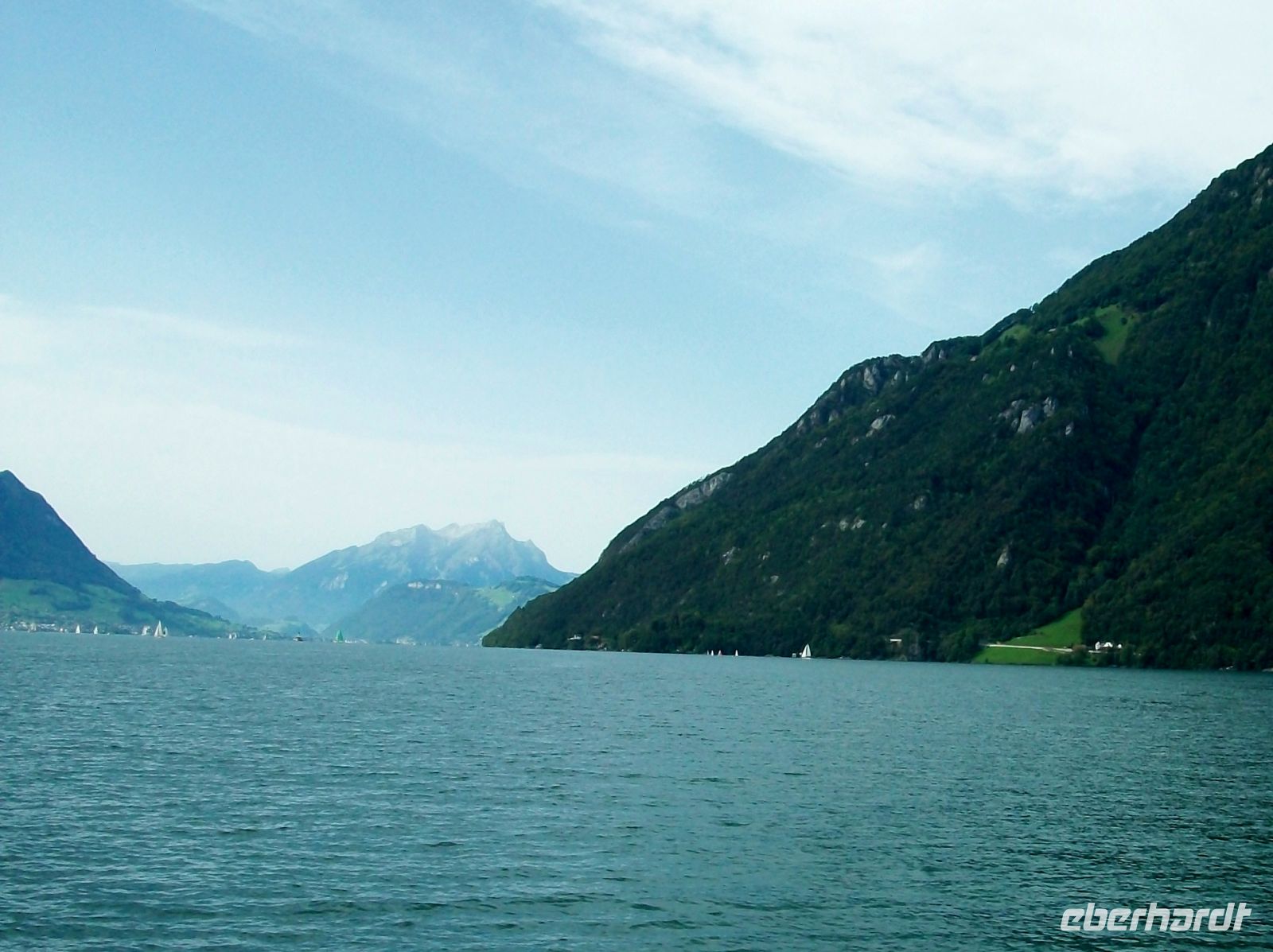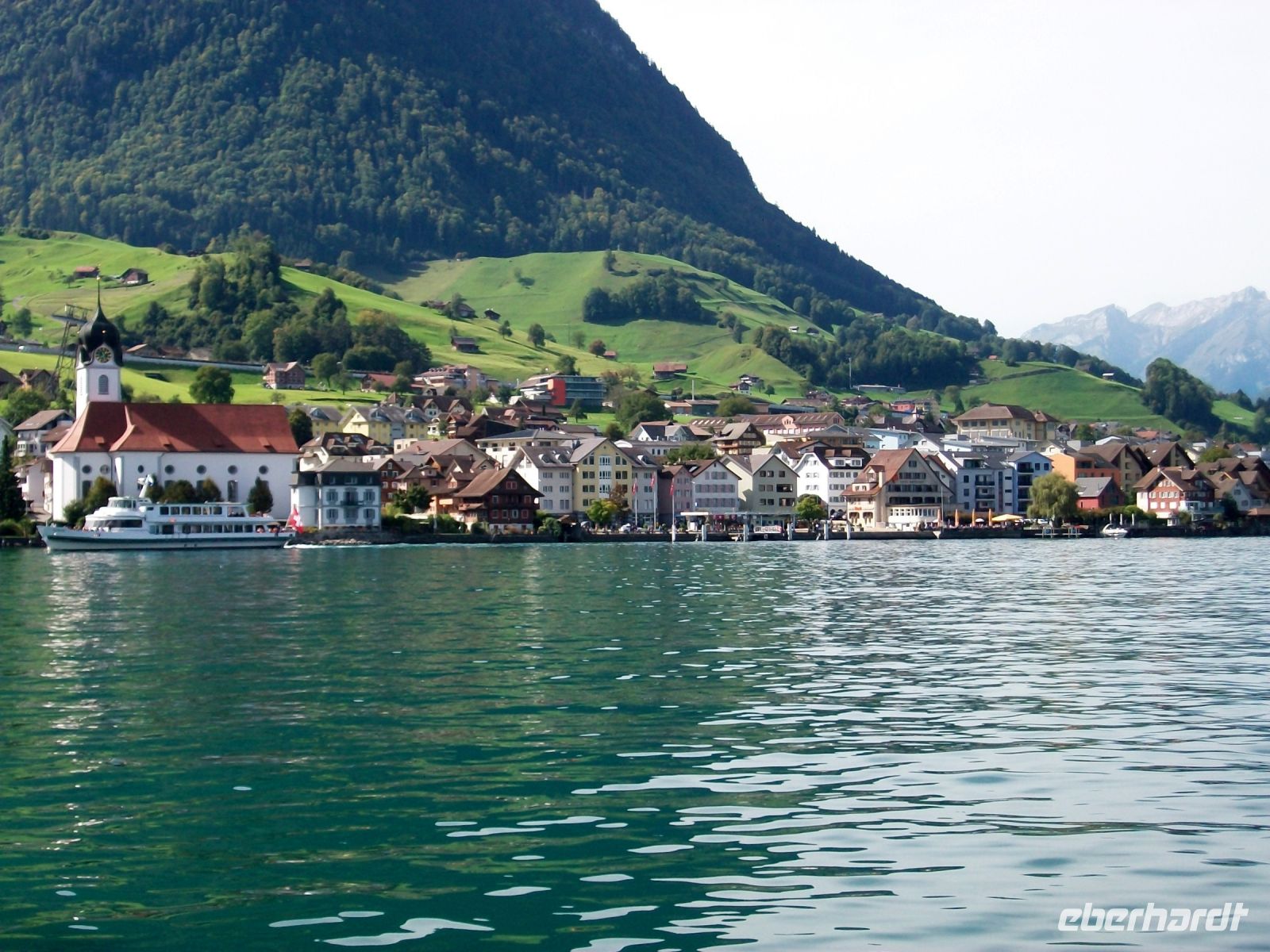 Viel zu schnell endet die Zugfahrt im kleine Ort Flüelen; hier, direkt an den Ufern des Vierwaldstätter Sees, wird nun unsere Schiffsreise beginnen, und das ist noch einmal ein ganz großer Höhepunkt! Bald haben wir an Bord Platz genommen und können vom See aus all die schönen Ecken voll genießen. Vorbei an Tellskapelle und Schillerstein nehmen wir Kurs auf Luzern; nach einer Biegung sehen wir den Pilatus der mit seinem gezackten Rücken schon an dieser Stelle den Blick dominiert. Immer wieder legt das Schiff an malerischen Orten an die von der Nachmittagasonne beschienen werden. Dabei lernen wir unter anderem Gersau, Vitznau auch Weggis im Vorüberfahren kennen – alles klingende Namen am Vierwaldstätter See.