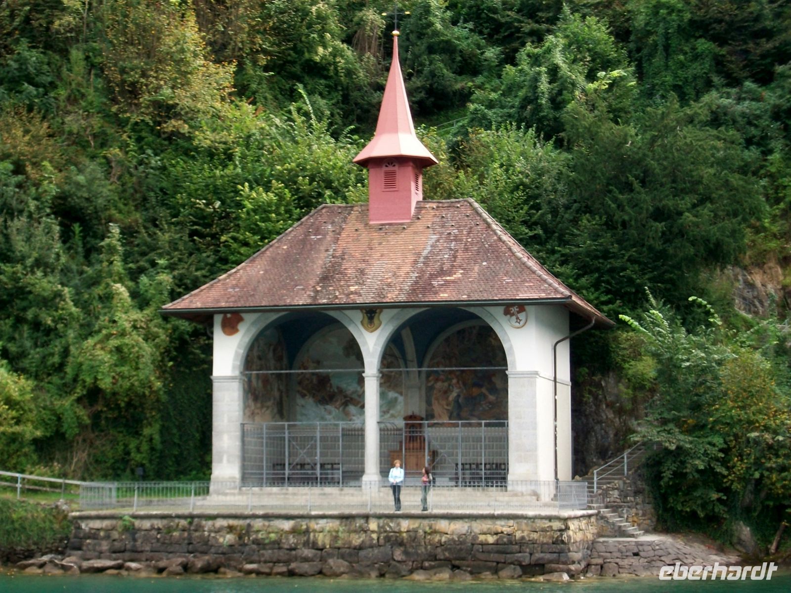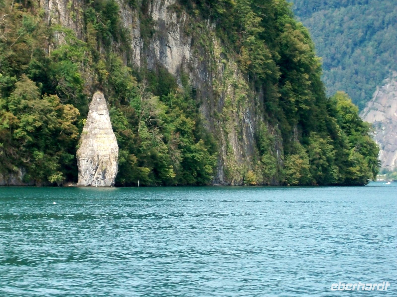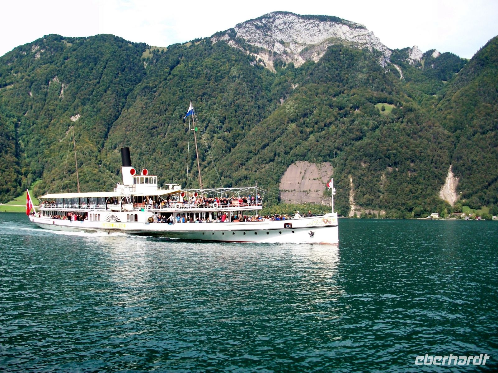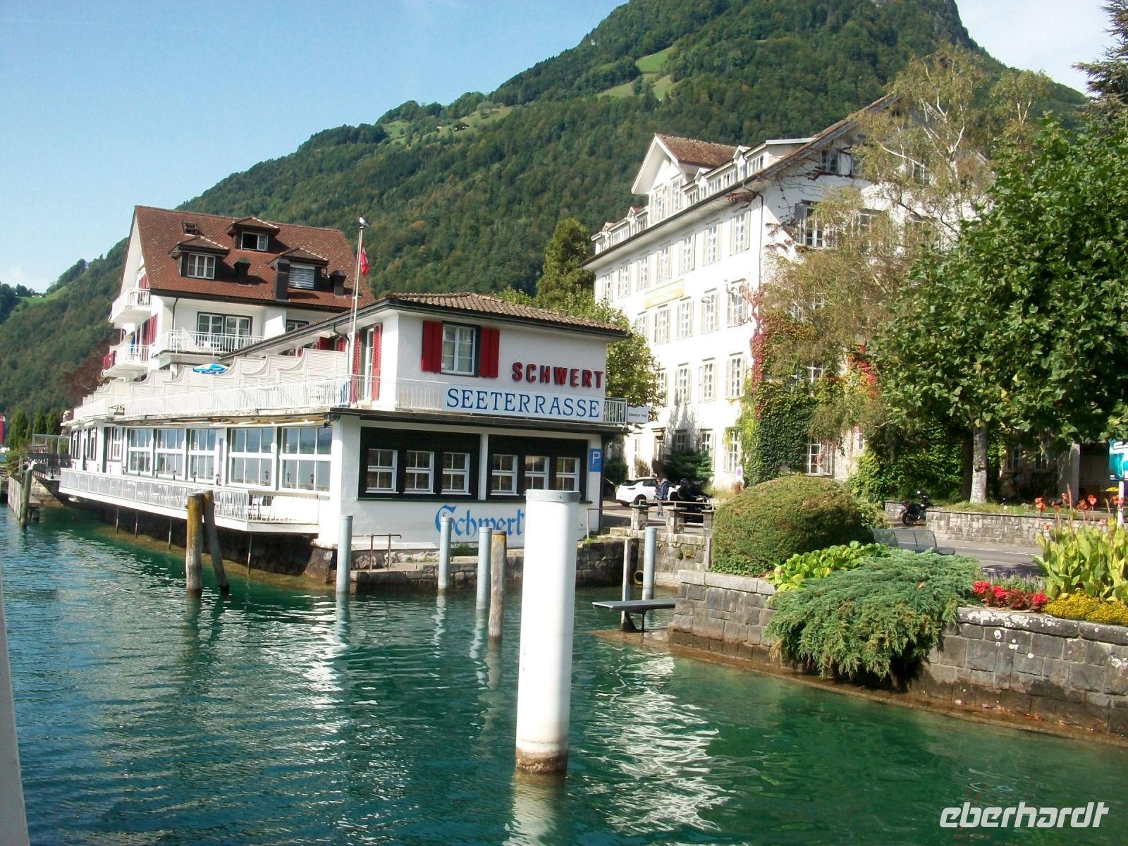 Viel zu schnell endet die Zugfahrt im kleine Ort Flüelen; hier, direkt an den Ufern des Vierwaldstätter Sees, wird nun unsere Schiffsreise beginnen, und das ist noch einmal ein ganz großer Höhepunkt! Bald haben wir an Bord Platz genommen und können vom See aus all die schönen Ecken voll genießen. Vorbei an Tellskapelle und Schillerstein nehmen wir Kurs auf Luzern; nach einer Biegung sehen wir den Pilatus der mit seinem gezackten Rücken schon an dieser Stelle den Blick dominiert. Immer wieder legt das Schiff an malerischen Orten an die von der Nachmittagasonne beschienen werden. Dabei lernen wir unter anderem Gersau, Vitznau auch Weggis im Vorüberfahren kennen – alles klingende Namen am Vierwaldstätter See.