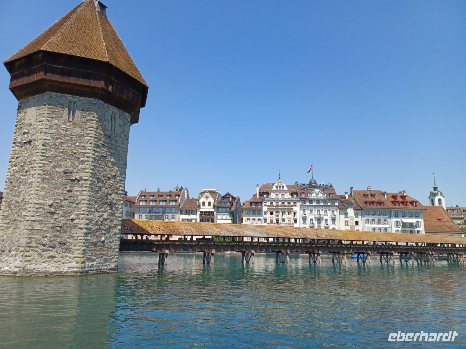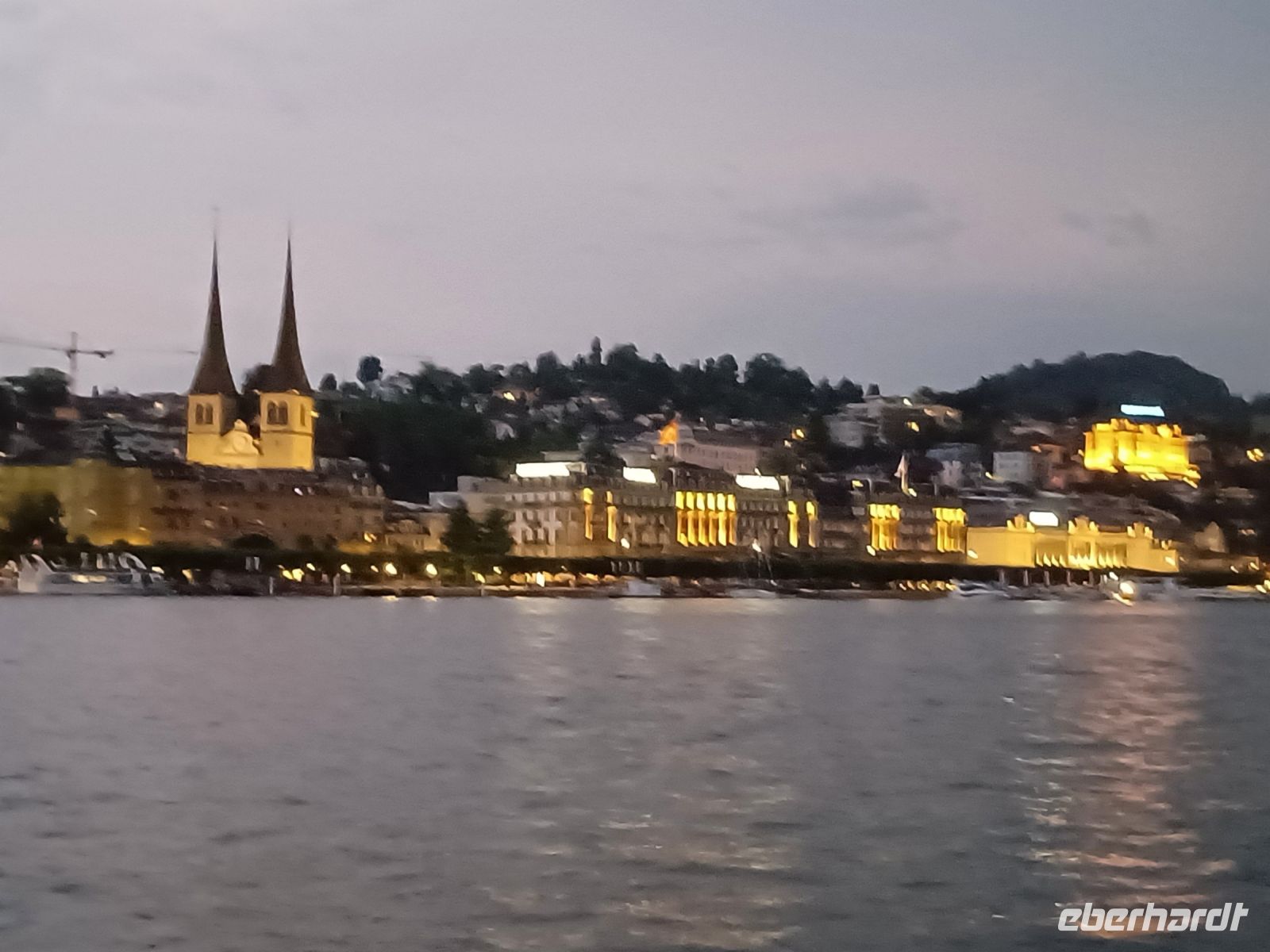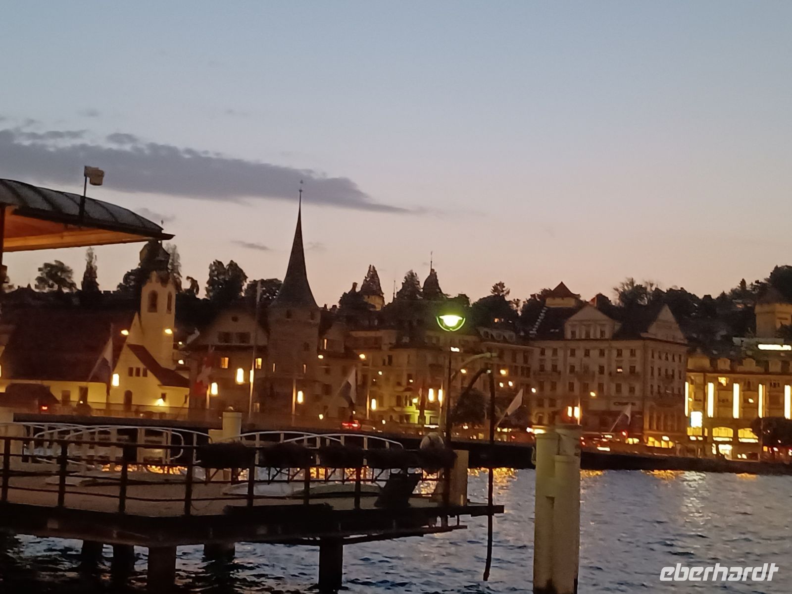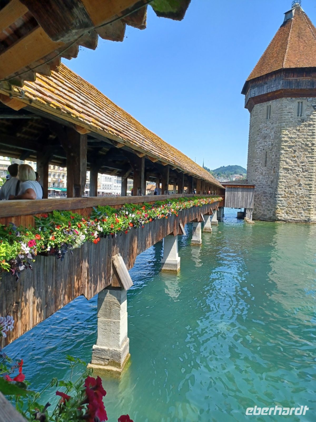 125 km legen wir bis Luzern zurück, wo uns nach der Ankunft unsere Stadtführerin am alten Bahnhofstor empfängt. Wir stimmen uns bei über 30 Grad auf einen zweistündigen Stadtspaziergang ein. Frau Rita leitet uns mit Bedacht zu überschatteten Standorten. Die überdachten Holzbrücken, die Kappelbrücke, die Spreuerbrücke wurden als Wehrgang über die Reuss gebaut u. verbinden die Neustadt mit der Altstadt. Die Bilderzyklen unter den Dächern geben dem Passanten einen Einblick in die luzerner u. eidgenössische Geschichte; sie vermitteln Lebensweisheiten u. Alltagsregeln. Im Innenraum der katholischen Franziskanerkirche erholen wir uns von der Hitze bevor wir in die Altstadt hinübergehen. Die Altstadt ist ein Kleinod an verzierten u. bemalten Häuser. Dicht an dicht reihen sich traditionelle kleine Hotels- jedes Gebäude ein Unikat. Wir schlängeln uns durch Schaufenstergassen bis zu unserem Hotel u. sind von der Stadt sehr beeindruckt. In der Hotellobby werden wir mit gekühltem Orangenwasser empfangen, die Koffer sind dankenswerter Weise bereits auf die Zimmer gebracht worden. So erholt sich jeder auf seine Weise bis zum Abendessen. Für den Abend empfiehlt die Reiseleitung eine Fährfahrt mit dem Motorschiff Bürgenstock auf dem Vierwaldstättersee nach Kehrsiten-Bürgenstock (hin- u. zurück 1 h). Wer mag kann mit der Bürgenstockbahn zum Resort hochfahren. Der Swiss Bahnpass includiert diese Fährfahrt. Wir begeben uns mit 10 Teilnehmern auf die Abendfahrt und genießen im Anschluss das beleuchtete Nachtleben der Stadt.