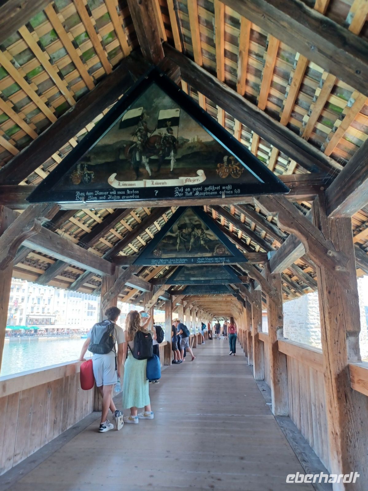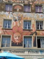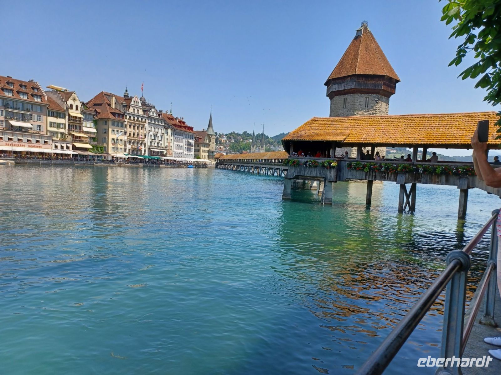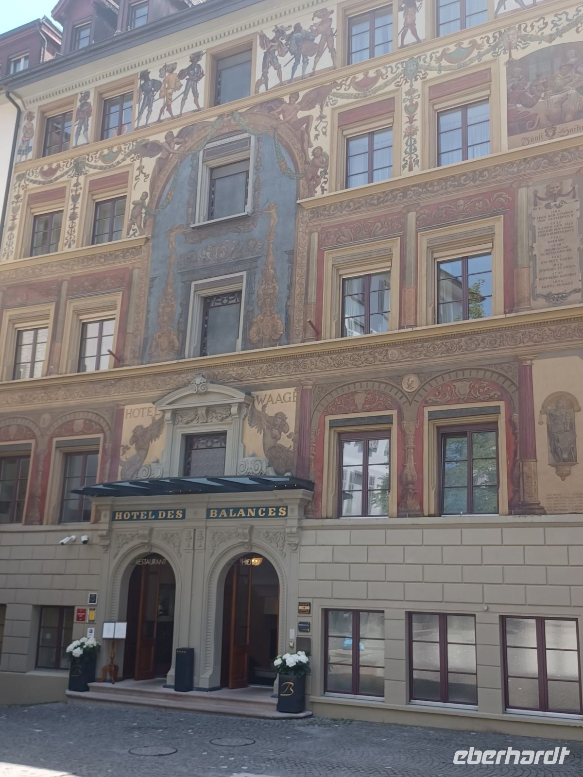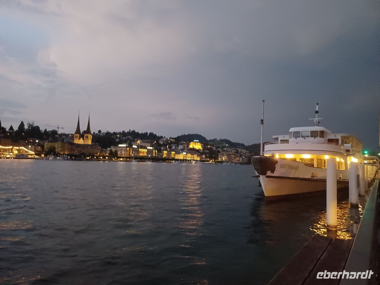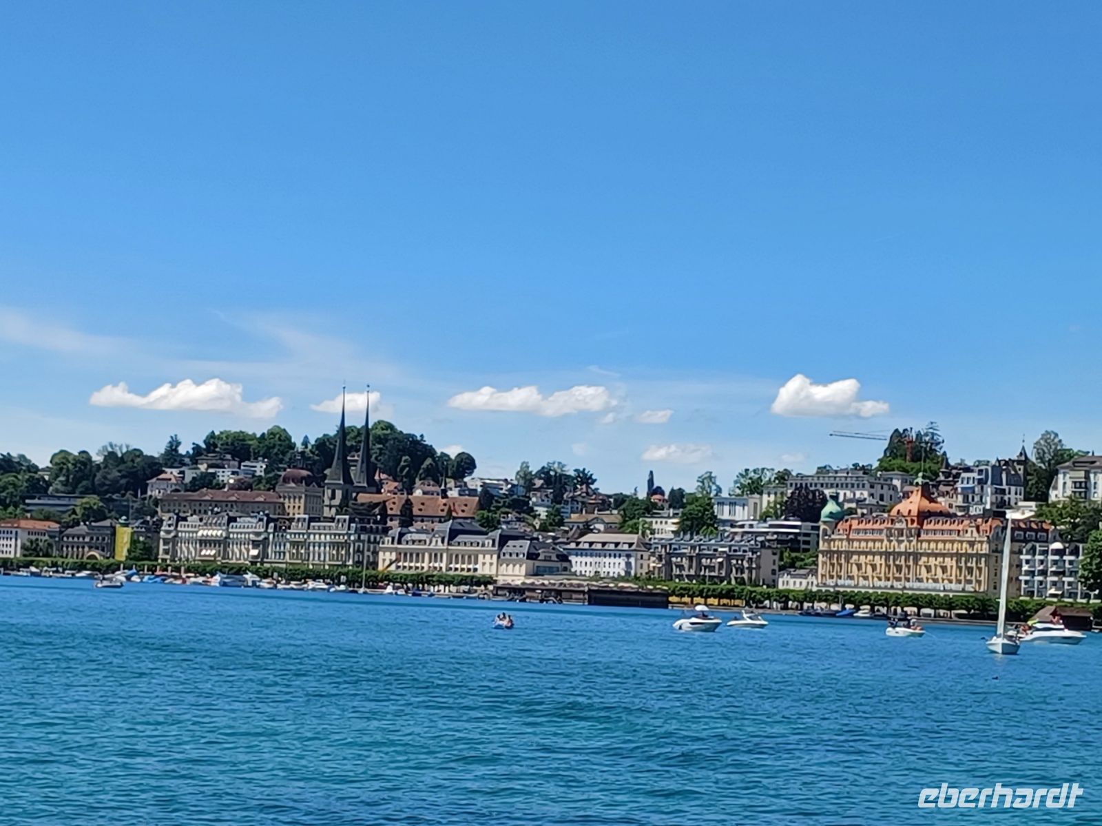 125 km legen wir bis Luzern zurück, wo uns nach der Ankunft unsere Stadtführerin am alten Bahnhofstor empfängt. Wir stimmen uns bei über 30 Grad auf einen zweistündigen Stadtspaziergang ein. Frau Rita leitet uns mit Bedacht zu überschatteten Standorten. Die überdachten Holzbrücken, die Kappelbrücke, die Spreuerbrücke wurden als Wehrgang über die Reuss gebaut u. verbinden die Neustadt mit der Altstadt. Die Bilderzyklen unter den Dächern geben dem Passanten einen Einblick in die luzerner u. eidgenössische Geschichte; sie vermitteln Lebensweisheiten u. Alltagsregeln. Im Innenraum der katholischen Franziskanerkirche erholen wir uns von der Hitze bevor wir in die Altstadt hinübergehen. Die Altstadt ist ein Kleinod an verzierten u. bemalten Häuser. Dicht an dicht reihen sich traditionelle kleine Hotels- jedes Gebäude ein Unikat. Wir schlängeln uns durch Schaufenstergassen bis zu unserem Hotel u. sind von der Stadt sehr beeindruckt. In der Hotellobby werden wir mit gekühltem Orangenwasser empfangen, die Koffer sind dankenswerter Weise bereits auf die Zimmer gebracht worden. So erholt sich jeder auf seine Weise bis zum Abendessen. Für den Abend empfiehlt die Reiseleitung eine Fährfahrt mit dem Motorschiff Bürgenstock auf dem Vierwaldstättersee nach Kehrsiten-Bürgenstock (hin- u. zurück 1 h). Wer mag kann mit der Bürgenstockbahn zum Resort hochfahren. Der Swiss Bahnpass includiert diese Fährfahrt. Wir begeben uns mit 10 Teilnehmern auf die Abendfahrt und genießen im Anschluss das beleuchtete Nachtleben der Stadt.