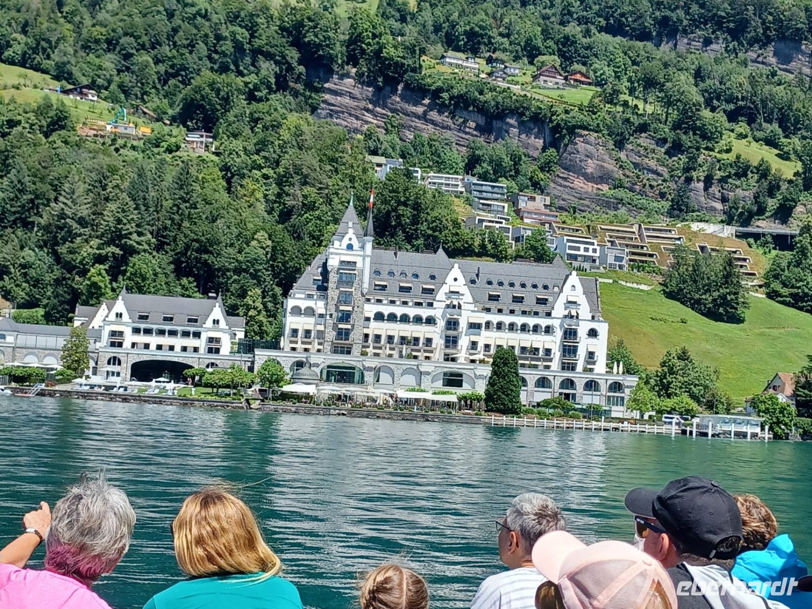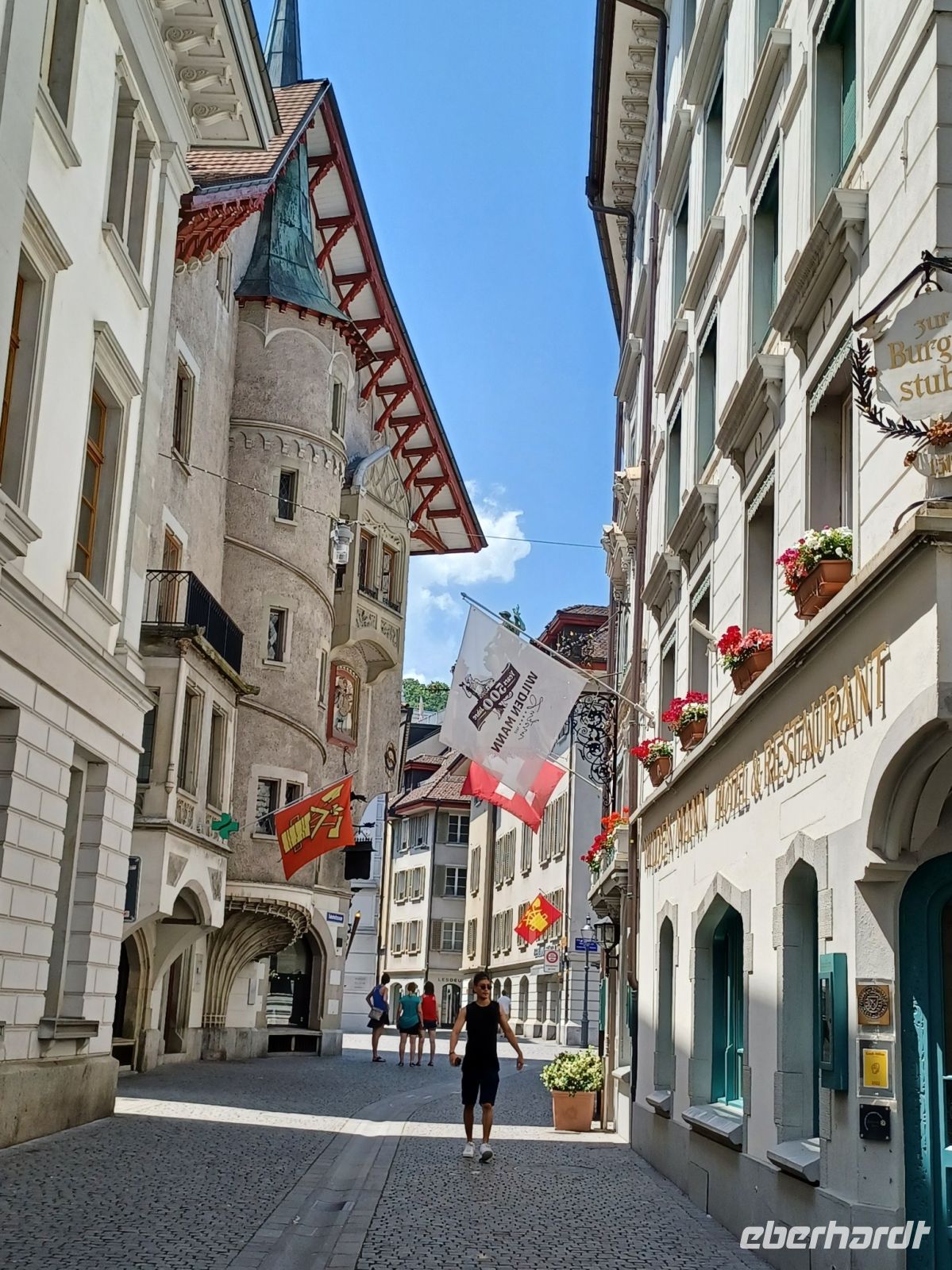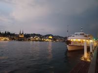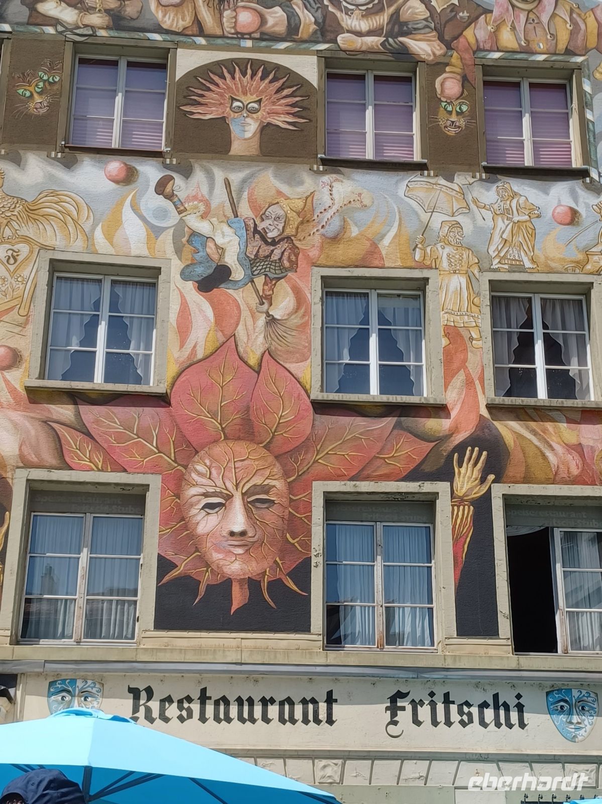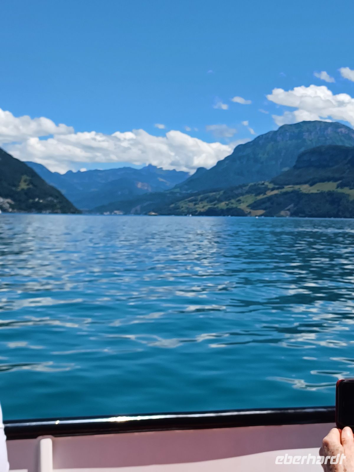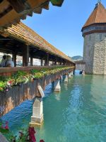 125 km legen wir bis Luzern zurück, wo uns nach der Ankunft unsere Stadtführerin am alten Bahnhofstor empfängt. Wir stimmen uns bei über 30 Grad auf einen zweistündigen Stadtspaziergang ein. Frau Rita leitet uns mit Bedacht zu überschatteten Standorten. Die überdachten Holzbrücken, die Kappelbrücke, die Spreuerbrücke wurden als Wehrgang über die Reuss gebaut u. verbinden die Neustadt mit der Altstadt. Die Bilderzyklen unter den Dächern geben dem Passanten einen Einblick in die luzerner u. eidgenössische Geschichte; sie vermitteln Lebensweisheiten u. Alltagsregeln. Im Innenraum der katholischen Franziskanerkirche erholen wir uns von der Hitze bevor wir in die Altstadt hinübergehen. Die Altstadt ist ein Kleinod an verzierten u. bemalten Häuser. Dicht an dicht reihen sich traditionelle kleine Hotels- jedes Gebäude ein Unikat. Wir schlängeln uns durch Schaufenstergassen bis zu unserem Hotel u. sind von der Stadt sehr beeindruckt. In der Hotellobby werden wir mit gekühltem Orangenwasser empfangen, die Koffer sind dankenswerter Weise bereits auf die Zimmer gebracht worden. So erholt sich jeder auf seine Weise bis zum Abendessen. Für den Abend empfiehlt die Reiseleitung eine Fährfahrt mit dem Motorschiff Bürgenstock auf dem Vierwaldstättersee nach Kehrsiten-Bürgenstock (hin- u. zurück 1 h). Wer mag kann mit der Bürgenstockbahn zum Resort hochfahren. Der Swiss Bahnpass includiert diese Fährfahrt. Wir begeben uns mit 10 Teilnehmern auf die Abendfahrt und genießen im Anschluss das beleuchtete Nachtleben der Stadt.