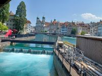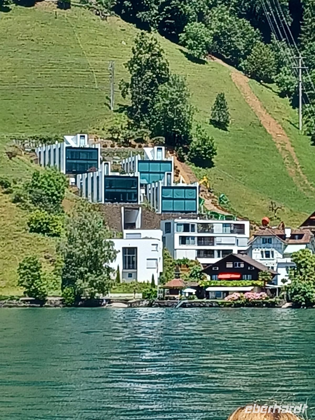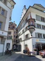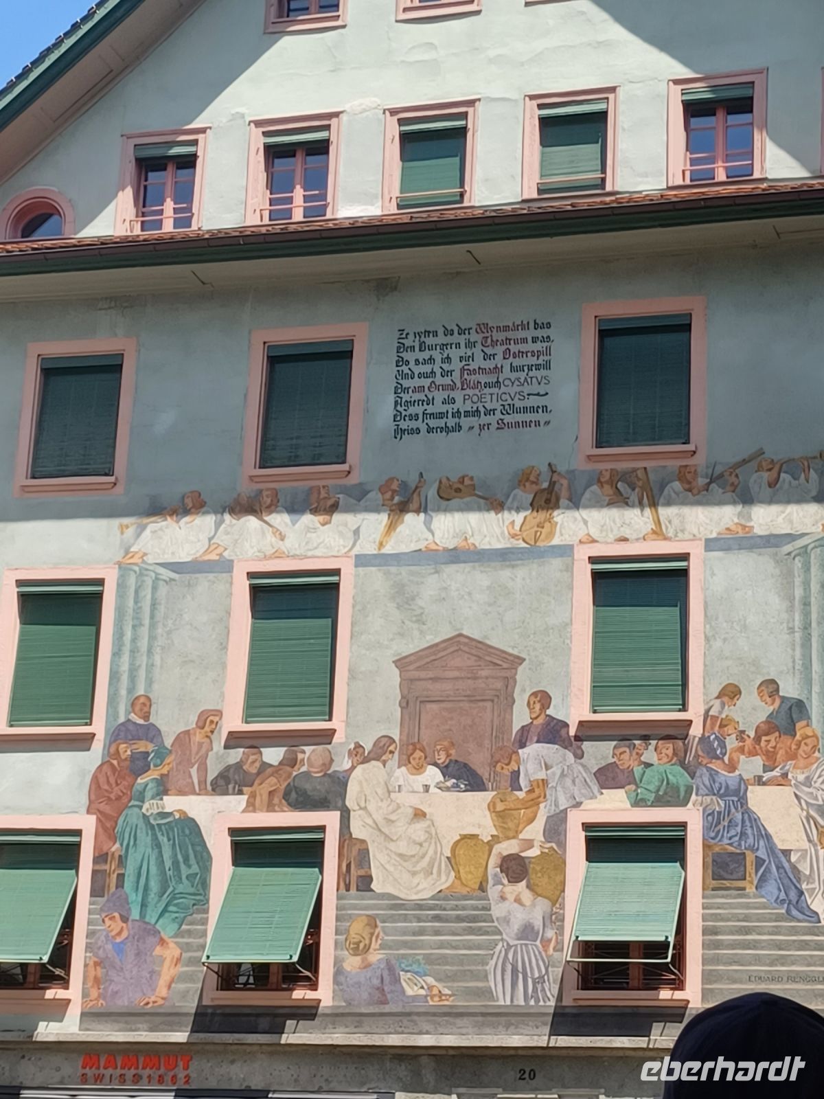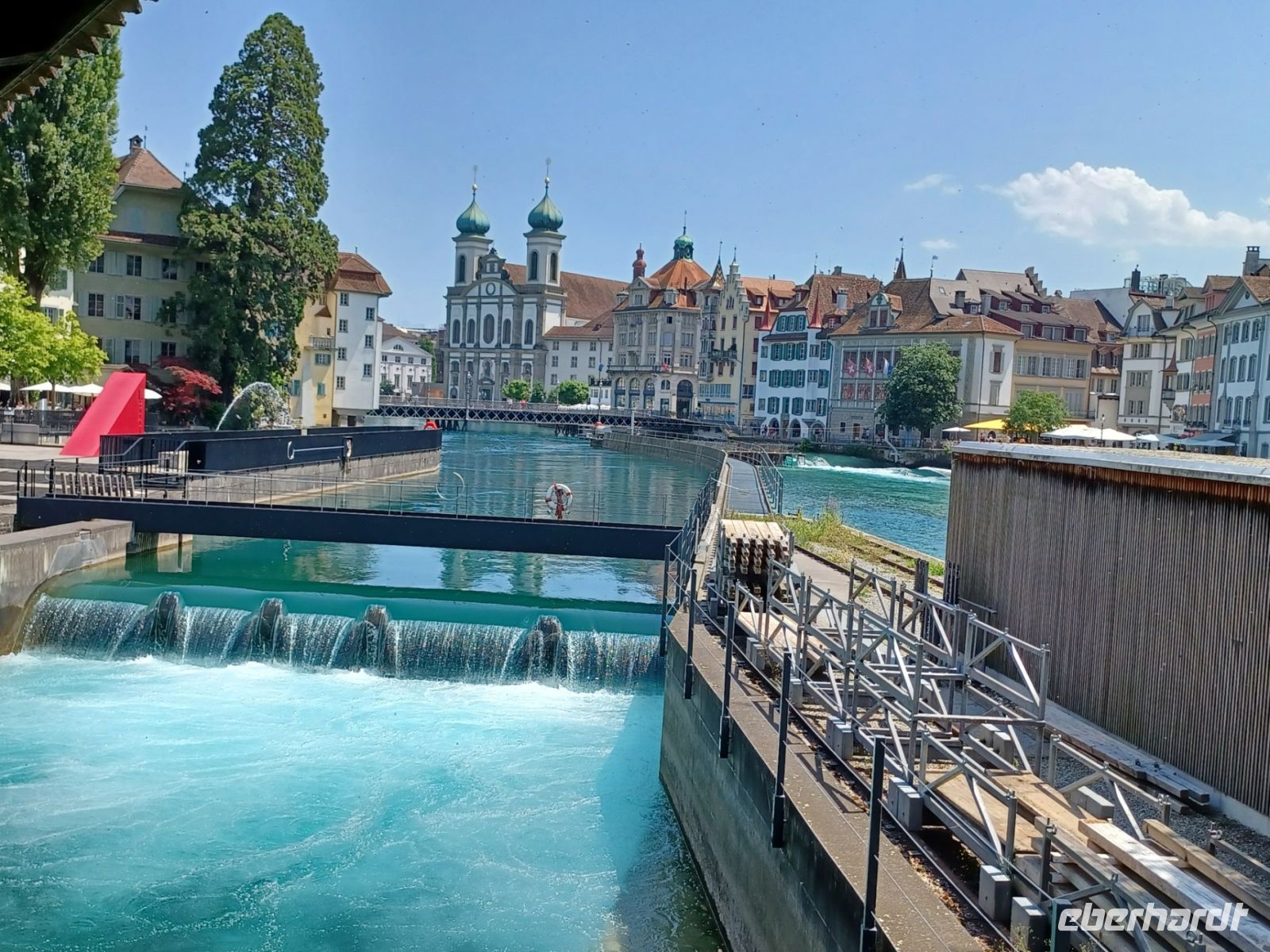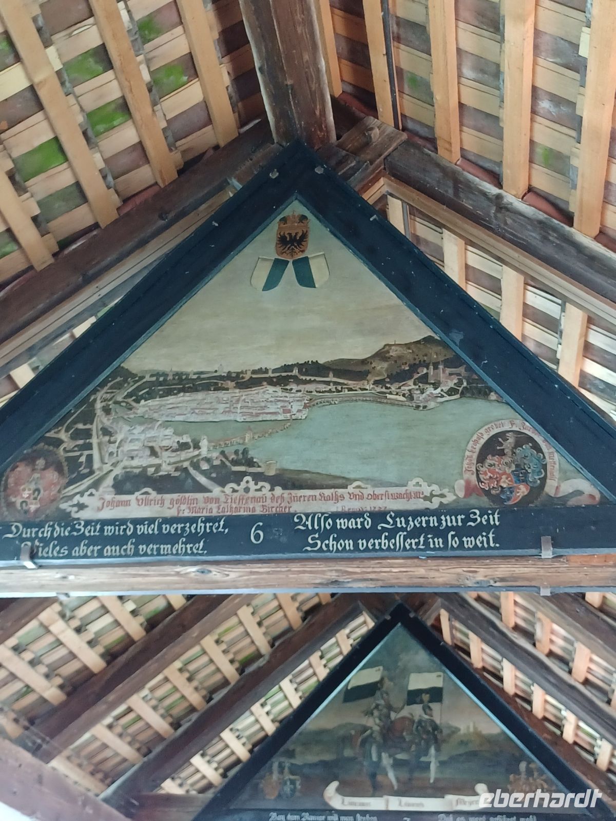 125 km legen wir bis Luzern zurück, wo uns nach der Ankunft unsere Stadtführerin am alten Bahnhofstor empfängt. Wir stimmen uns bei über 30 Grad auf einen zweistündigen Stadtspaziergang ein. Frau Rita leitet uns mit Bedacht zu überschatteten Standorten. Die überdachten Holzbrücken, die Kappelbrücke, die Spreuerbrücke wurden als Wehrgang über die Reuss gebaut u. verbinden die Neustadt mit der Altstadt. Die Bilderzyklen unter den Dächern geben dem Passanten einen Einblick in die luzerner u. eidgenössische Geschichte; sie vermitteln Lebensweisheiten u. Alltagsregeln. Im Innenraum der katholischen Franziskanerkirche erholen wir uns von der Hitze bevor wir in die Altstadt hinübergehen. Die Altstadt ist ein Kleinod an verzierten u. bemalten Häuser. Dicht an dicht reihen sich traditionelle kleine Hotels- jedes Gebäude ein Unikat. Wir schlängeln uns durch Schaufenstergassen bis zu unserem Hotel u. sind von der Stadt sehr beeindruckt. In der Hotellobby werden wir mit gekühltem Orangenwasser empfangen, die Koffer sind dankenswerter Weise bereits auf die Zimmer gebracht worden. So erholt sich jeder auf seine Weise bis zum Abendessen. Für den Abend empfiehlt die Reiseleitung eine Fährfahrt mit dem Motorschiff Bürgenstock auf dem Vierwaldstättersee nach Kehrsiten-Bürgenstock (hin- u. zurück 1 h). Wer mag kann mit der Bürgenstockbahn zum Resort hochfahren. Der Swiss Bahnpass includiert diese Fährfahrt. Wir begeben uns mit 10 Teilnehmern auf die Abendfahrt und genießen im Anschluss das beleuchtete Nachtleben der Stadt.