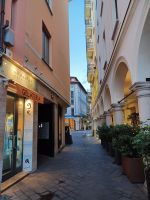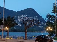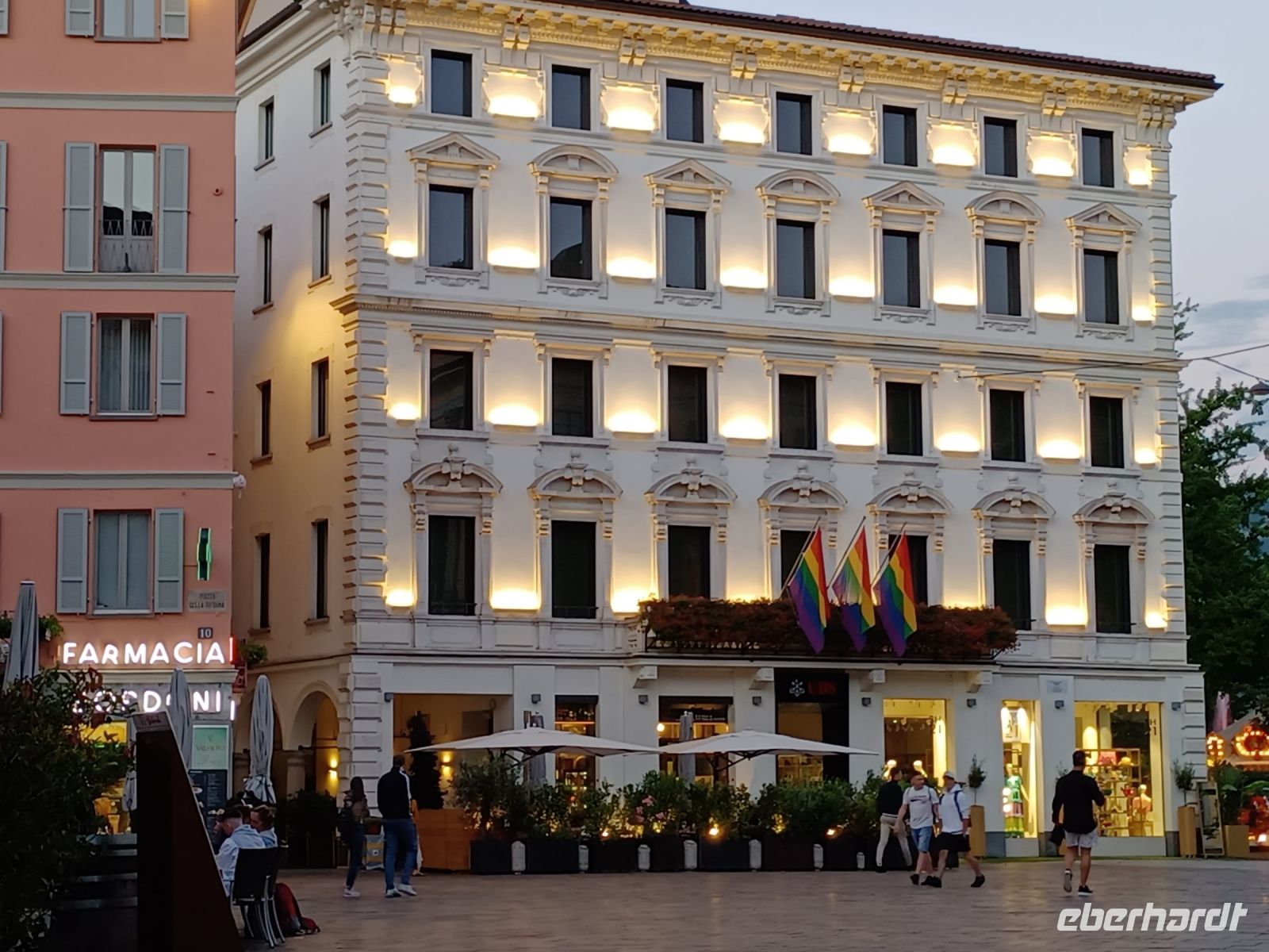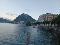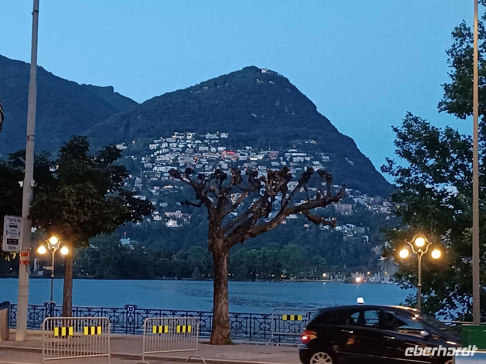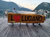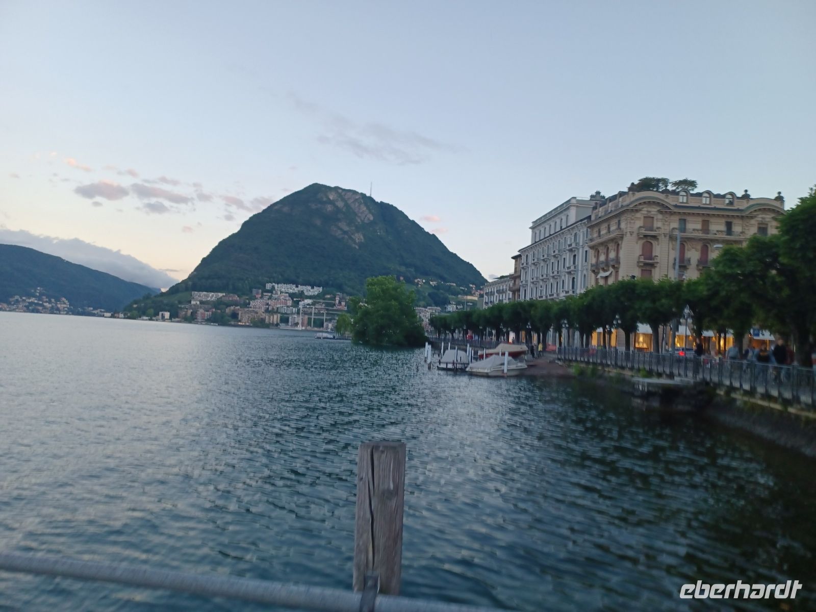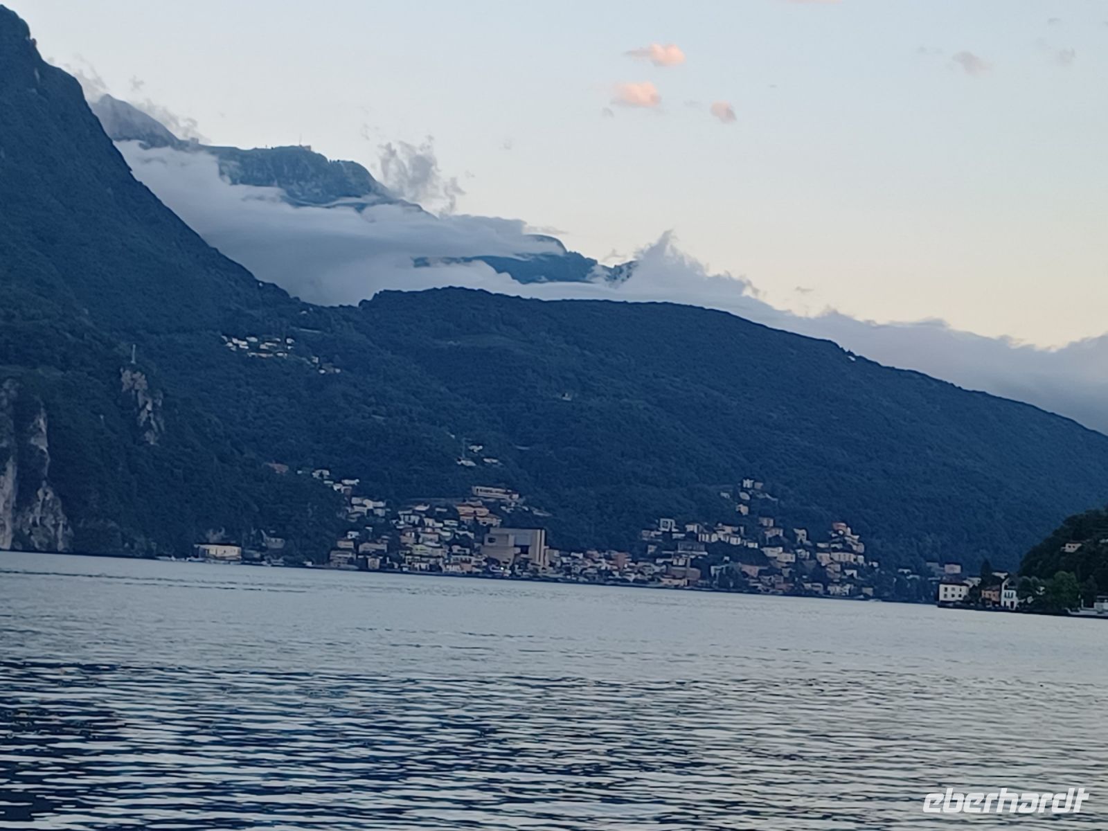 Früh ist es für uns. Wir gehen bei schönem Morgenwetter mit klarer Sicht um 8:15 Uhr zum Bahnhof, nehmen die steile Rolltreppe abwärts zum See. Unser Zug kommt von Chur u. bringt uns 122 km durch 55 Tunnel u. 196 Brücken in die italienische Stadt Tirano. Zunächst fährt der Zug weiter aufwärts, hautnah an der mächtigen Gletscherwelt des Berninamassivs vorbei. Beim Lago Bianco haben wir die Baumgrenze überschritten. Eine wolkenreiche mondähnliche Landschaft lässt die Bergwelt grenzenlos erscheinen. Von mehr als 2200 m Höhe geht es kurvenreich hinab ins Puschlav u. über den berühmten Kreisviadukt von Brusio überwindet die Bahn weitere Höhenunterschiede bis auf 429 m ü.M. Gegen Mittag erreichen wir die Stadt Tirano, die seit dem Mittelalter ein wichtiger Handelskreuzpunkt war u. eine gut erhaltene mittelalterliche Altstadt mit repräsentativen Palazzos des zu Reichtum gelangten Adels aufweist. Die sehenswerte barocke Kathedrale Santuario Madonnadi Tirano liegt 20 Gehminuten vom Zentrum u. ist leider über die Mittagszeit - wie auch die Geschäfte u. die Touristeninformation- von 12 bis 14 Uhr geschlossen. Also folgen wir dem Rhythmus u. lassen uns in einem der kleinen Restaurants in der Altstadt kulinarisch verwöhnen. Nach dem Mittagsaufenthalt treffen wir uns wieder am Bahnhof u. setzen unsere Fahrt in 2 schicken roten Bussen der Bernina Express Linie nach Lugano fort. Unterwegs Hitzegewitter. Die Fahrt führt vorbei an den Weinbergen Veltins, durch malerische Dörfer u. entlang des Comersees. Wir erreichen Lugano schließlich wieder bei Sonnenschein. Da hier im Gegensatz zu St. Moritz der Bahnhof oberhalb der Stadt liegt nehmen wir die kleine Standseilbahn "Lugano Citta" hinab ins Stadtzentrum. Es gilt der Swiss Bahnpass. Ein wunderschöner schattiger Altstattwegweg zeigt mit seinen Geschäften das mondäne Lugano an. Wir erreichen unser Hotel direkt am Luganer See. Unser Abendtisch ist fast festlich mit Stoffservietten u. Blumendeko vorbereitet. Wir sitzen gemeinsam an einer langen Tafel, was uns zu einem einmaligen Gruppenfoto inspiriert. Unsere Hände sind bisher nicht vom Datenschutz tangiert u. bringen dennoch etwas Leben in die sonst gesichterlosen Reisefotos.