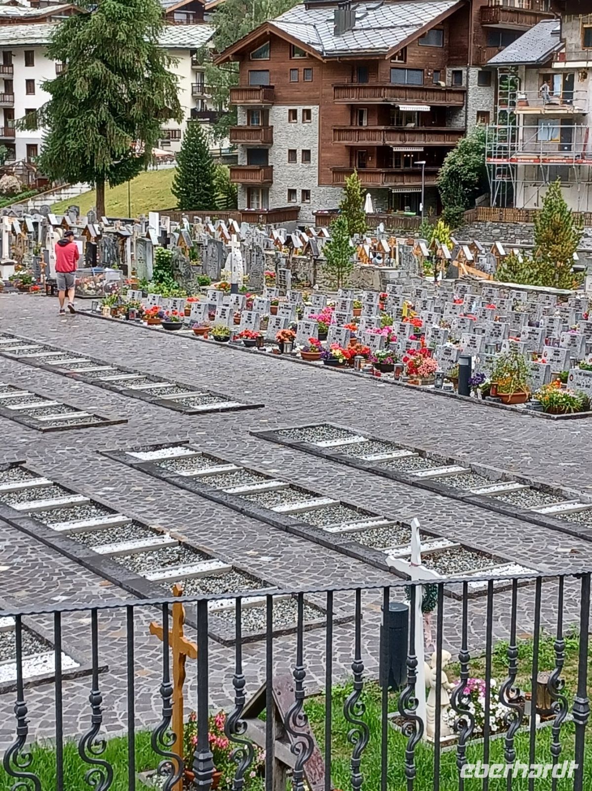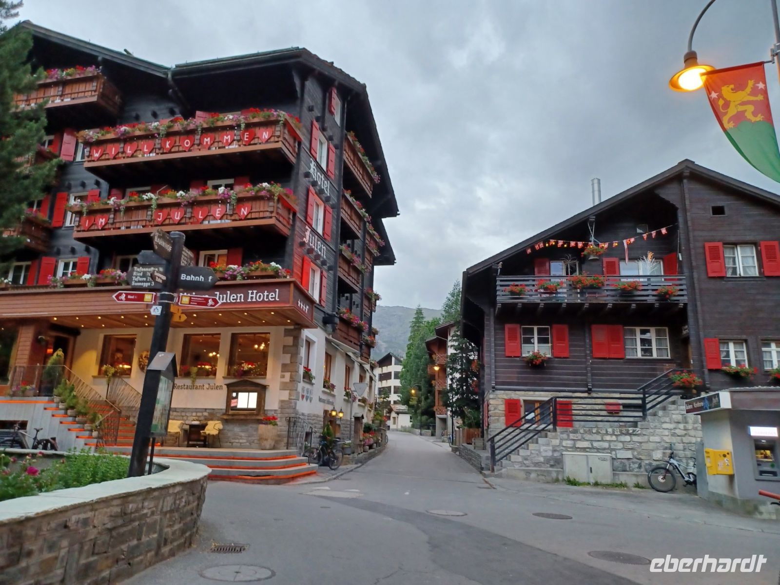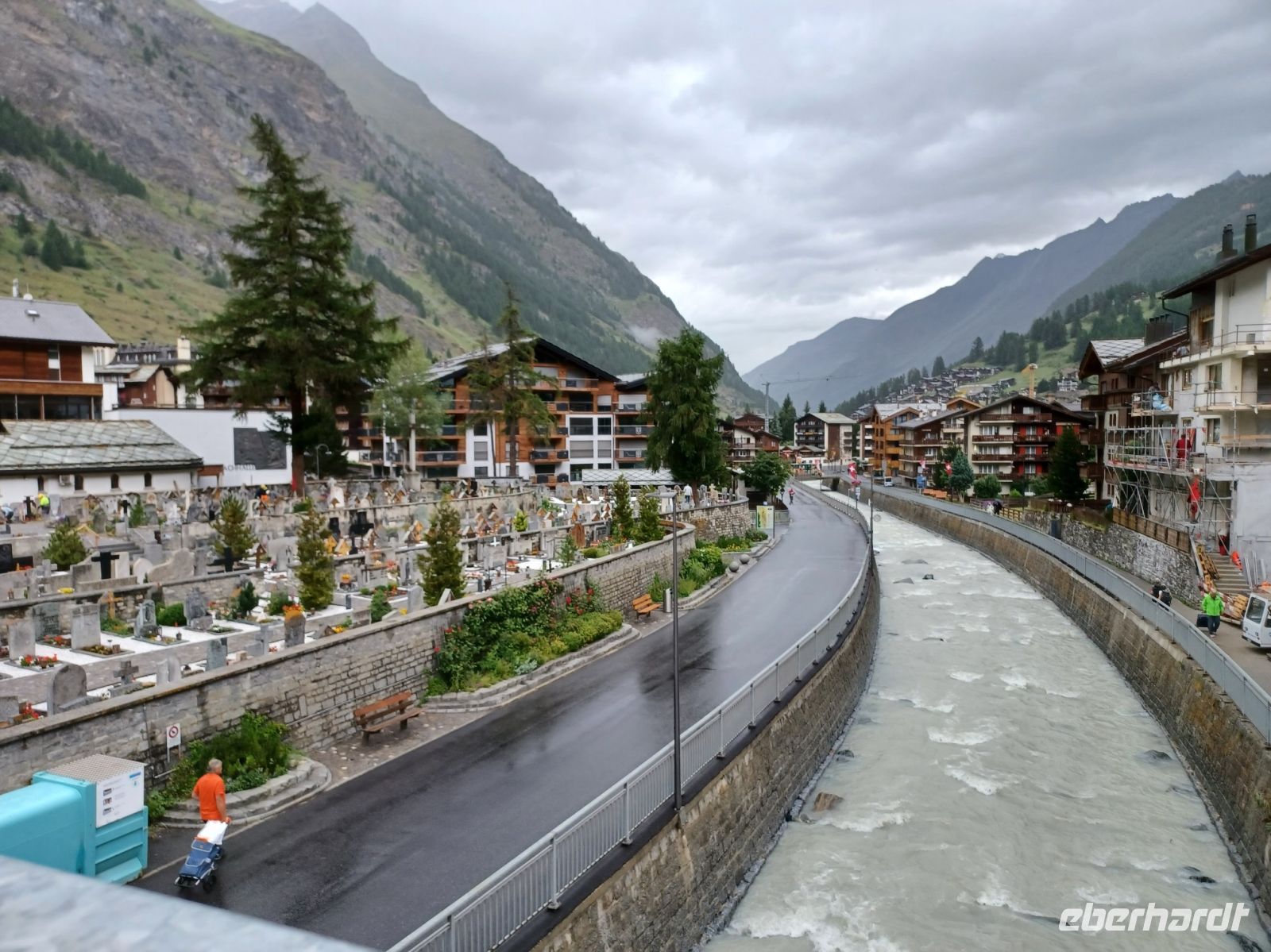 Lagebesprechung um 9 Uhr: der Radarschirm zeigt bis Mittag Regen an, dann soll es sich Aufhellen. Also starten wir mit einem individuellen Rundgang durch Zermatt: die alten dunklen Häuser aus Lärchenholz, die Englische Kirche, das Gemeindehaus, das Matterhornmuseum, der städtische Friedhof im Stadtzentrum. Über die touristische Einkaufstrasse gelangen wir zur Talstation der Gornegratbahn.