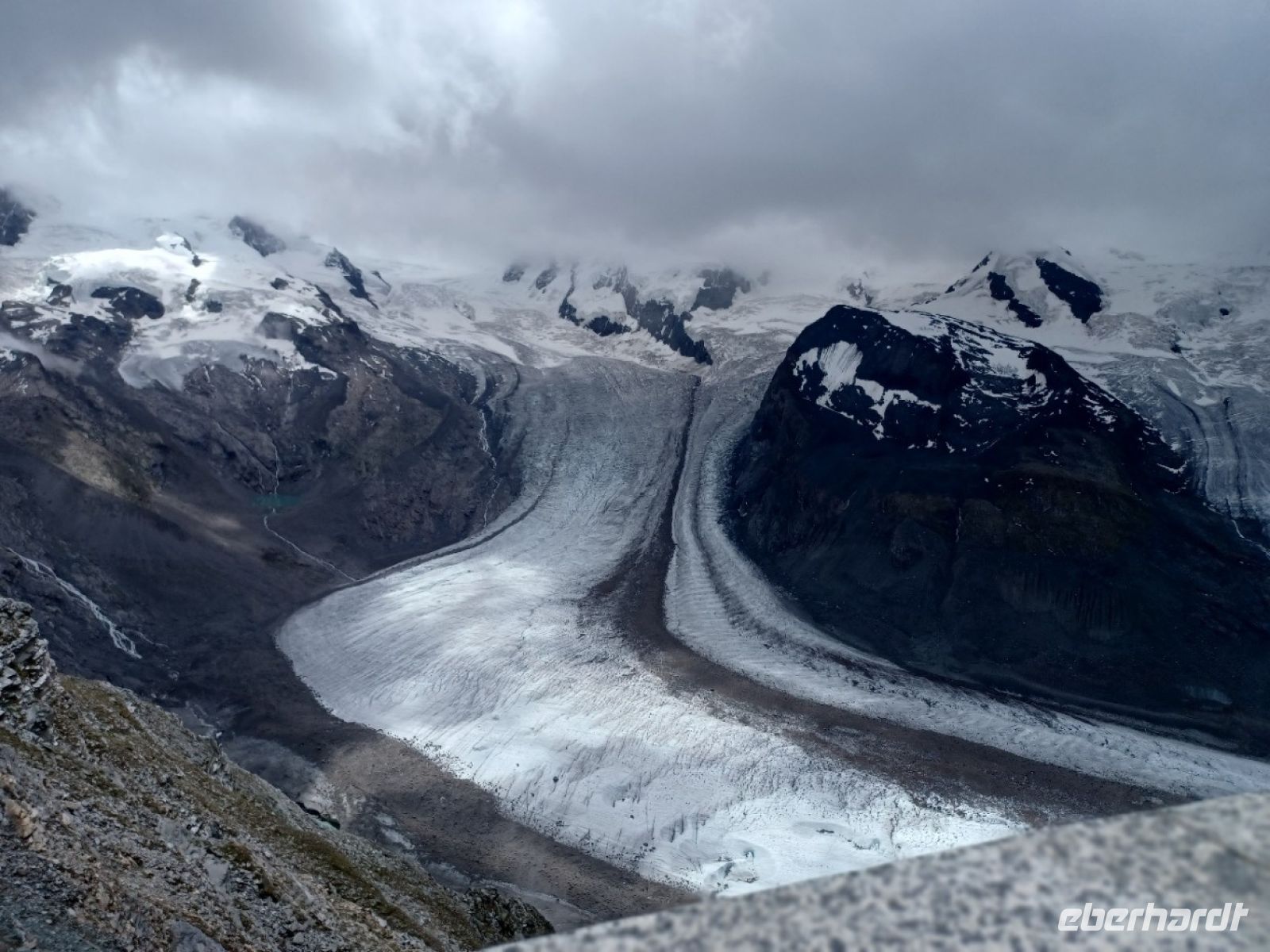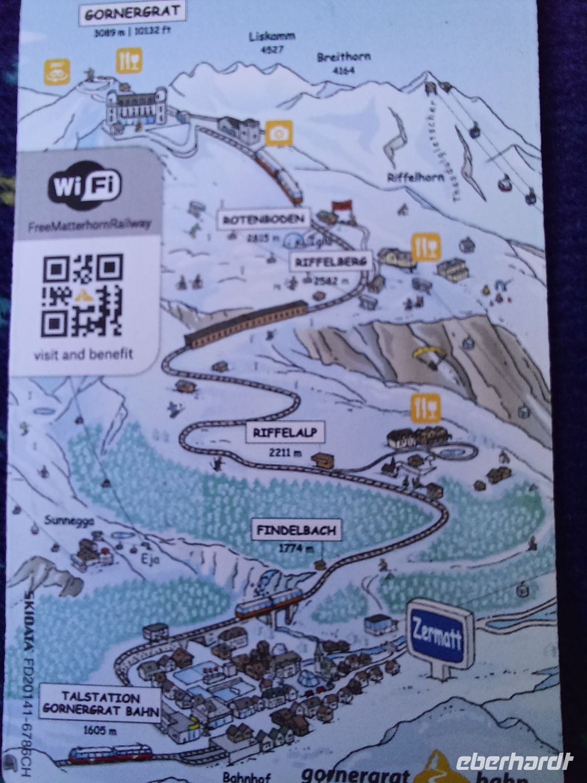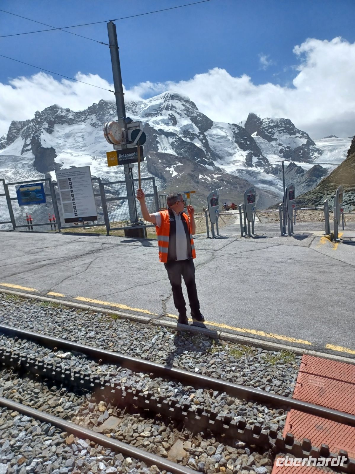 33 Min dauert die Hochtour mit der Bahn zum Gornergrat, 44 Min. die Rücktour. Unterwegs kann man an 5 zusätzlichen Stationen aussteigen u. Wanderungen unternehmen oder in einer Berghütte einkehren. Wer durchfährt, kann auf dem Gornegrat das Zoom, eine virtuelle Erlebniswelt besuchen, die Aussichtsplattform besteigen, das Restaurant u. den Souvenirshop besuchen. Aber bei guter Sicht -und die hatten wir dann wirklich- kann sich das Auge nicht satt sehen: die Monte Rosa Bergkette mit der Dufourspitze (4634m), der Gornergletscher, der Findelgletscher, der Furggletscher, Das Klein Matterhorn (3883m) u. das Matterhorn (4478m). Nach individuellem Tempo zum Aufenthalt begibt sich jeder wieder zum Abstieg in die Bergbahn.