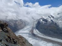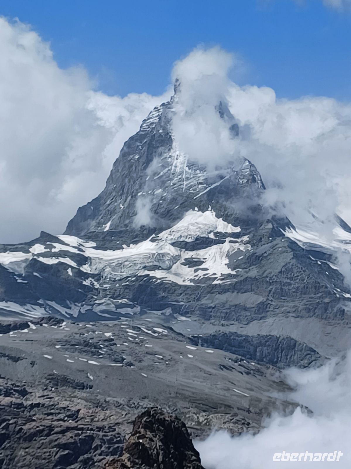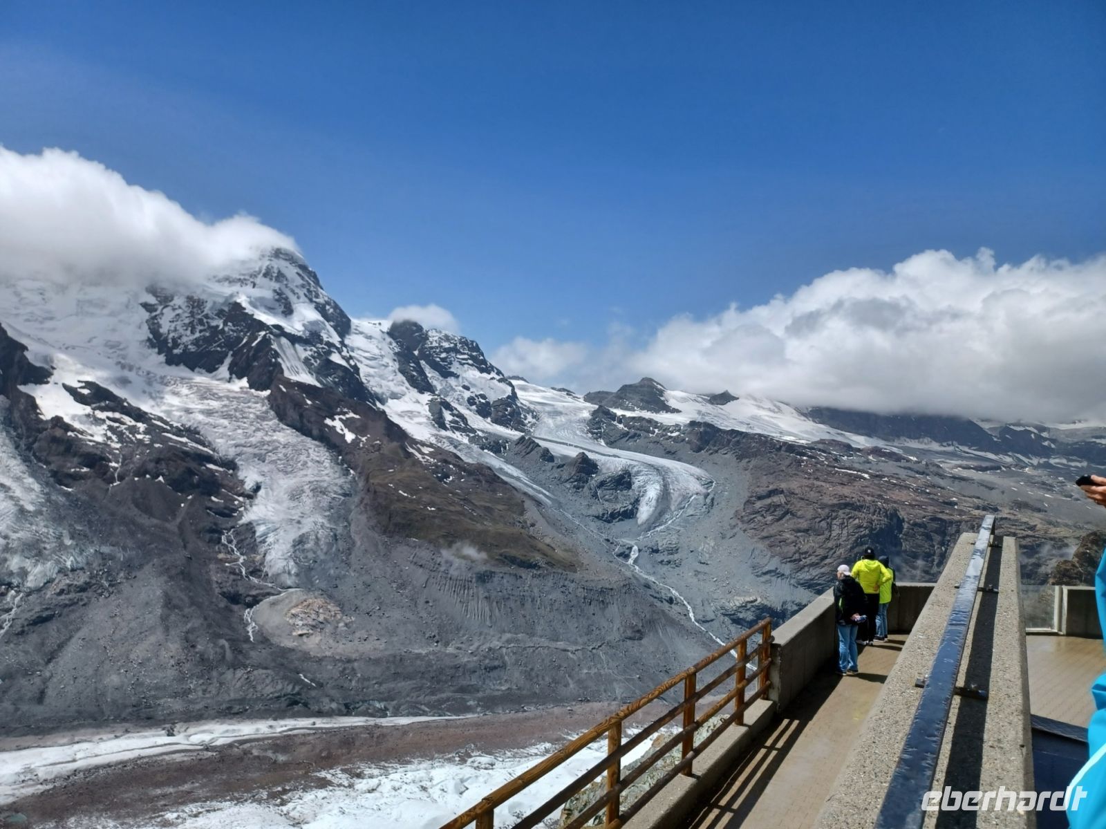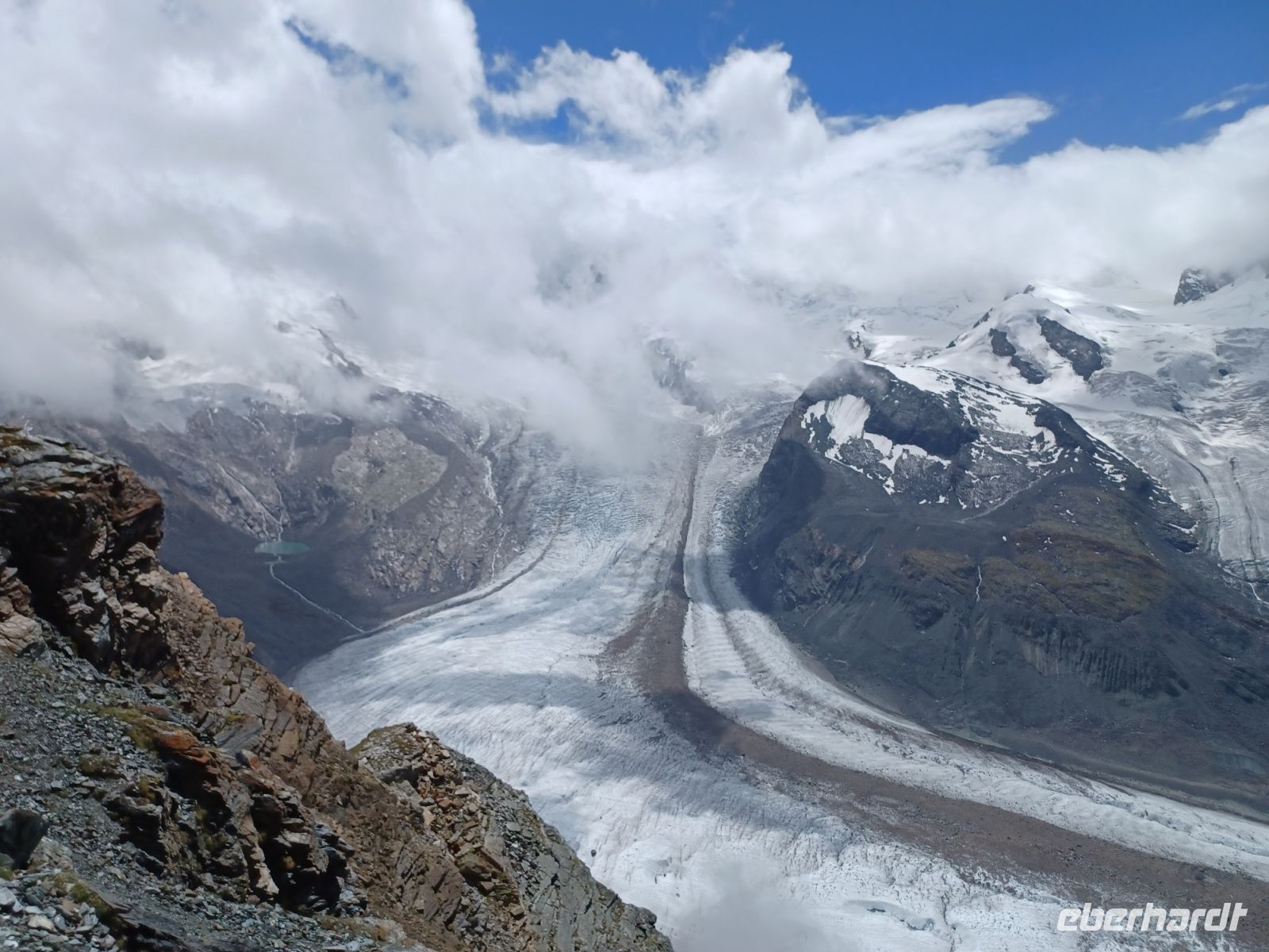 33 Min dauert die Hochtour mit der Bahn zum Gornergrat, 44 Min. die Rücktour. Unterwegs kann man an 5 zusätzlichen Stationen aussteigen u. Wanderungen unternehmen oder in einer Berghütte einkehren. Wer durchfährt, kann auf dem Gornegrat das Zoom, eine virtuelle Erlebniswelt besuchen, die Aussichtsplattform besteigen, das Restaurant u. den Souvenirshop besuchen. Aber bei guter Sicht -und die hatten wir dann wirklich- kann sich das Auge nicht satt sehen: die Monte Rosa Bergkette mit der Dufourspitze (4634m), der Gornergletscher, der Findelgletscher, der Furggletscher, Das Klein Matterhorn (3883m) u. das Matterhorn (4478m). Nach individuellem Tempo zum Aufenthalt begibt sich jeder wieder zum Abstieg in die Bergbahn.