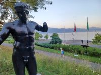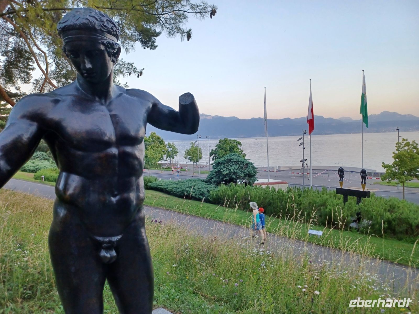 Der Abendempfehlung zum Spaziergang am Genfer See schließen sich Lauffreudige an. Wir nehmen die Metrolinie 2 vom Hauptbahnhof zum See Die im Jahre 2008 in Betrieb genommene Linie überwindet vom See bis hinauf zur Altstadt einen Höhenunterschied von ca 400 m u. weist damit den größten Höhenunterschied von allen U-Bahnen der Welt auf. Die Strecke umfasst nur 5,9 km u. ist zudem vollautomatisiert, fahrerlos. Hier gilt das Ticket für den öffentlichen Nahverkehr, das uns vom Hotel für beide Aufenthaltstage zur Verfügung gestellt wird. Am Genfersee schlendern wir bis zum Olympischen Museum u. durchlaufen dabei schöne Parkanlagen. Wir beschließen den Tag mit einem guten Glas Wein oder mit regionalem Bier am See.