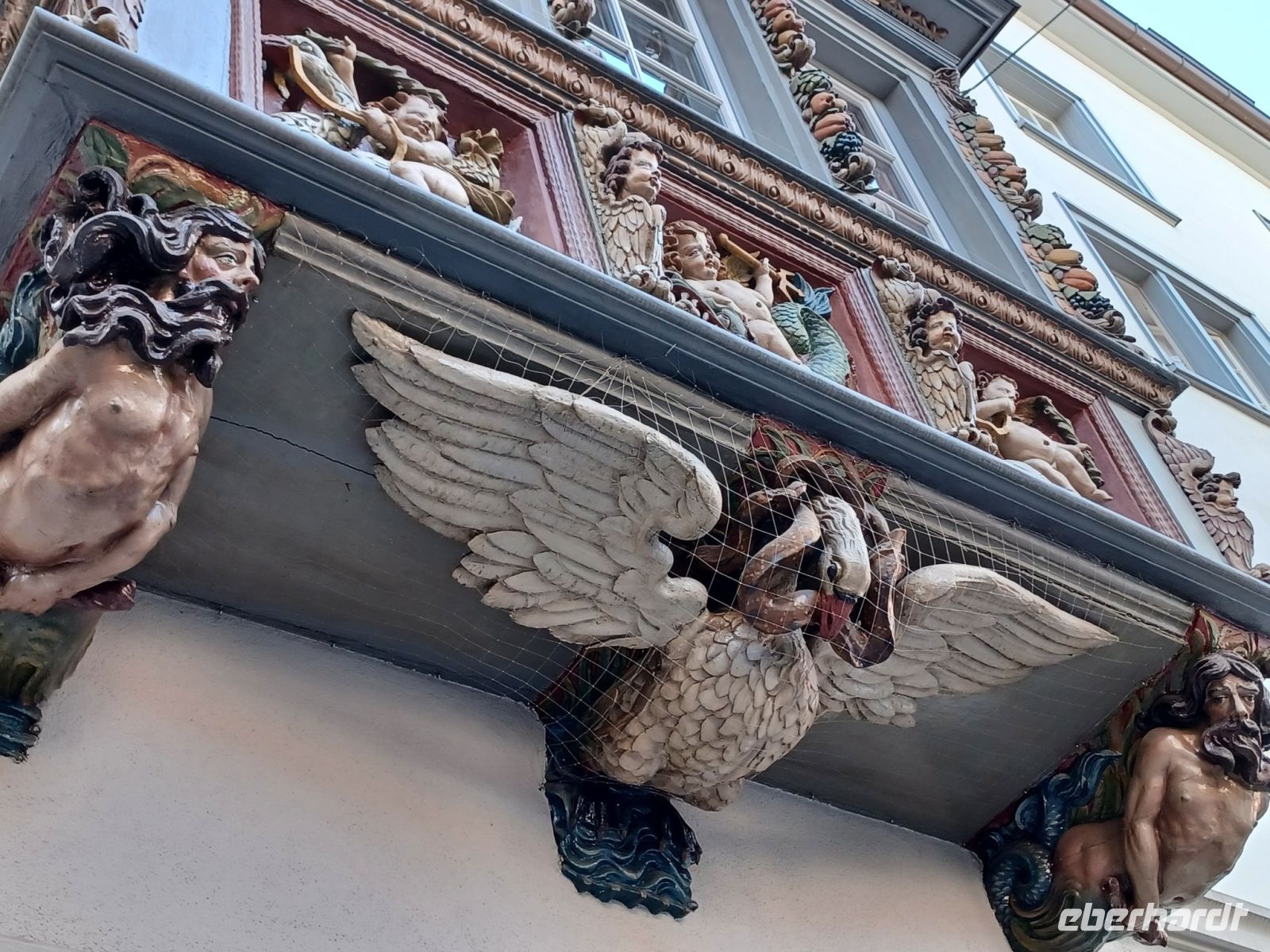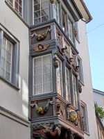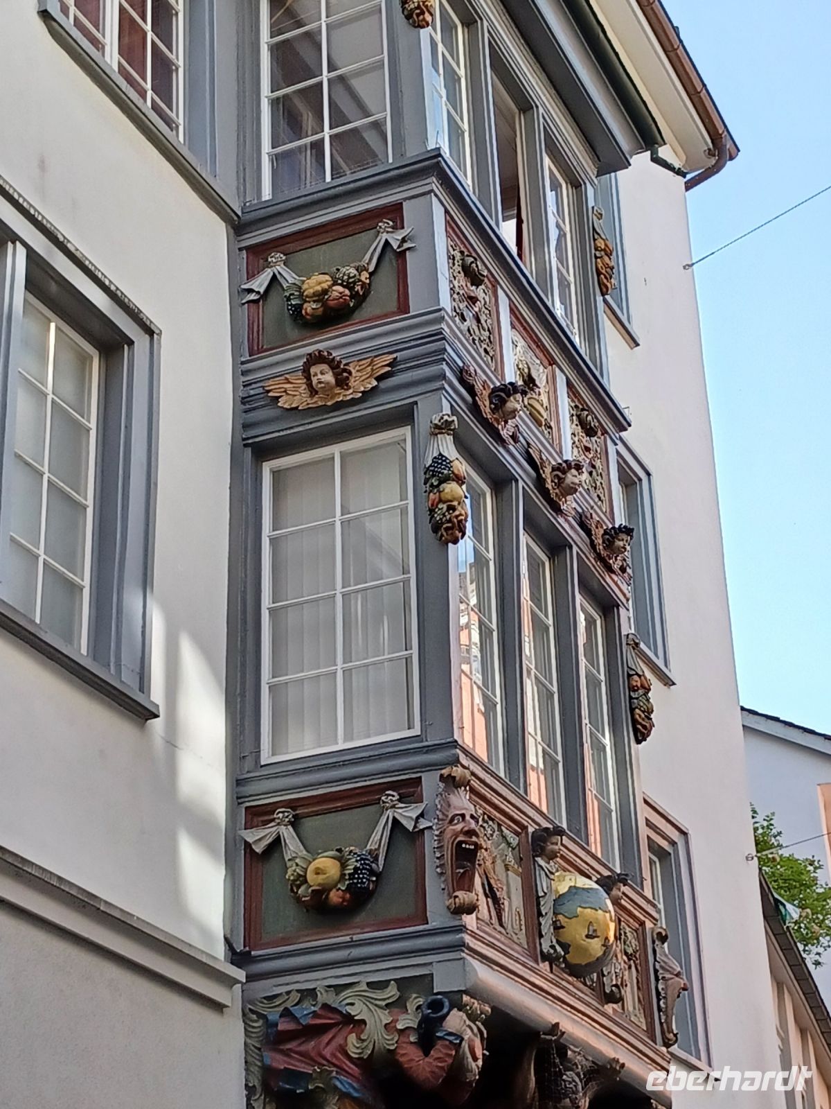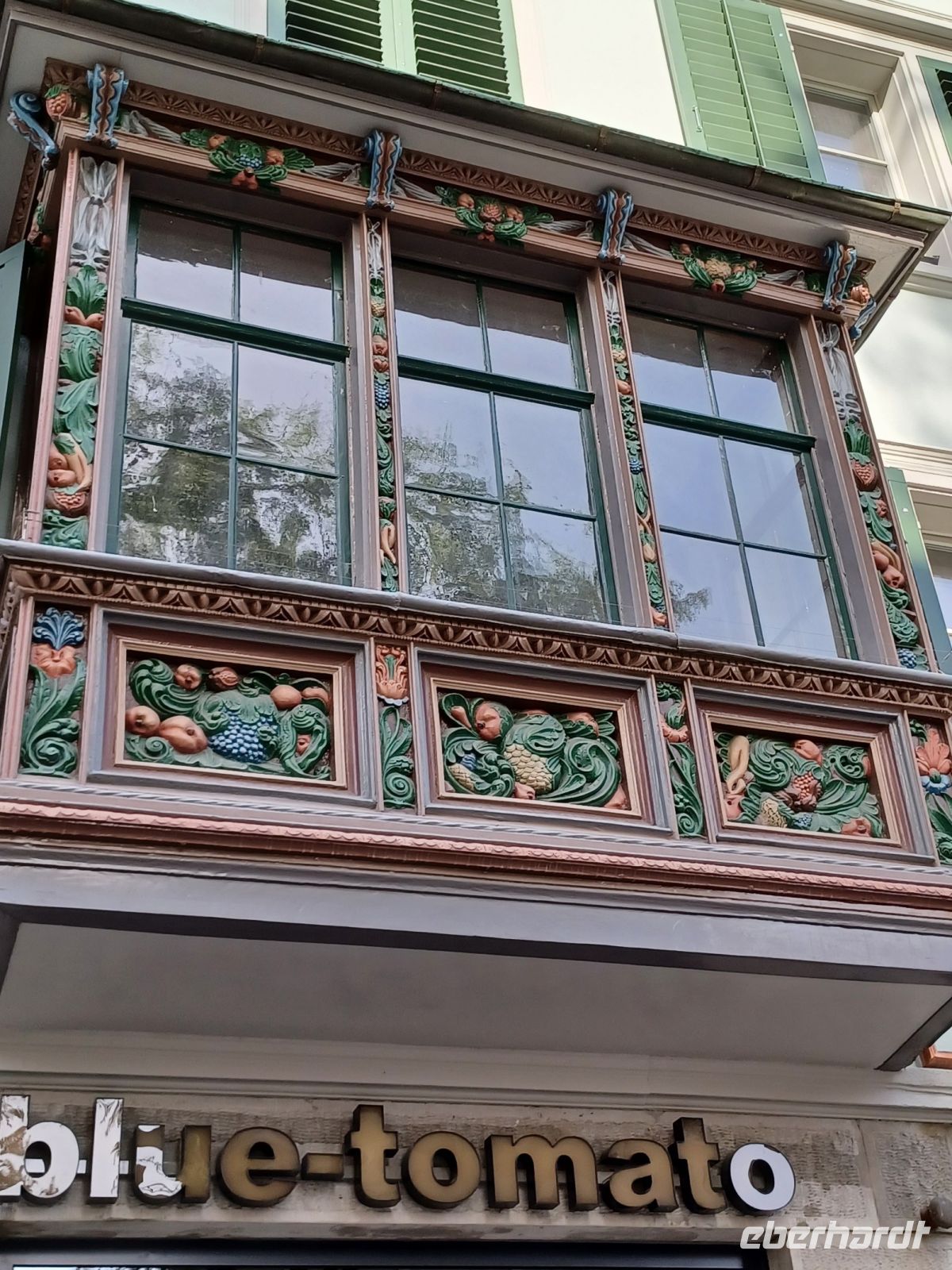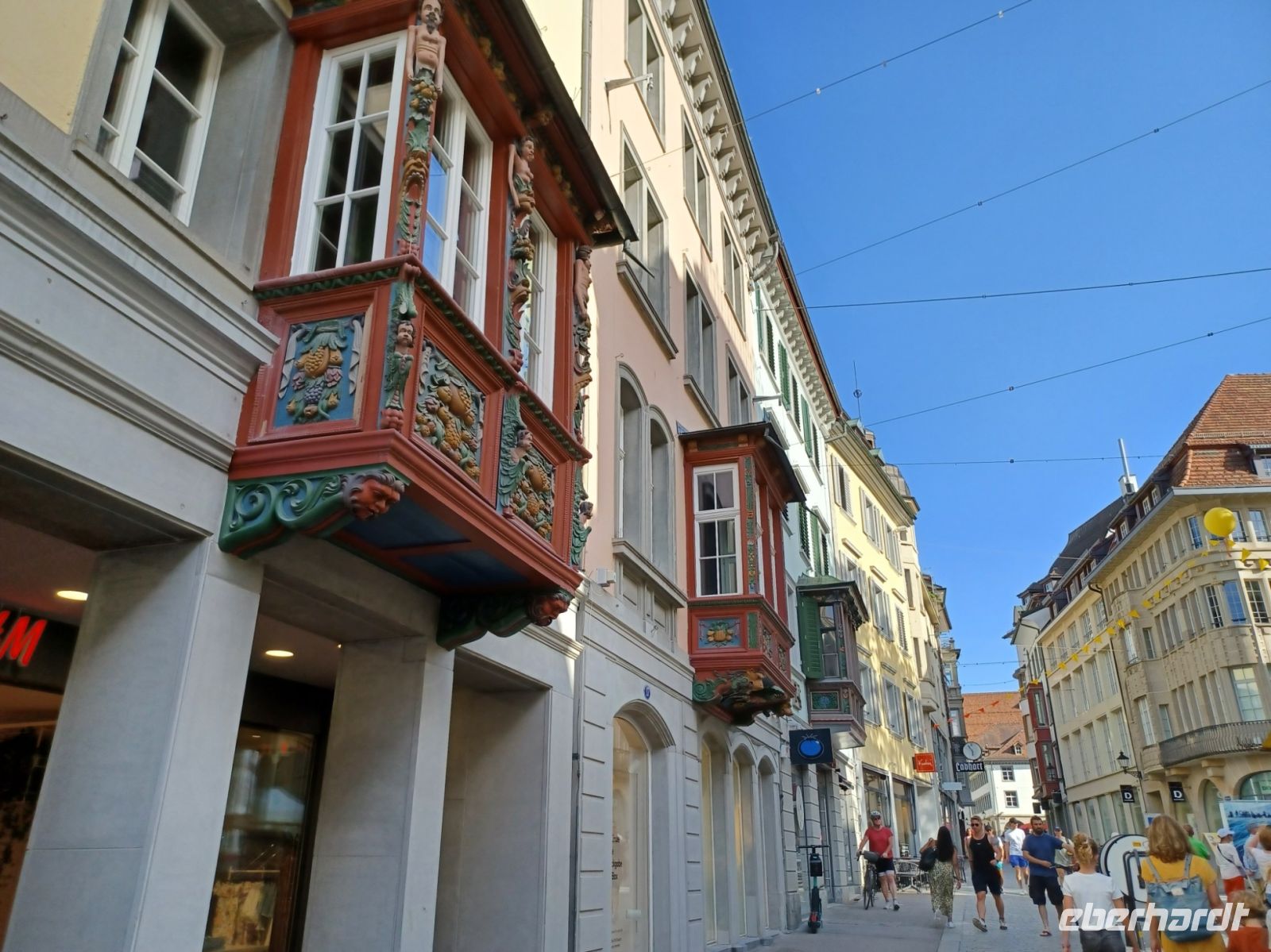 Unser erstes Zusammentreffen in der Hotellobby ist daher gleichzeitig der erste Programmpunkt um 17 Uhr: nach einer kurzen Vorstellung und Begrüßung der Reiseteilnehmer starten wir mit der Stadtführung bei noch hohen sommerlichen Temperaturen von 28 Grad. Unsere örtliche Reiseleiterin zeigt uns neben den markanten Sehenswürdigkeiten, wie das Klosterviertel und die Stiftskirche und Kathedrale St. Gallen, reich holzverzierte, farbenfrohe Erker an den Häuserfassaden. Die Erker widerspiegeln den Stand und die Lebensart des jeweiligen Bewohners.