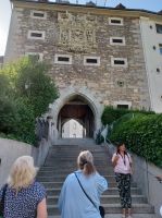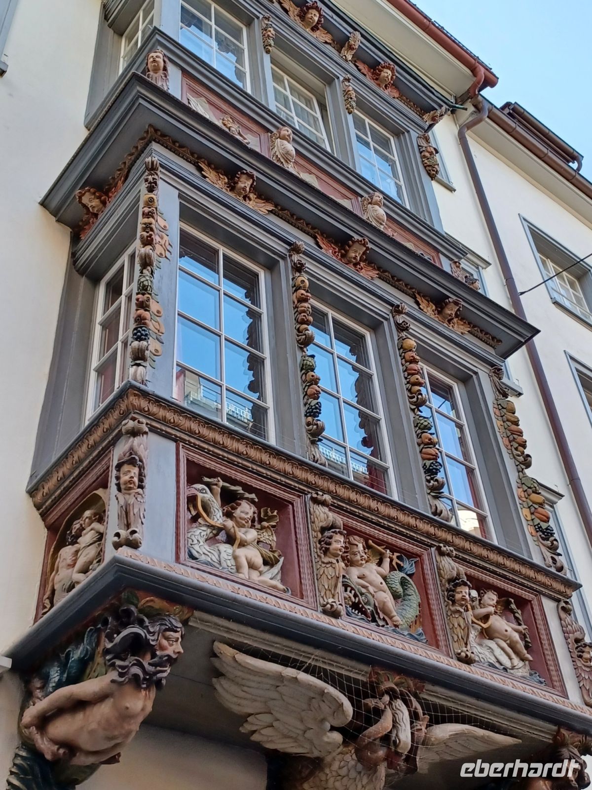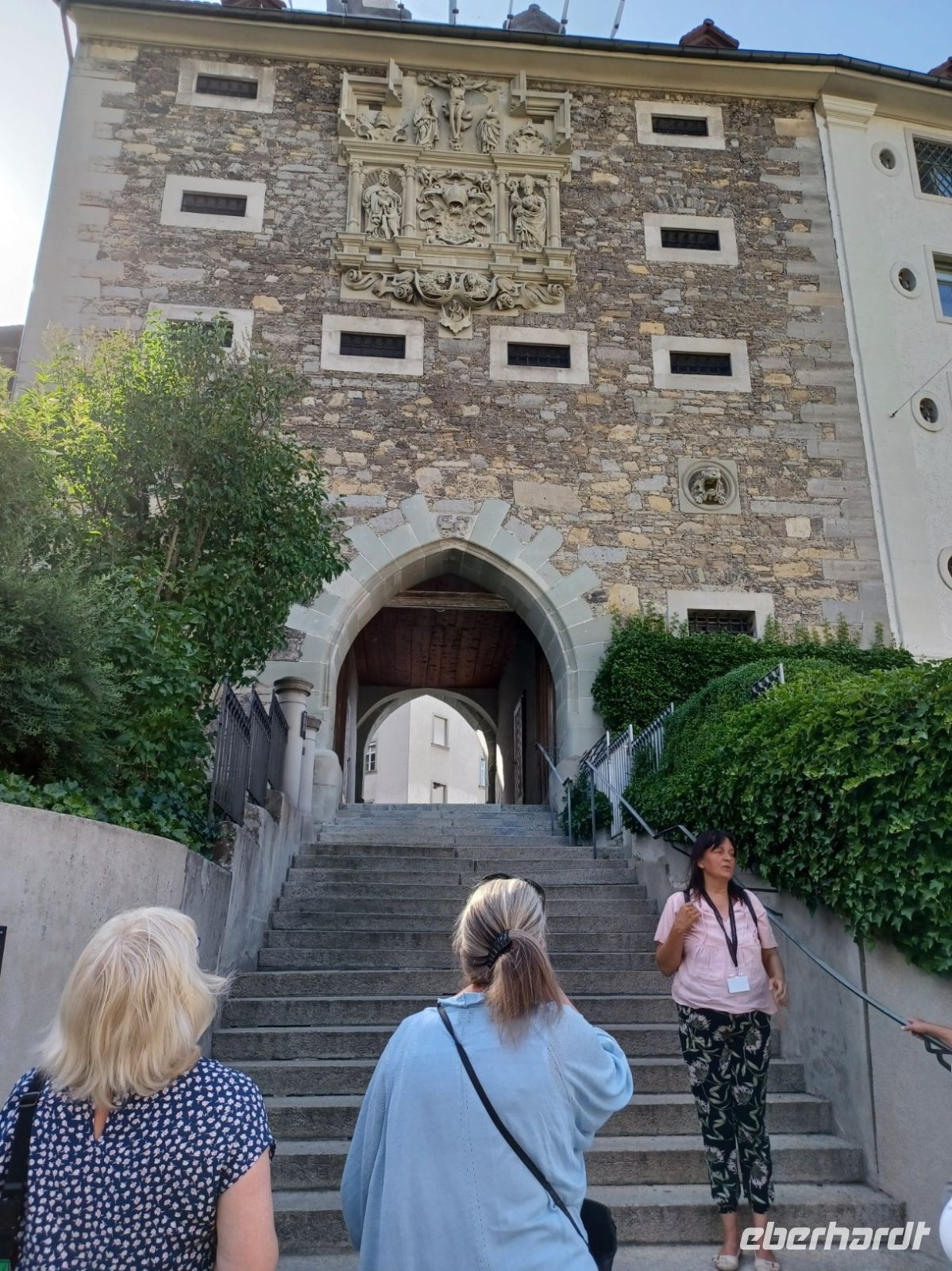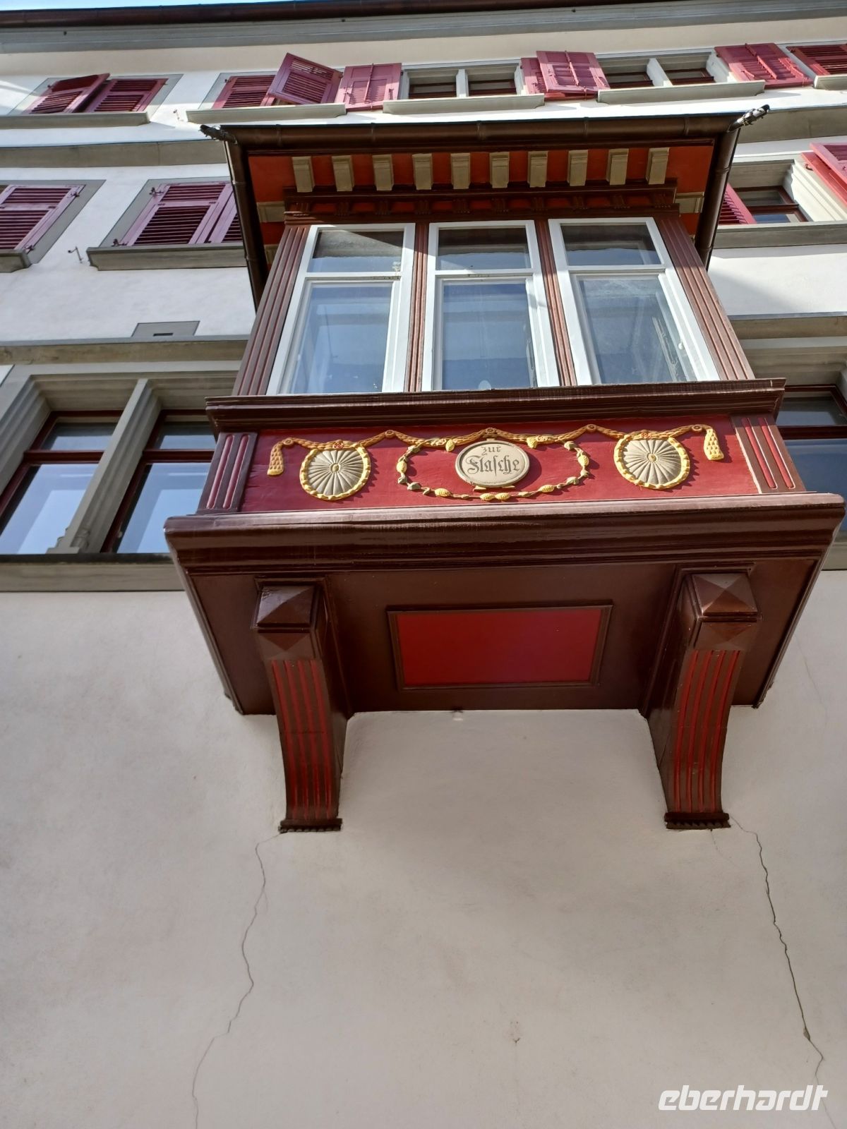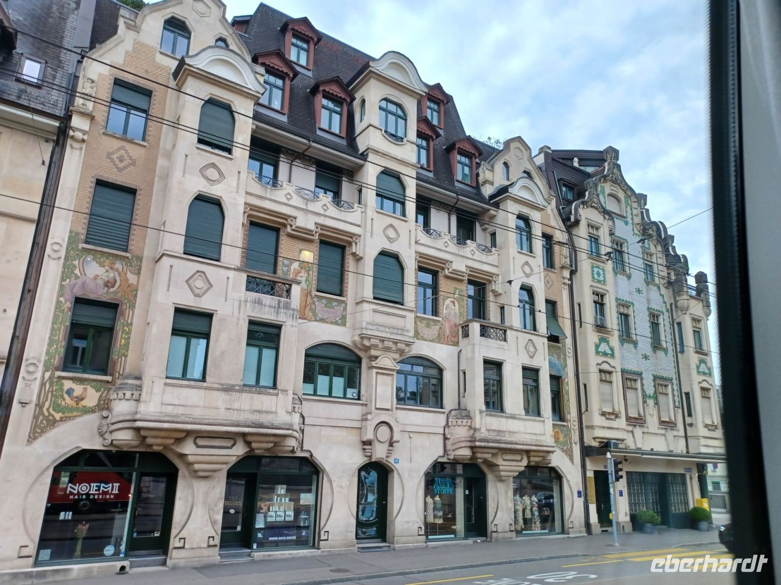 Unser erstes Zusammentreffen in der Hotellobby ist daher gleichzeitig der erste Programmpunkt um 17 Uhr: nach einer kurzen Vorstellung und Begrüßung der Reiseteilnehmer starten wir mit der Stadtführung bei noch hohen sommerlichen Temperaturen von 28 Grad. Unsere örtliche Reiseleiterin zeigt uns neben den markanten Sehenswürdigkeiten, wie das Klosterviertel und die Stiftskirche und Kathedrale St. Gallen, reich holzverzierte, farbenfrohe Erker an den Häuserfassaden. Die Erker widerspiegeln den Stand und die Lebensart des jeweiligen Bewohners.