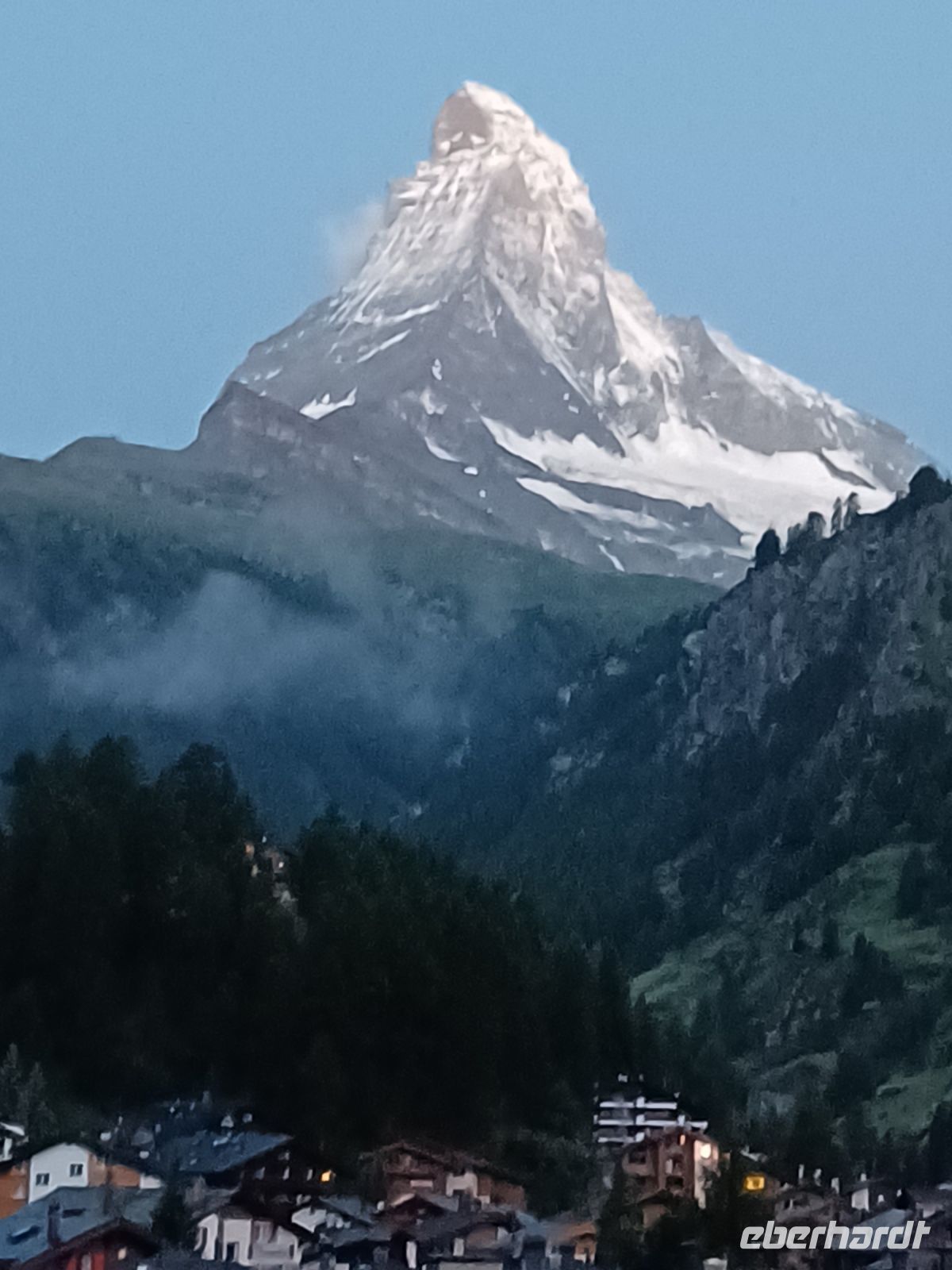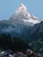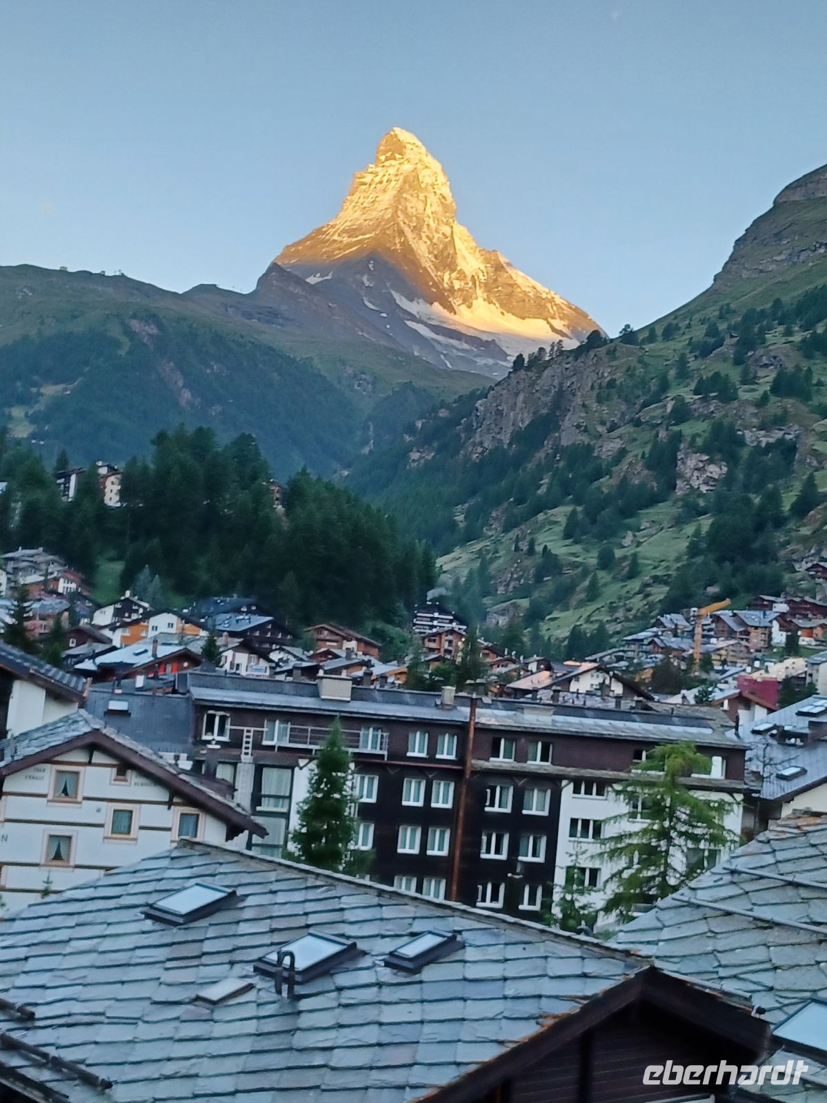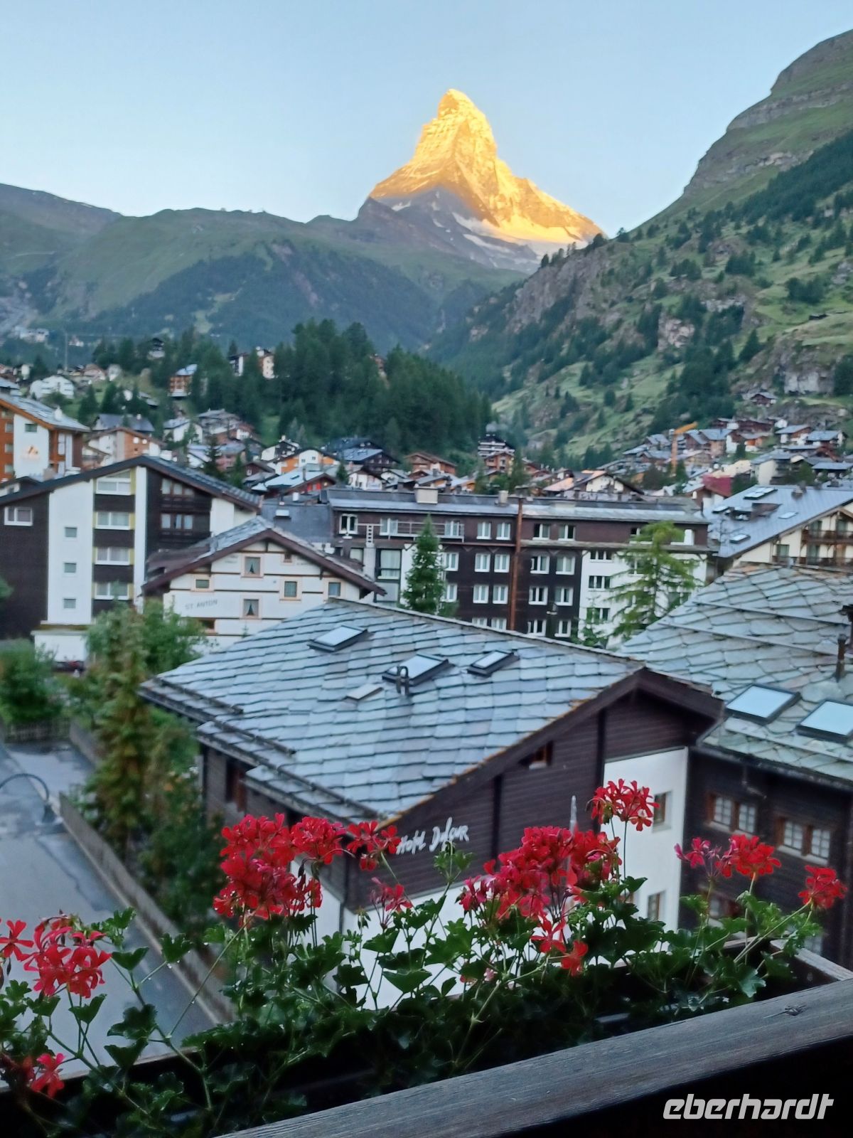 Nach dem Abendessen trifft sich die ganze Gruppe um 20:30 Uhr im Gruppenraum unseres Hotels: wir begehen das Bergfest unserer Reise u. den Zeitpunkt der Sommersonnenwende. Getränke stehen in der Selbstbedienungsbar bereit. In fröhlicher Runde lösen wir einige Bergrätsel des Tages und beschäftigen uns theoretisch in heiterer Vortragsweise mit den Vorbereitungen für eine Besteigung des Matterhorns mit einem privaten Bergführer. Wir werden 1 Jahr benötigen um uns konditionell auf die Tour vorzubereiten. Vielleicht treffen wir uns dann wieder? Doch zunächst setzen wir unsere Grand Tour fort u. reisen am nächsten Tag nach...