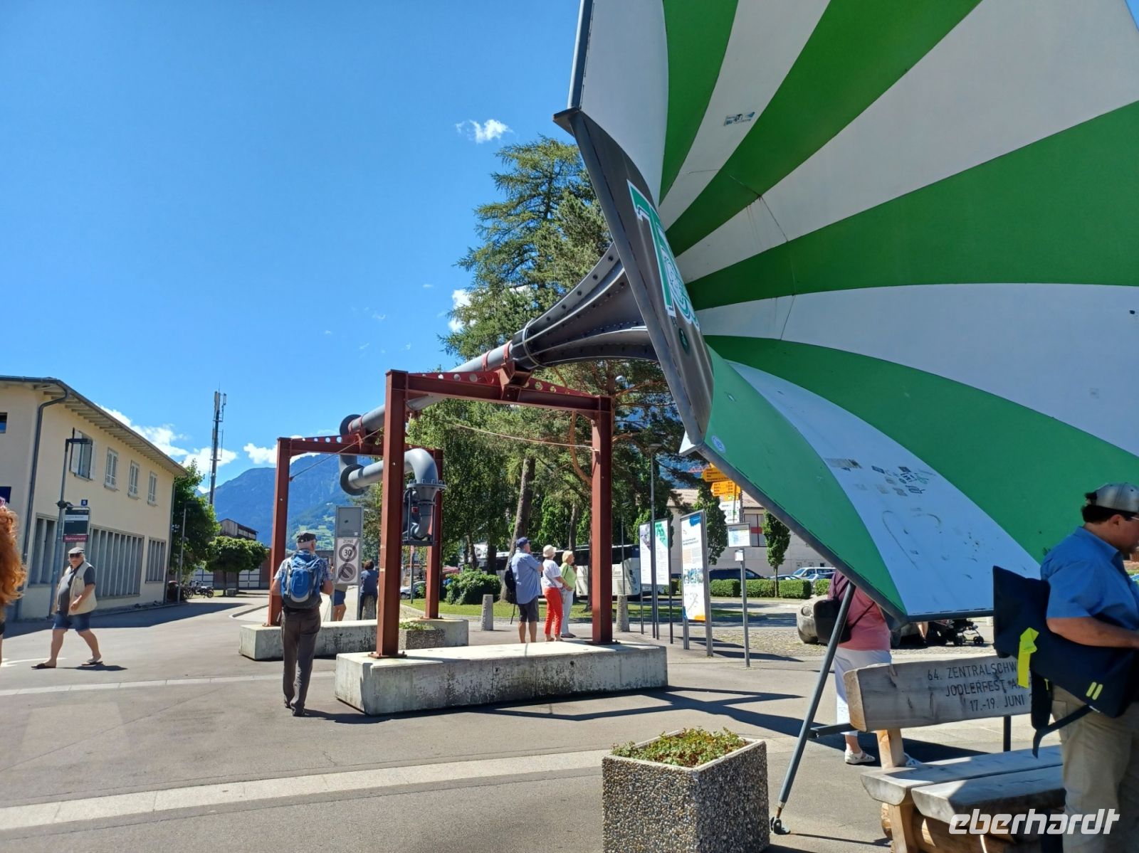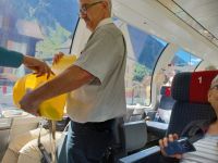 René verschenkt im Namen der Bahn Ansichtskarten mit dem Gotthard Express u. übernimmt den kostenlosen Versand an unsere Liebsten daheim über den gelben mobilen Postkasten.