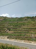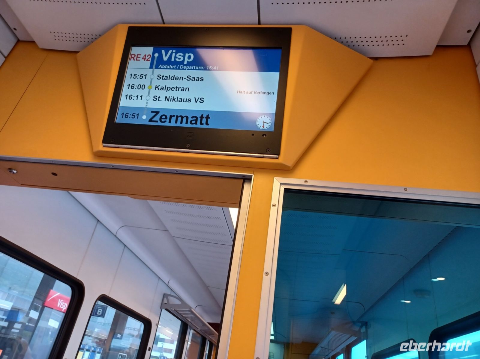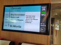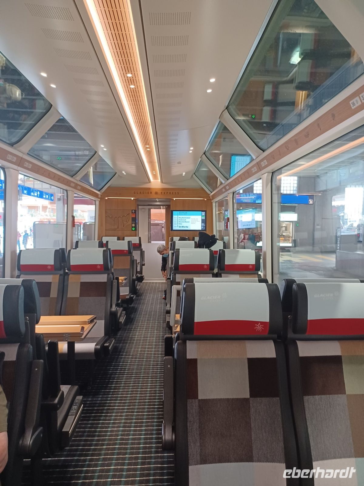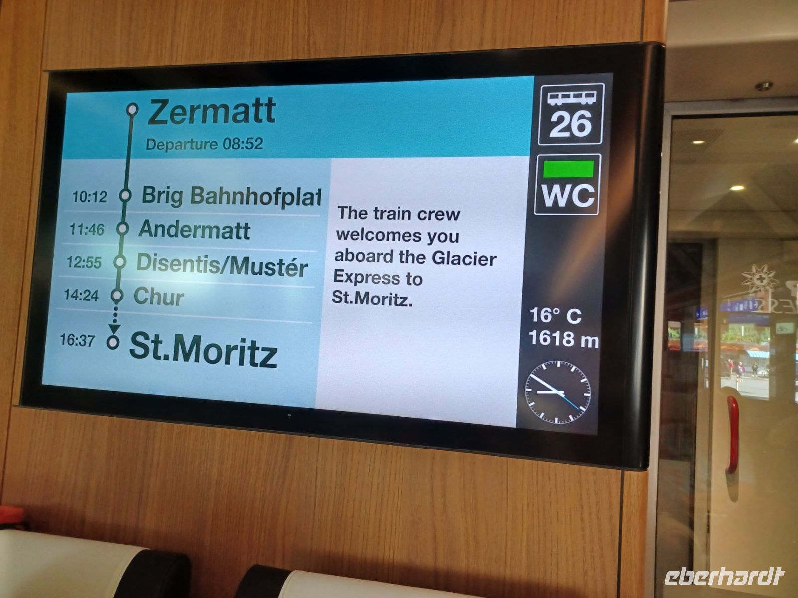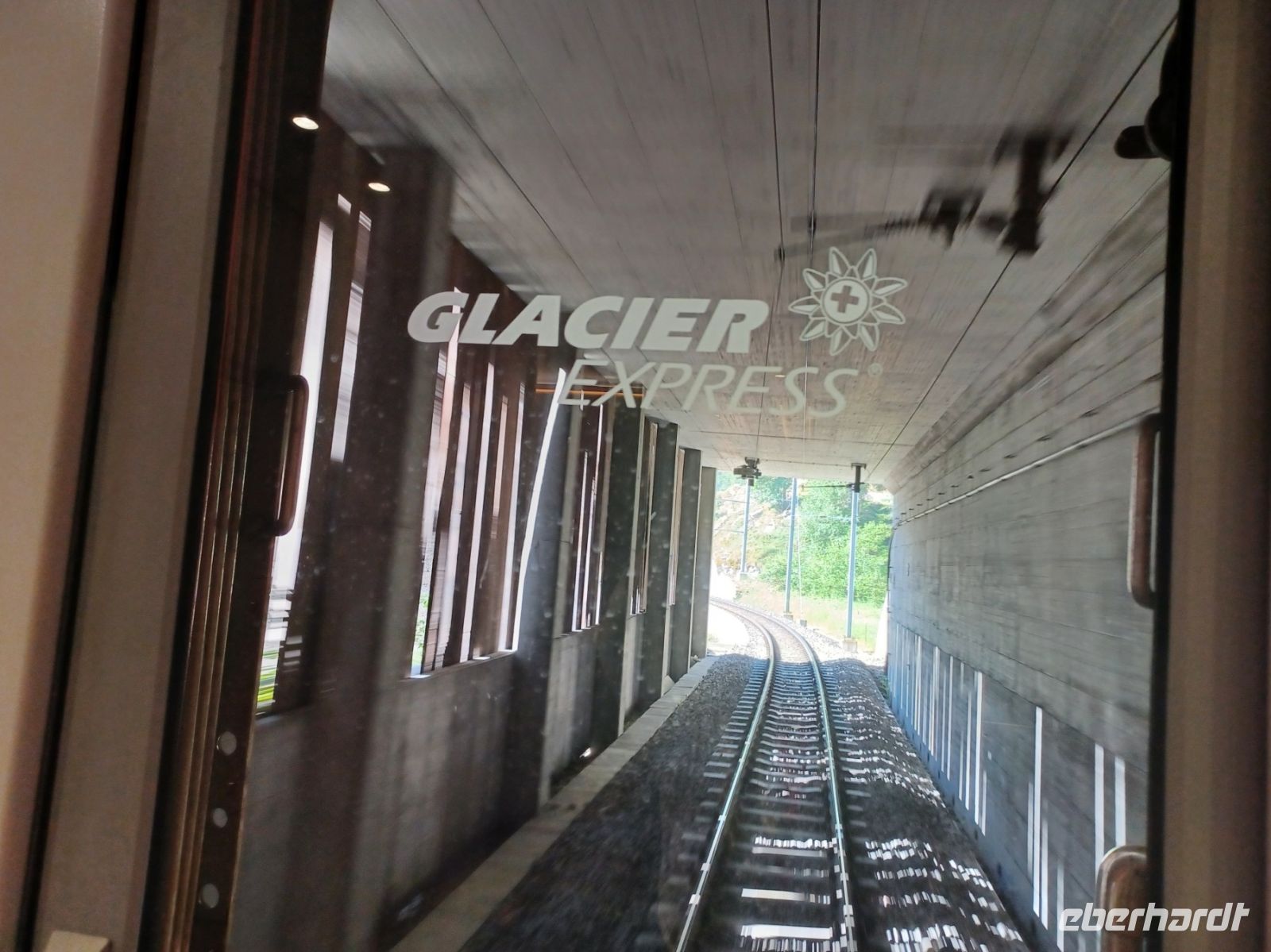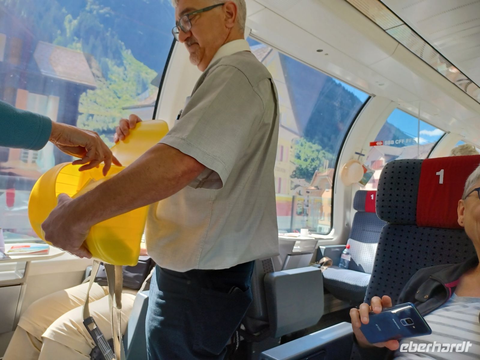 Wer früh am Morgen erwacht, kann an diesem Tag ab 5:30 Uhr das Matterhorn in den verschiedenen Farben der Morgenröte mit der Kamera einfangen: ein wirklich geniales Naturschauspiel. Mit diesem Eindruck verlassen wir Zermatt u. begeben uns in den Kopfbahnhof, wo bereits unser Zug steht. Wir beziehen unsere, von der Reiseleiterin ausgelosten Plätze im Panoramawagen u. werden über 8 h eine einmalige Fahrt bei schönem Wetter erleben. Dabei werden wir mit dem "langsamsten Express der Welt" 291 Brücken u .durch 91 Tunnel fahren. Vorbei an den höchsten Lagen des Schweizer Weinanbaus fahren wir durch den Furkatunnel Richtung Andermatt u. steigen auf den Oberalppass mit Zahnradgestänge. Wir befinden uns auf 2000m Höhe u. sehen schneebedeckte Berggipfel. Just oben schlägt die Mittagszeit u. wir bekommen ein leckeres Tellergericht wirklich am Platz angerichtet. Fleisch u. Beilagen werden artistisch im engen Gang auf Tellern angelegt.