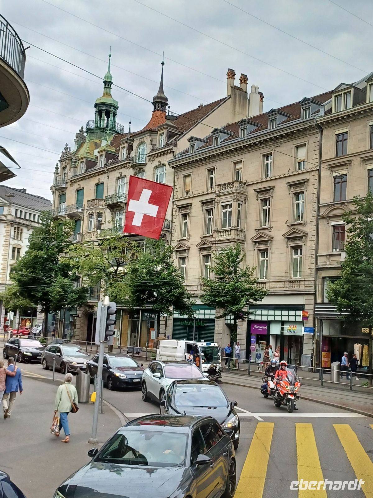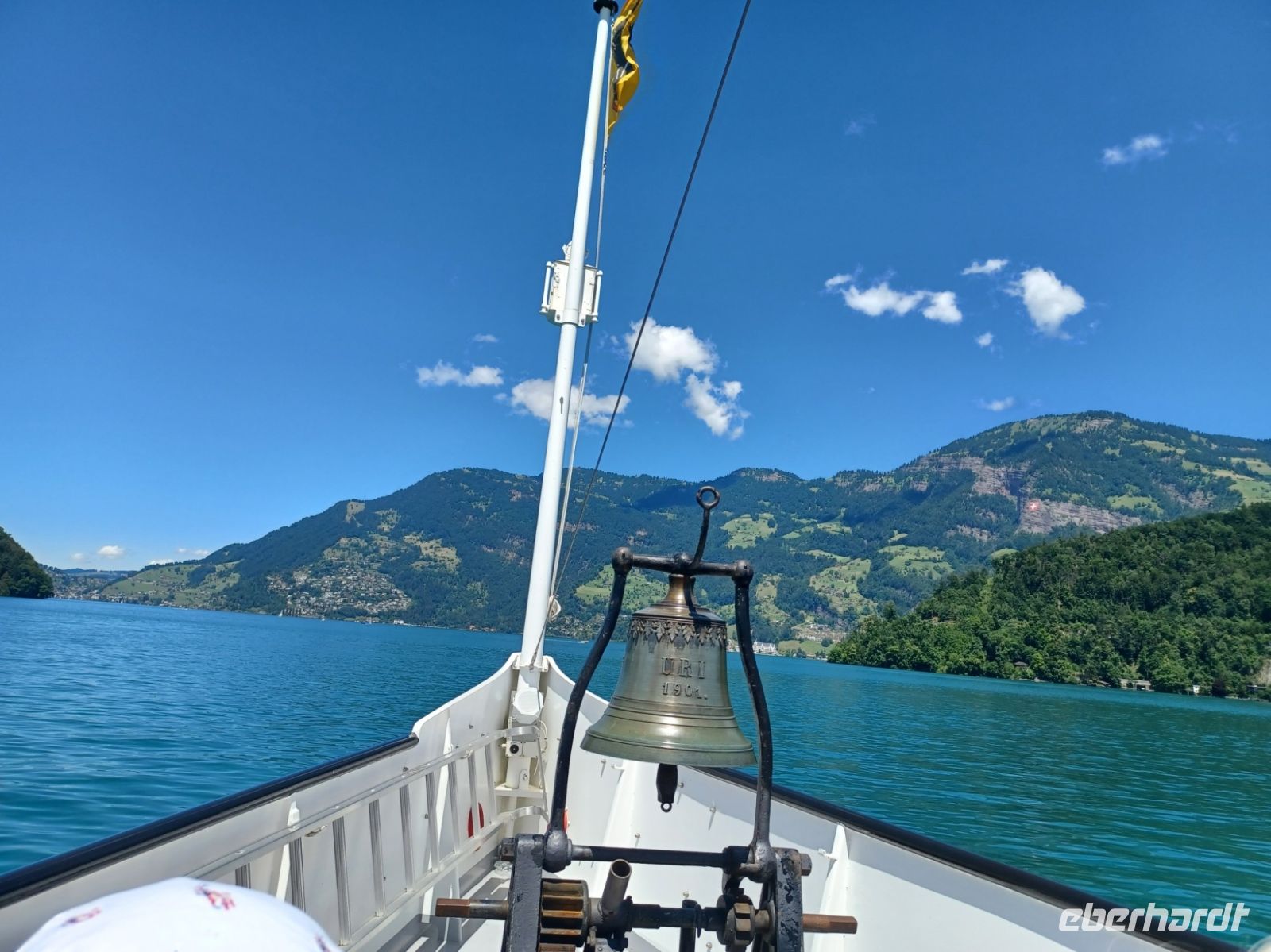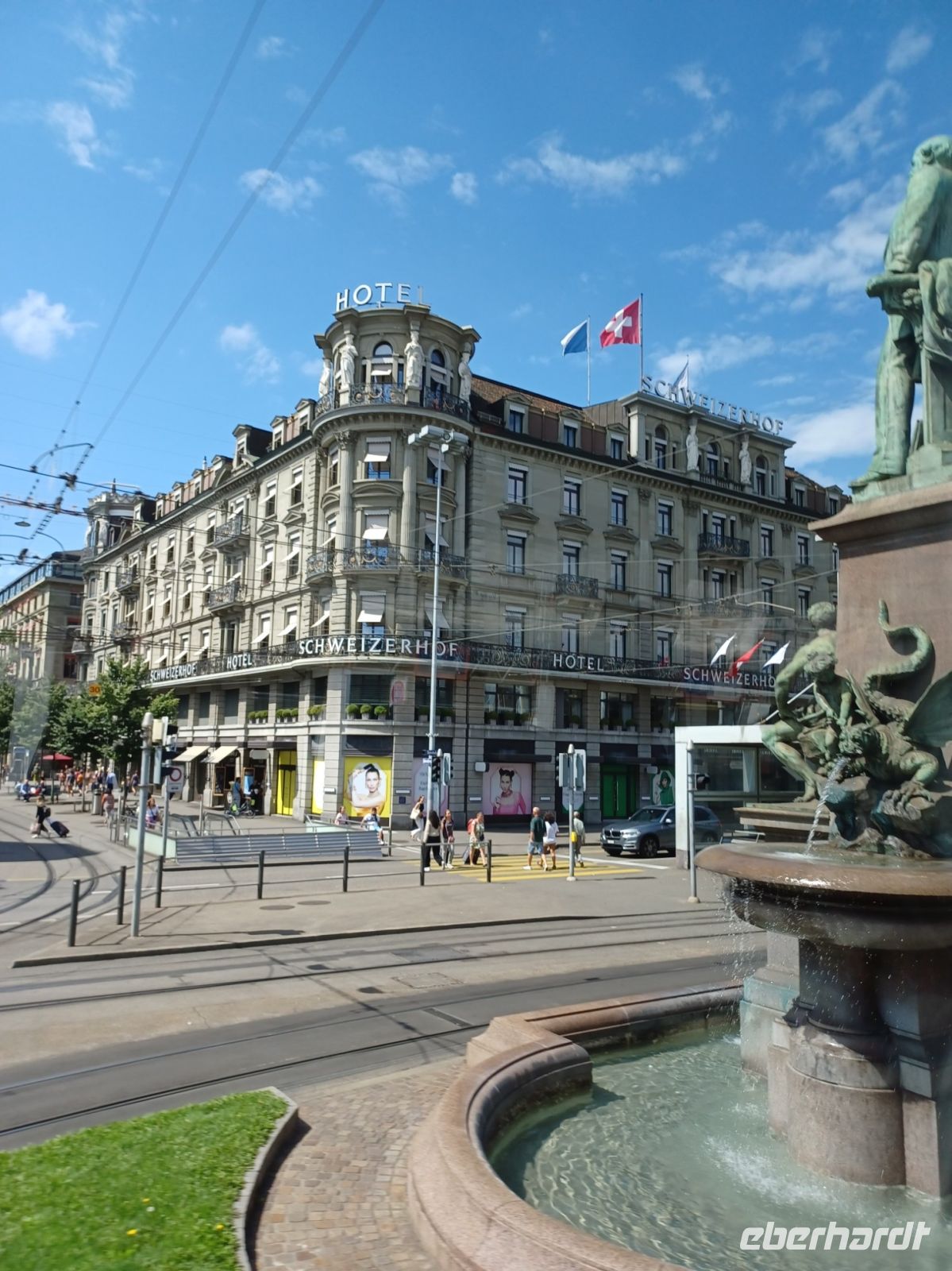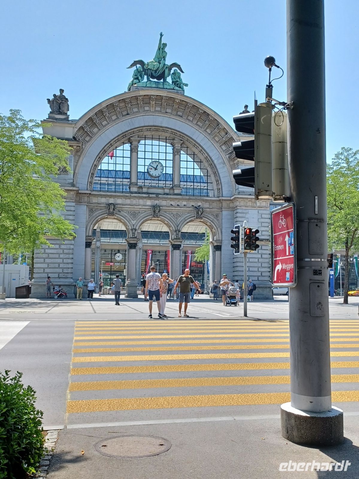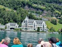 In Flüelen wechseln wir auf das Dampfschiff nach Luzern. Wieder erwartet uns ein technisches Highlight. Der Schaufelraddampfer präsentiert im Innern den Gästen seine arbeitende zischende Dampfmaschine. Rot-Golden angestrichen zieht sie uns in den Bann. Durch ein Schaufenster sehen wir, wie sich das Schaufelrad durch das Wasser arbeitet. An Deck die Seenlandschaften, im Hintergrund die Bergwelt.: Entzückende Anleger mit alten Holzhhäusern, kleinen, in Fels gehauene Kirchen, moderne Wohnquadrate, die wie verglaste Schwalbennester an den Hängen kleben. So fahren wir fast 3 Stunden u. gelangen über den Alpnacher See u. Vierwaldstättersee nach Luzern. Die Berge Pilatus u. der Rigi grüßen uns von den Ufern bei Luzern. 1,5 h Aufenthalt in Luzern-Zeit zum Kaffeetrinken am See. Die Innenstadt am Samstag ist menschengefüllt, es gibt ein Stadtfest. Wir verabschieden uns von der schönen Stadt u. reisen 1 h mit dem Zuge zu unserem letzten Haltepunkt-Zürich.