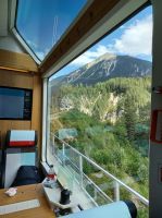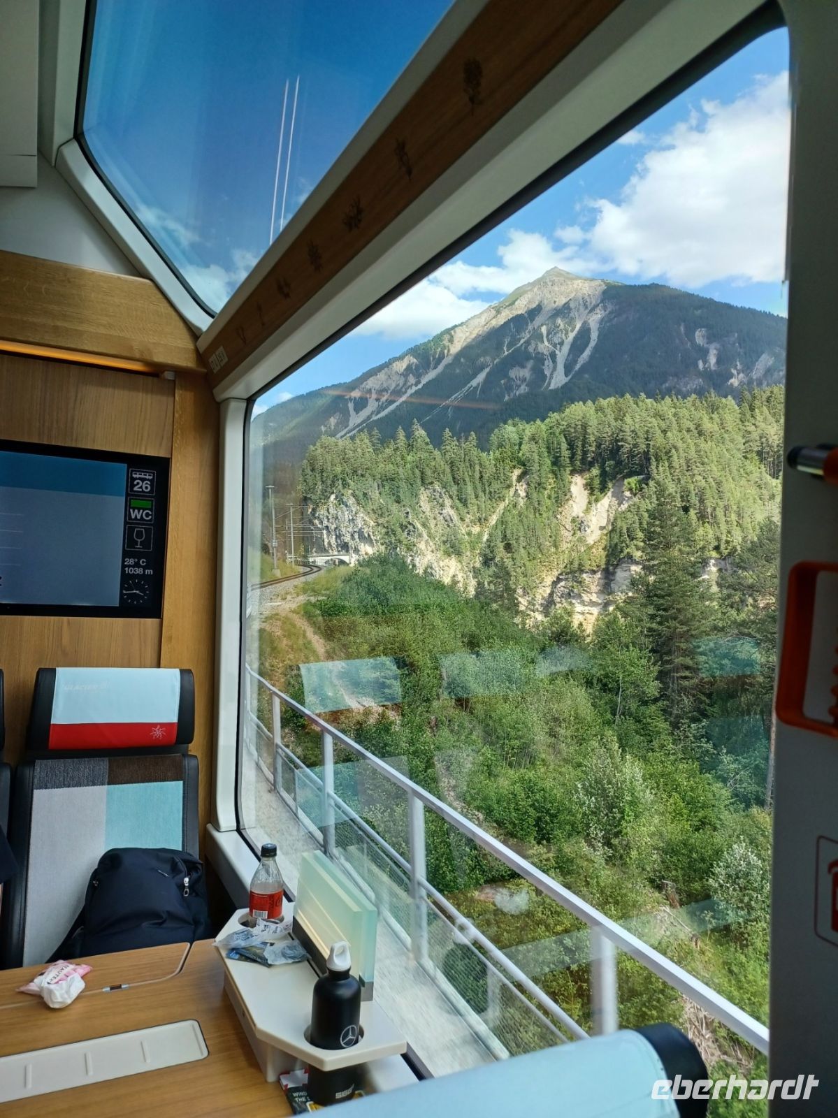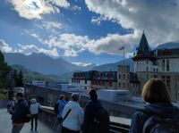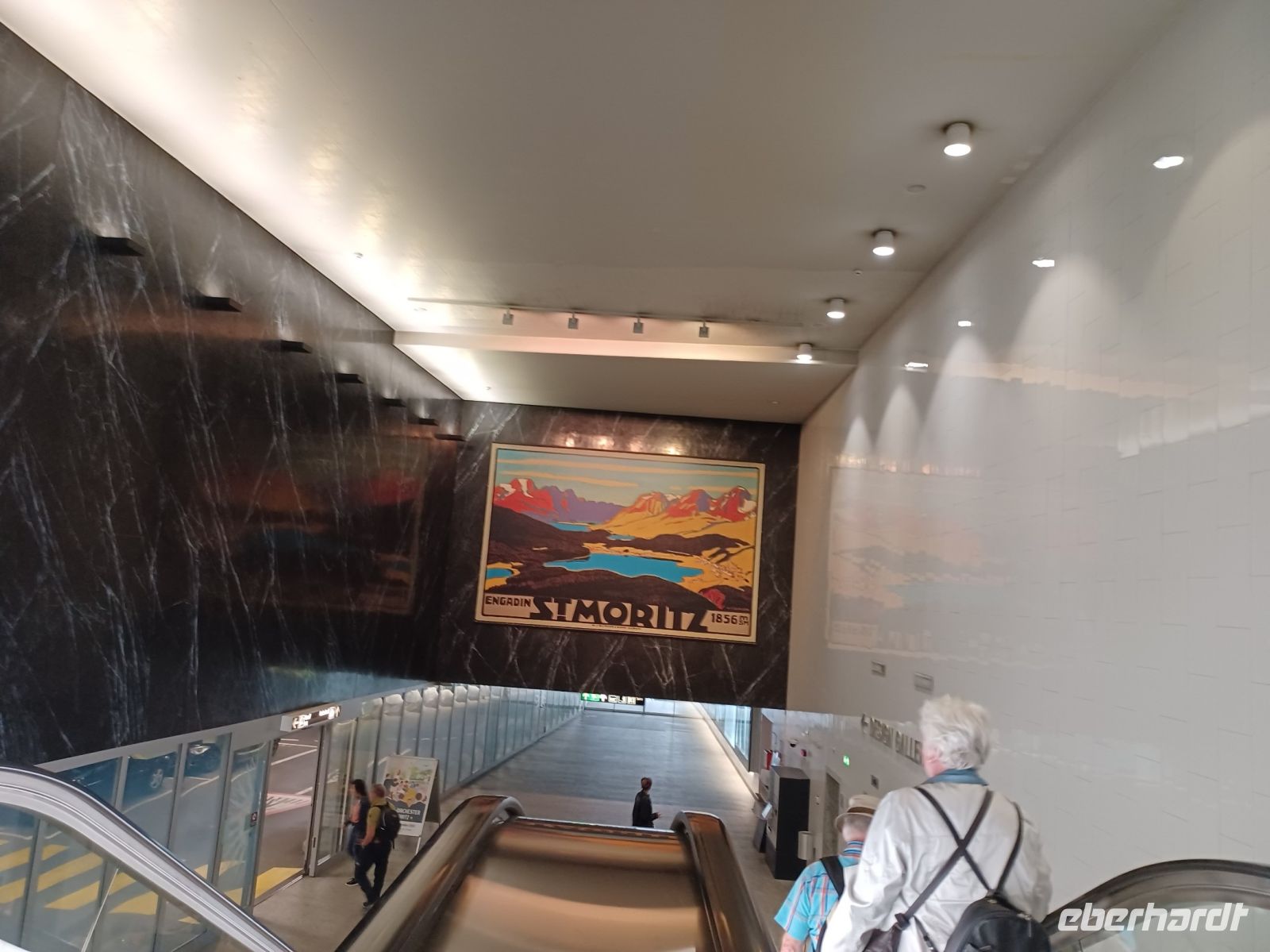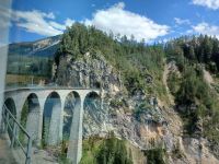 Im Ort Disentis im Tal wird die Zahnradlok getauscht, da wir den höchsten Punkt per Zahnradantrieb überwunden haben. In der Ferne kann man das Benediktkloster erspähen. Es folgt die atemberaubende Rheinschlucht, wo Vorder-u. Hinterrhein zusammentreffen. In der historischen Graubündner Hauptstadt Chur steigt die uns begleitende amerikanische Reisegruppe aus u. es wird ruhiger im Wagon. Wir genießen die verbleibenden 2 h Stunde Fahrt. Auf der UNESCO-Strecke Albula beschert uns das beeindruckende Landwasserviadukt (65 m hoch u. 142 m lang) einen weiteren Höhepunkt. Mit seinem Bogen überwinden wir das Landwassertal u. schlängeln uns schließlich nach ST. Moritz mit einer Höhenlage von 1822 m.