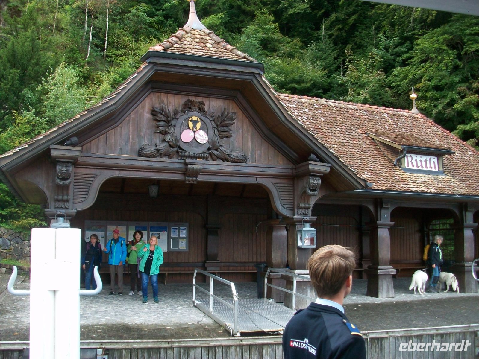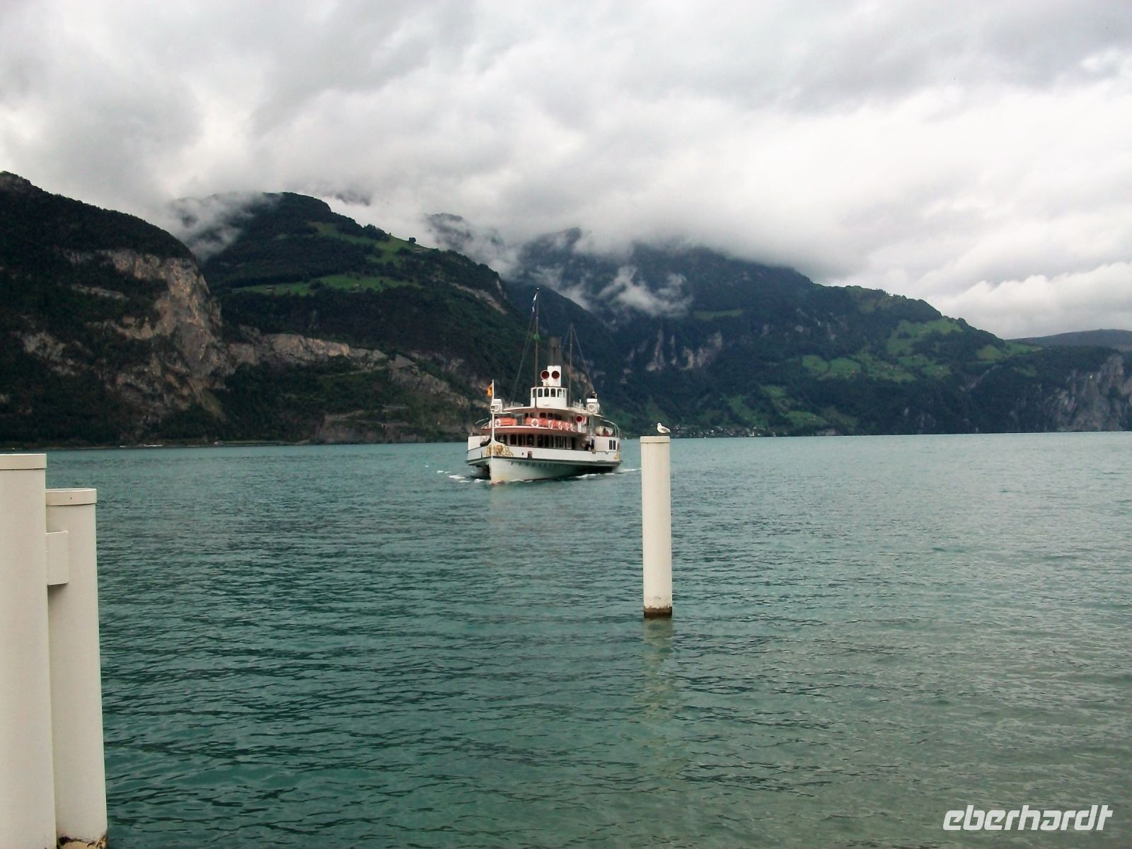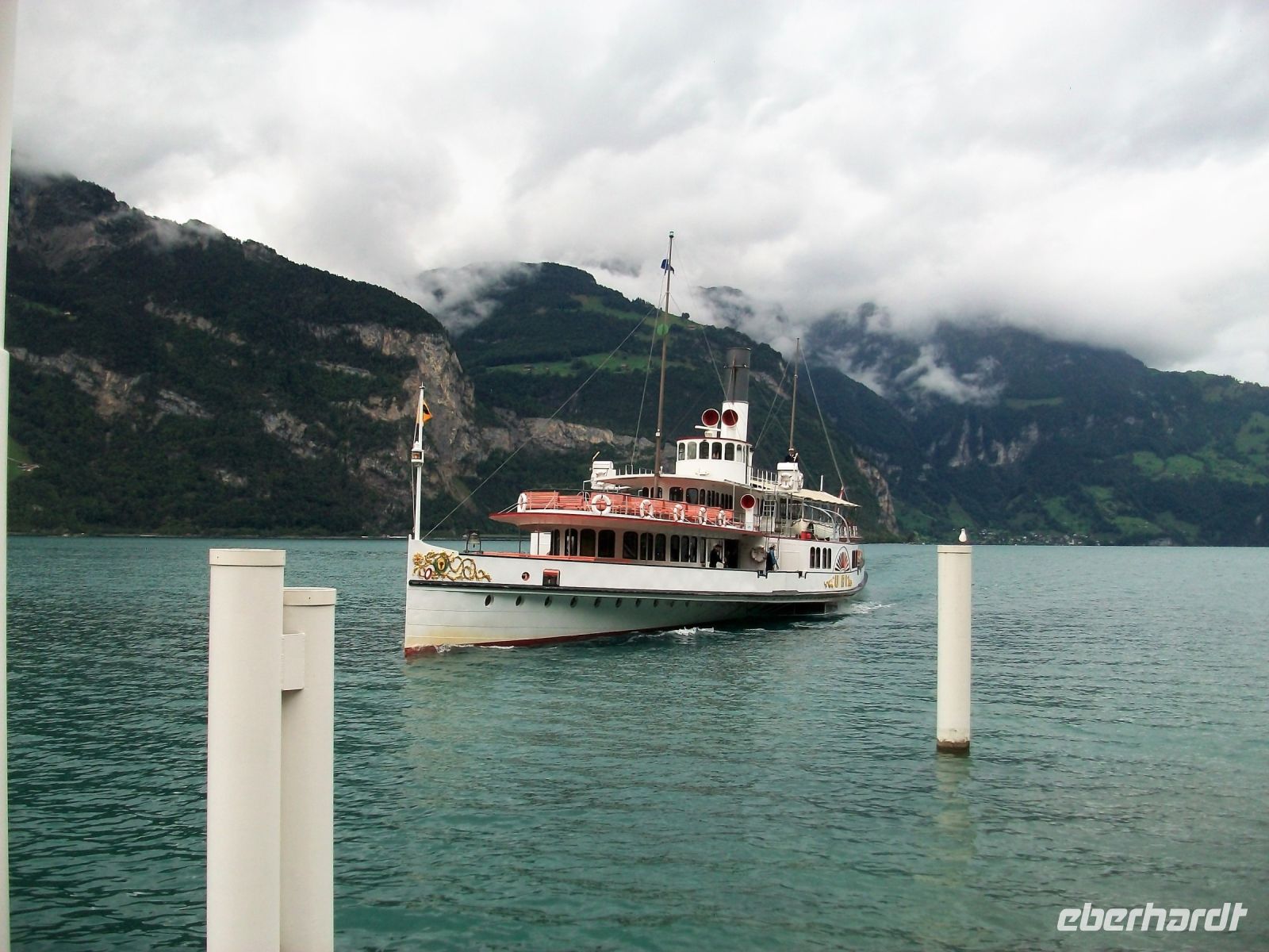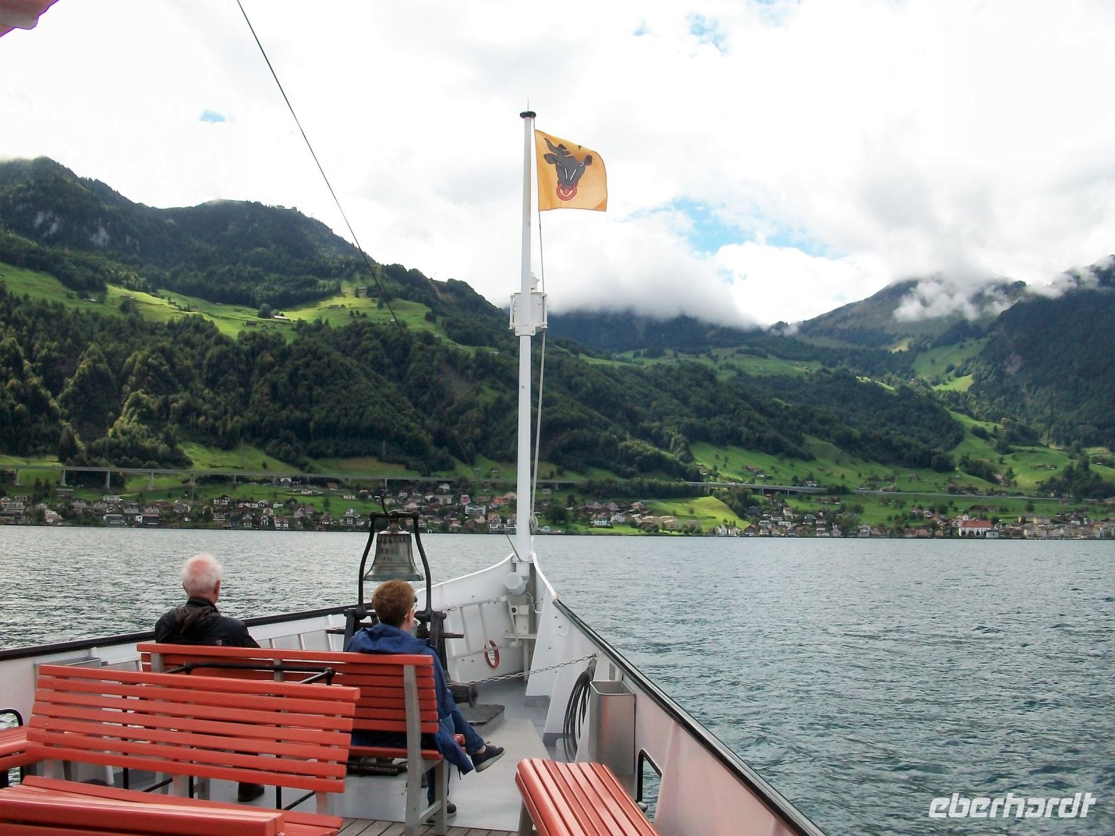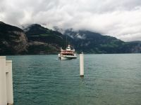 In Flüelen endet die Zugfahrt; unsere Reiseleiterin auf dem Zug verabschiedet sich und schon nach knapp einer halben Stunde kommt der Dampfer angeschnauft der uns ans andere Ende des Vierwaldstätter Sees, nach Luzern bringen wird.