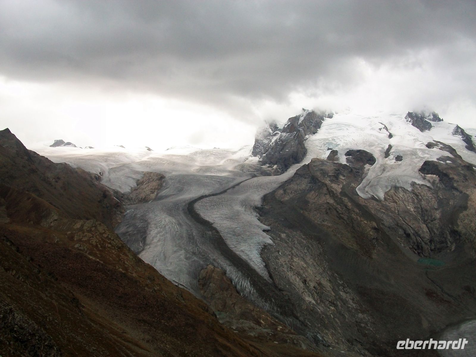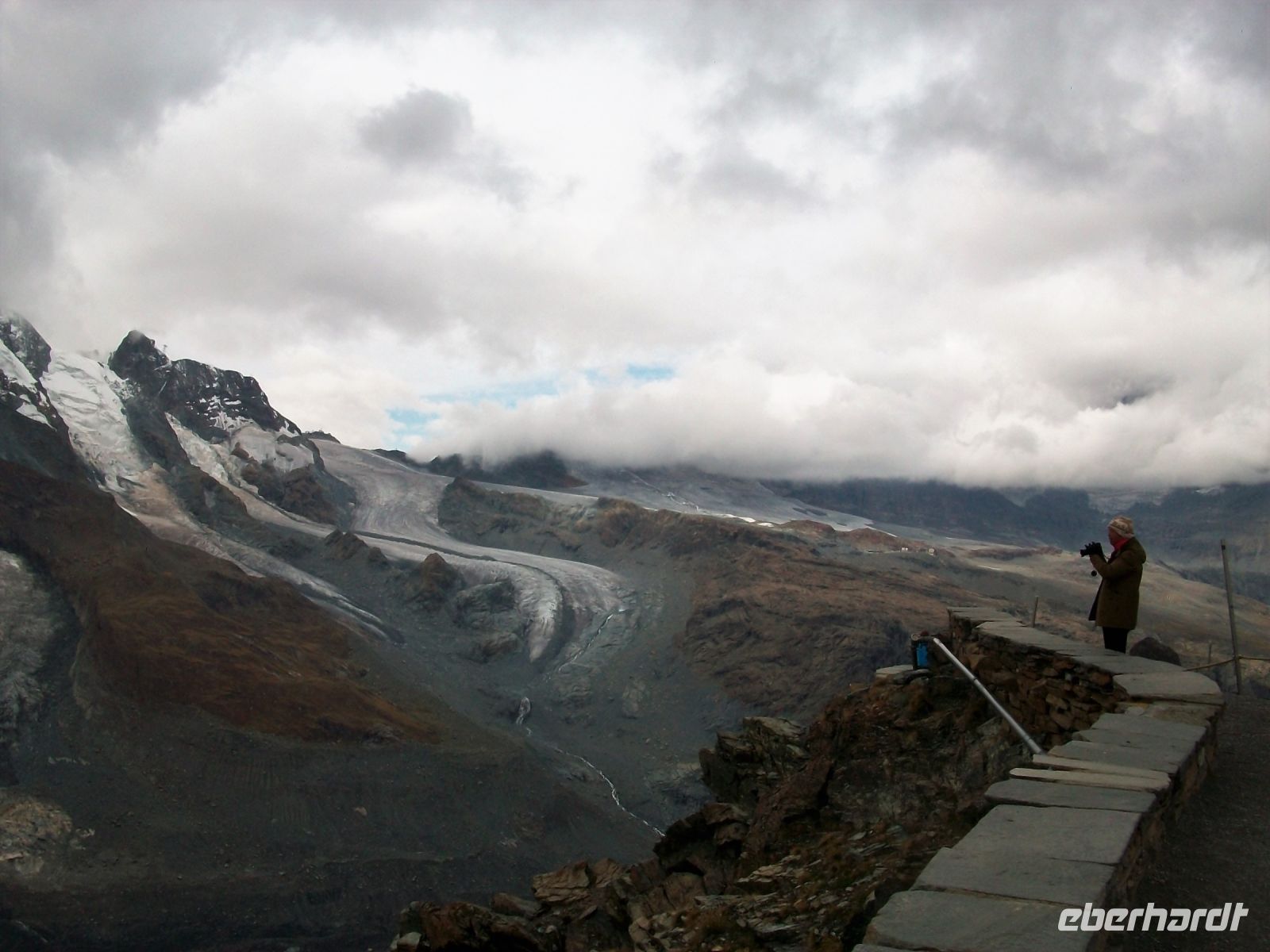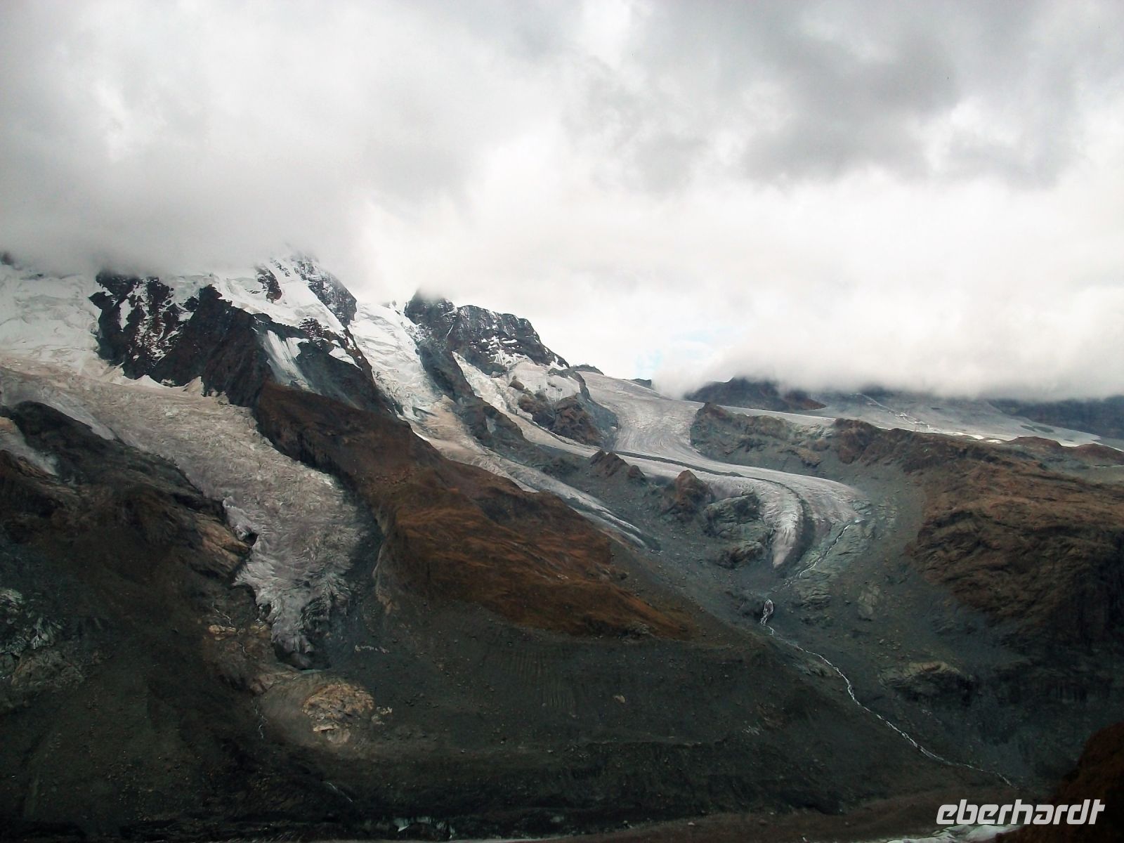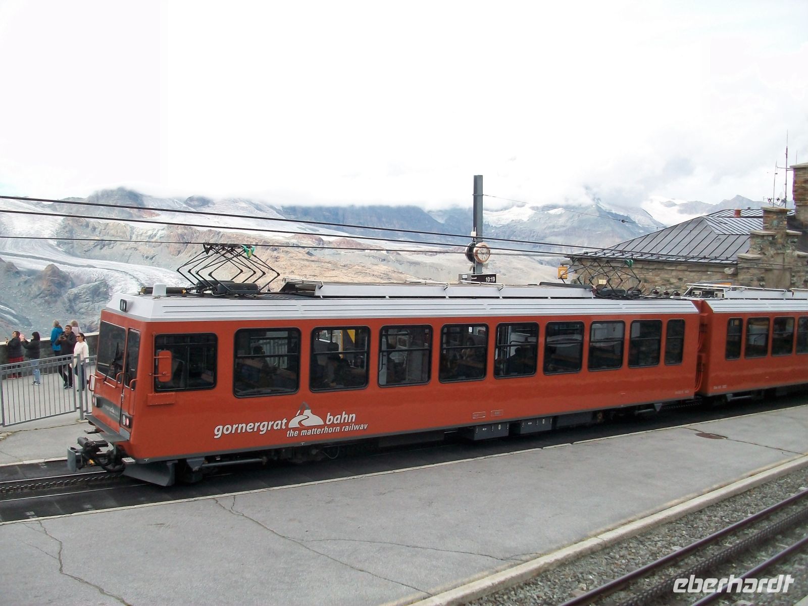 Nun beginnt ein großes Abenteuer; wir wollen mit dieser einmaligen Zahnradbahn über Dreitausend Meter ins Reich der Murmeltiere aufsteigen. In zahlreichen Kurven schlängelt sich der Zug den Wolken entgegen; uns umgibt nun die schroffe und malerische Bergwelt mit zahlreichen Viertausendern deren Spitzen uns heute jedoch verborgen bleiben. Trotz allem ist die Auffahrt ein Genuss; wir kommen den Bergen immer näher, sehen die gigantischen Gletscher und als wir oben anlangen, zeigt sich uns doch ein recht ordentlichen Panorama. Immer wieder schweift der Blick zum Matterhorn, es wird sich uns heute nur in Teilen zeigen, schade.