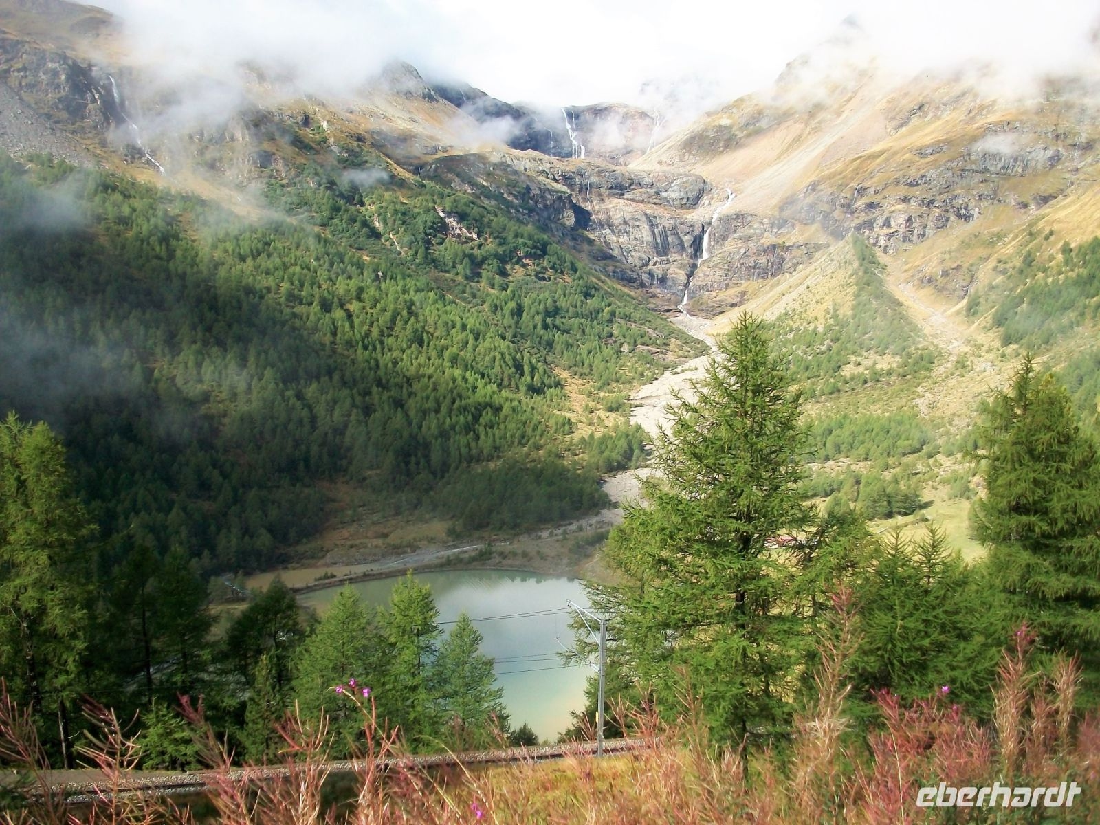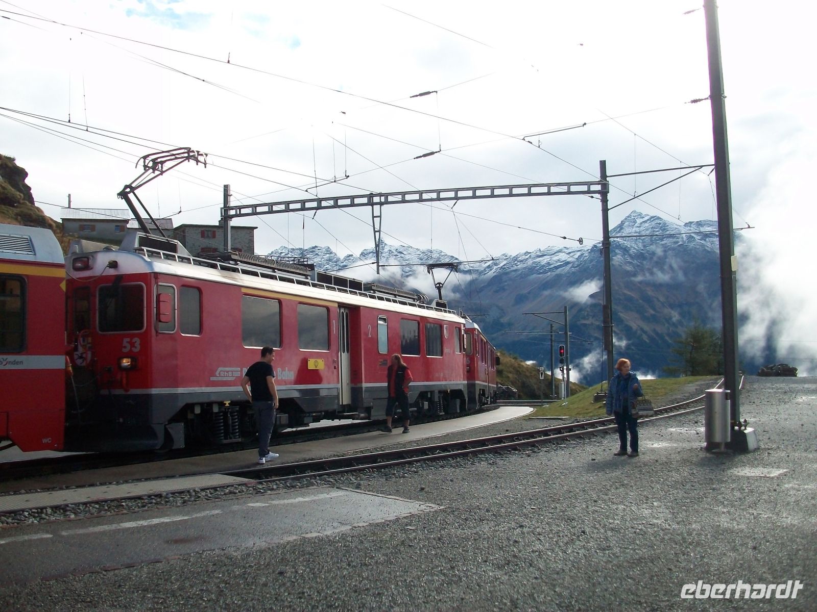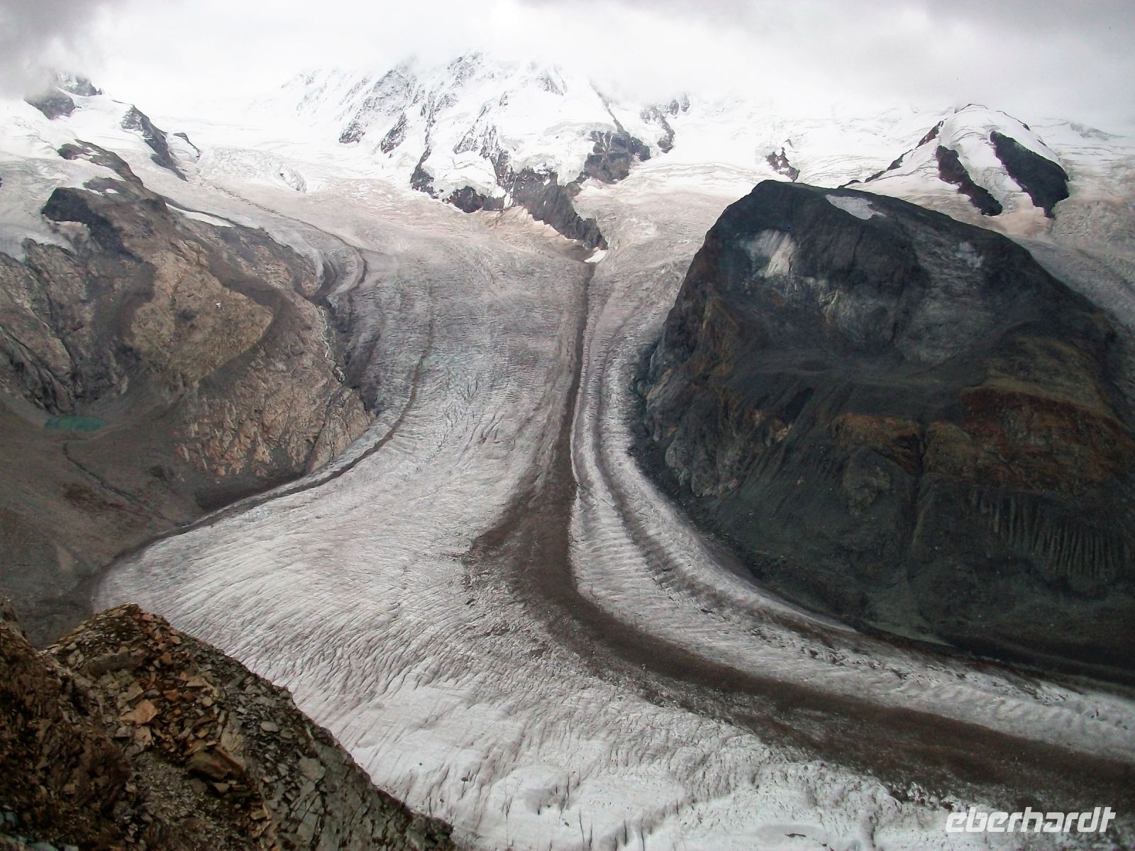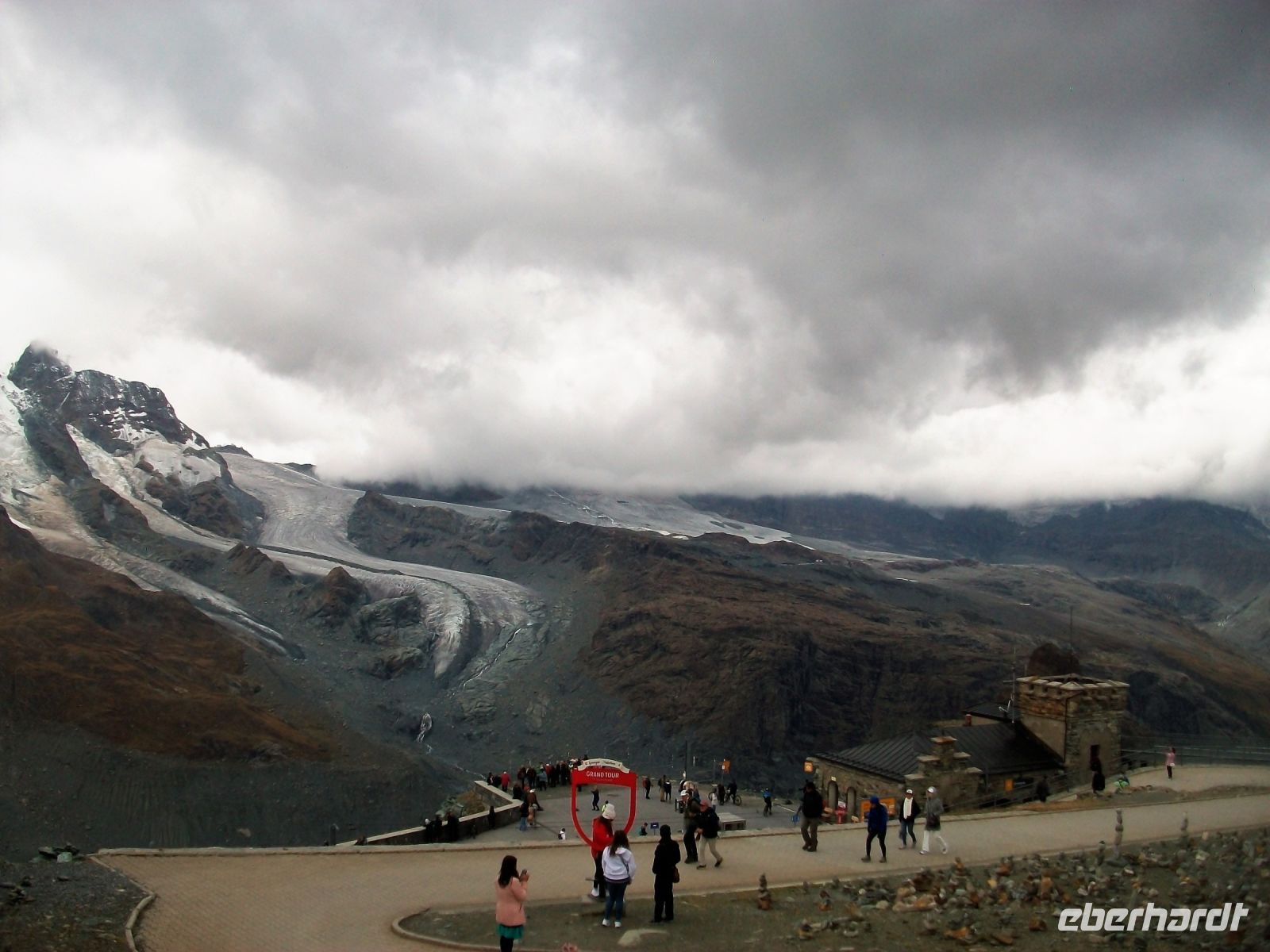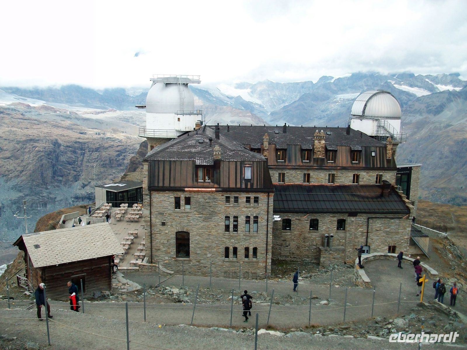 Nun beginnt ein großes Abenteuer; wir wollen mit dieser einmaligen Zahnradbahn über Dreitausend Meter ins Reich der Murmeltiere aufsteigen. In zahlreichen Kurven schlängelt sich der Zug den Wolken entgegen; uns umgibt nun die schroffe und malerische Bergwelt mit zahlreichen Viertausendern deren Spitzen uns heute jedoch verborgen bleiben. Trotz allem ist die Auffahrt ein Genuss; wir kommen den Bergen immer näher, sehen die gigantischen Gletscher und als wir oben anlangen, zeigt sich uns doch ein recht ordentlichen Panorama. Immer wieder schweift der Blick zum Matterhorn, es wird sich uns heute nur in Teilen zeigen, schade.