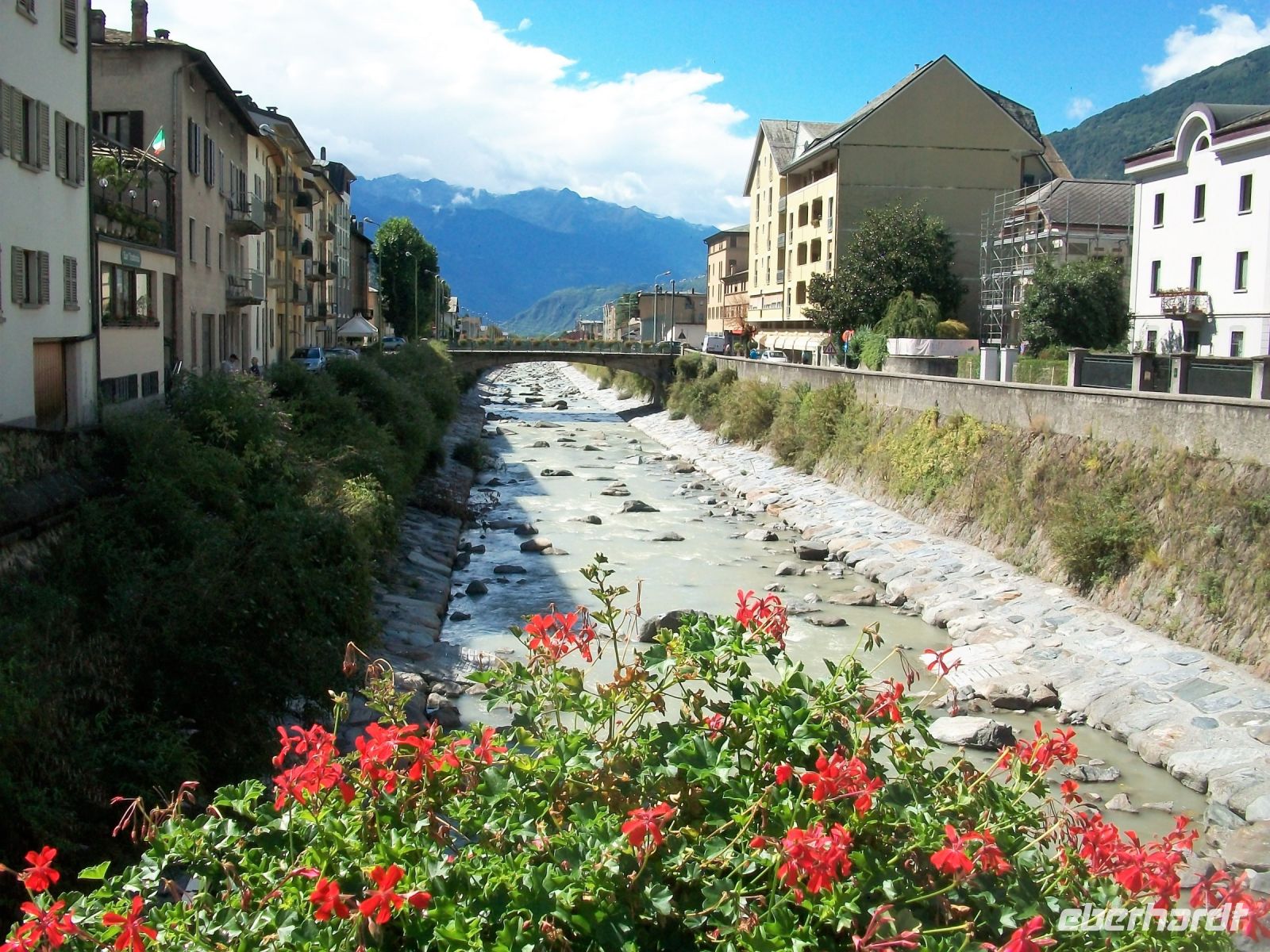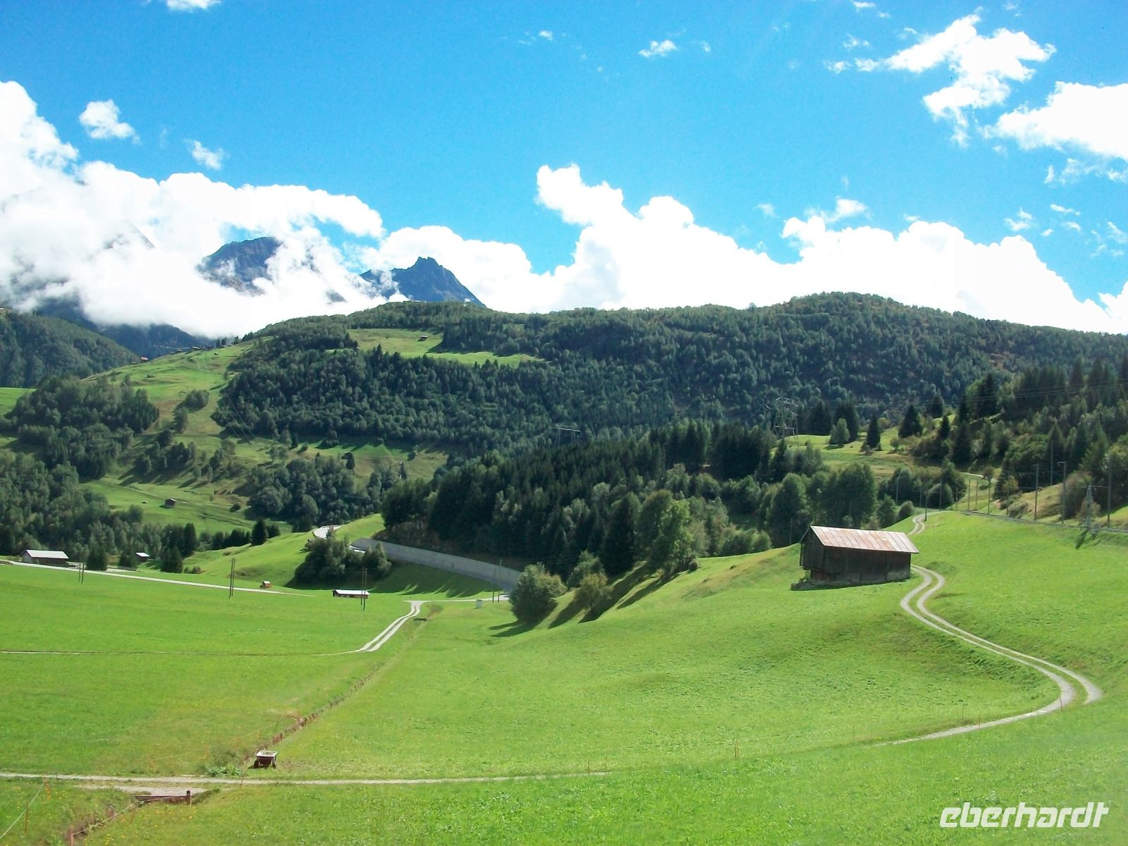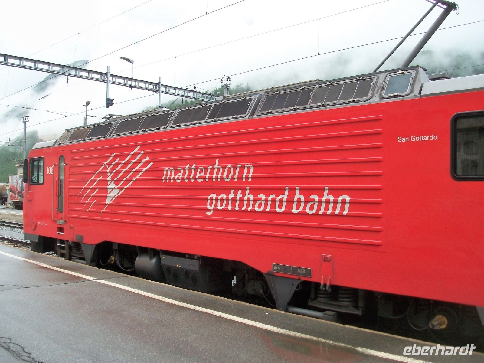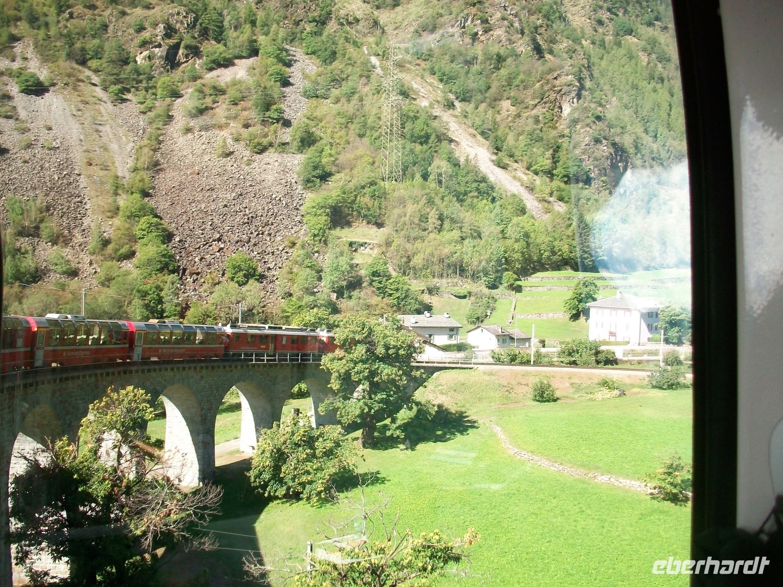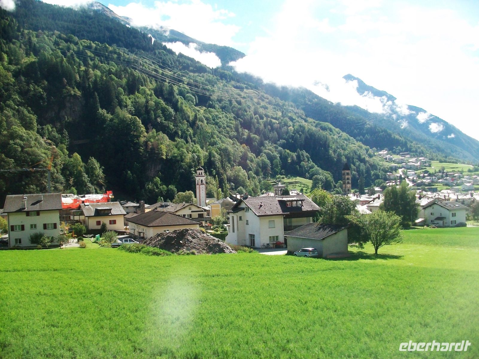 Als wir wieder am Tageslicht anlangen, haben sich graue Wolken an die Berge gehängt; aber bei unserer Weiterfahrt bessert sich das Wetter wieder. Auch hier bringen uns zahlreiche Kehrtunnel hinab; besonders deutlich zeigt sich uns diese Streckenführung bei Wassen: An der Kirche dieses Ortes fahren wir gleich dreimal vorbei!