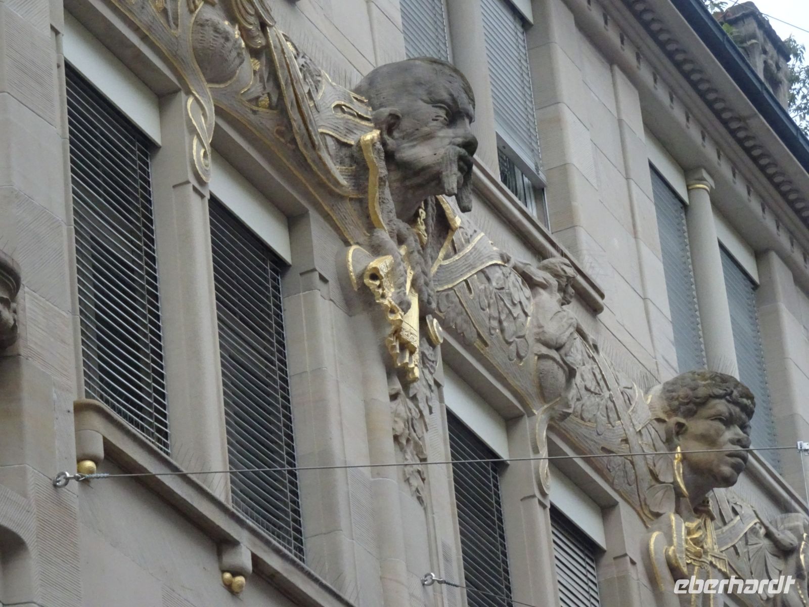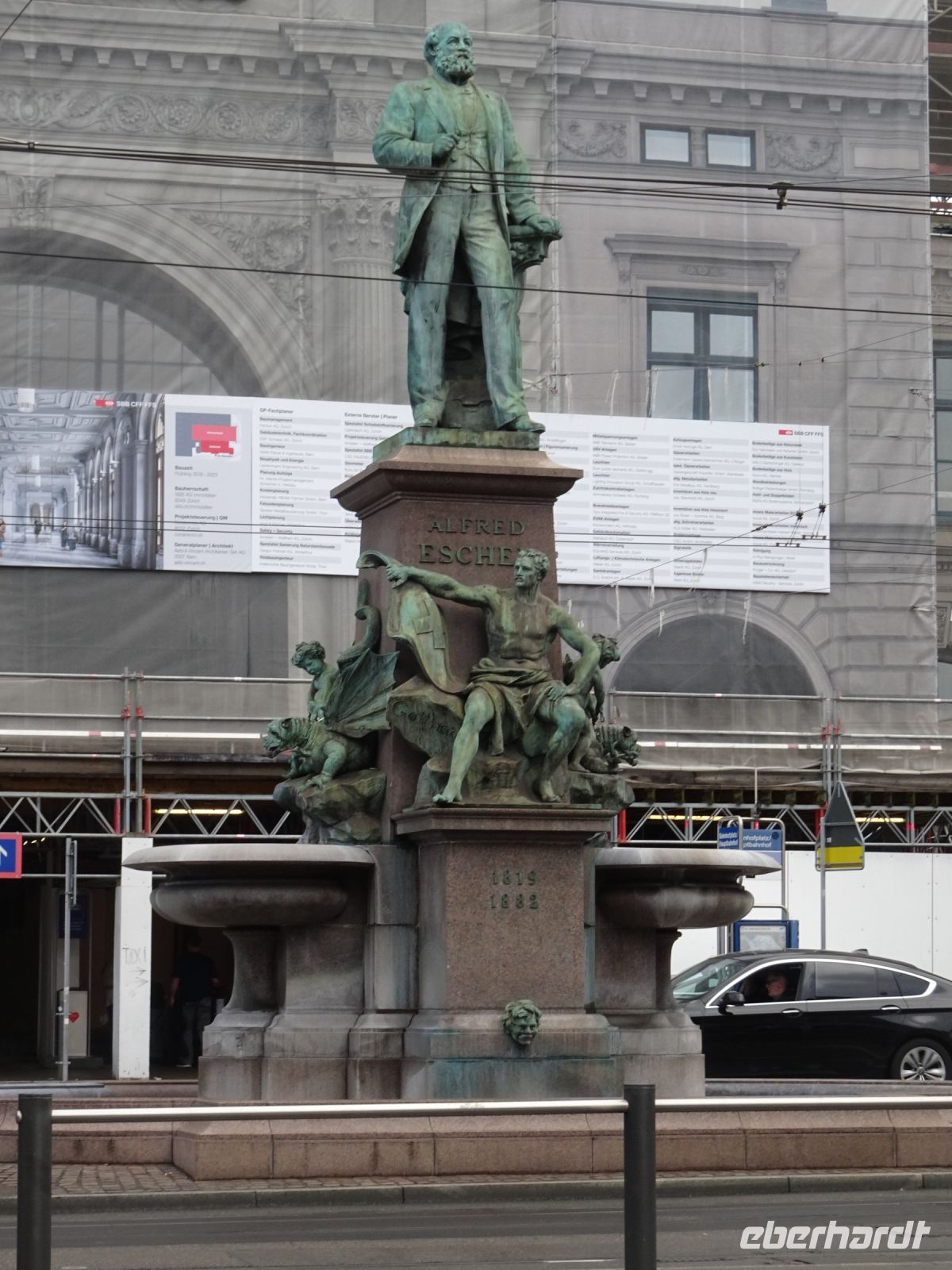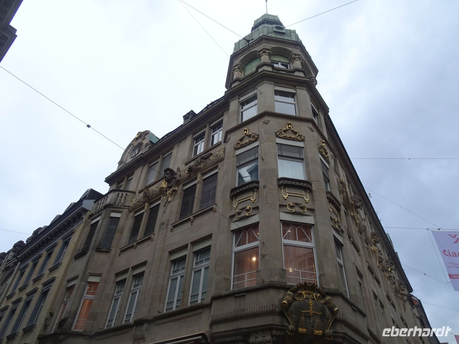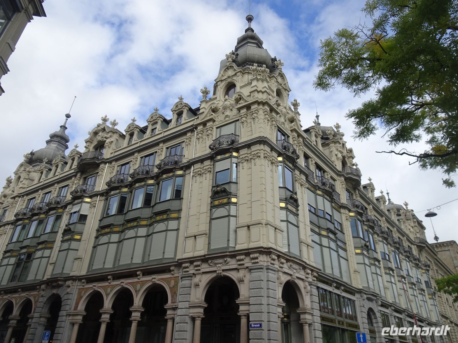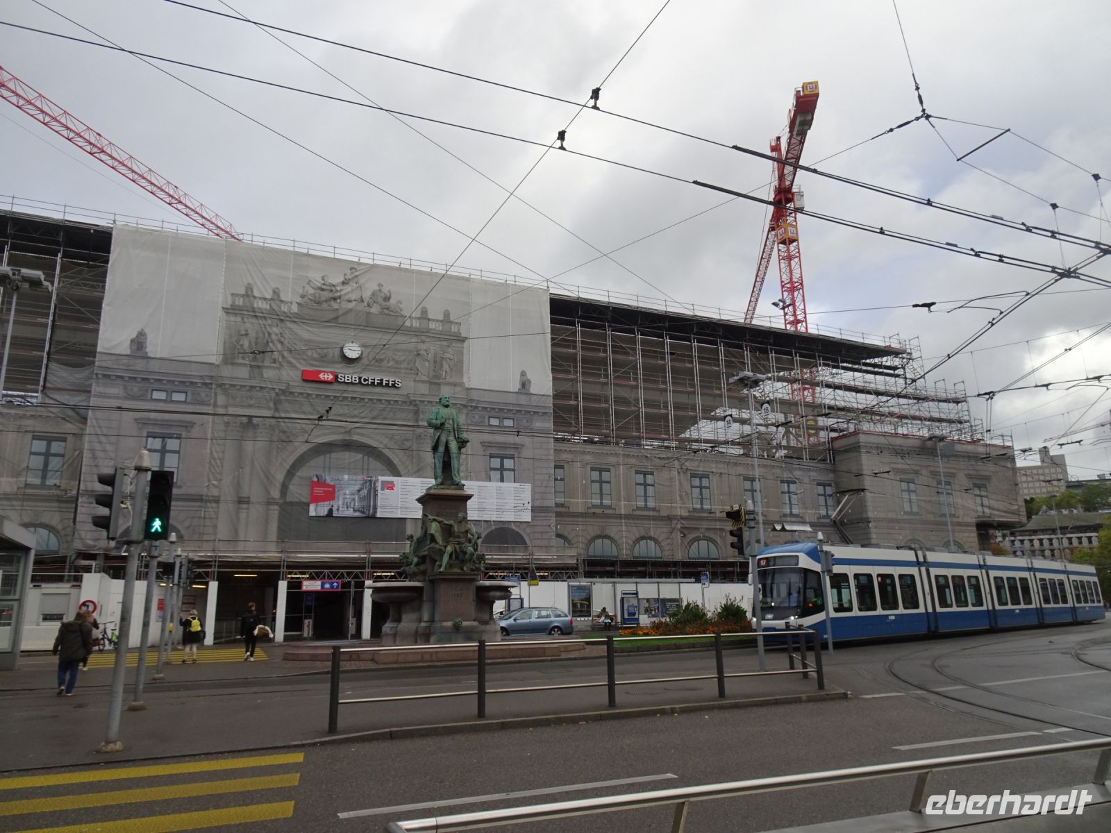 Durch den hochmodernen und in der historischen Substanz noch im Umbau befindlichen Bahnhof ging es am Denkmal von Alfred Escher vorbei in die Bahnhofsstraße. Mit geschlossenen Geschäften am heutigen Sonntag konnte man die Architektur dieser ersten Geschäftsstraße in der Schweiz noch besser genießen,