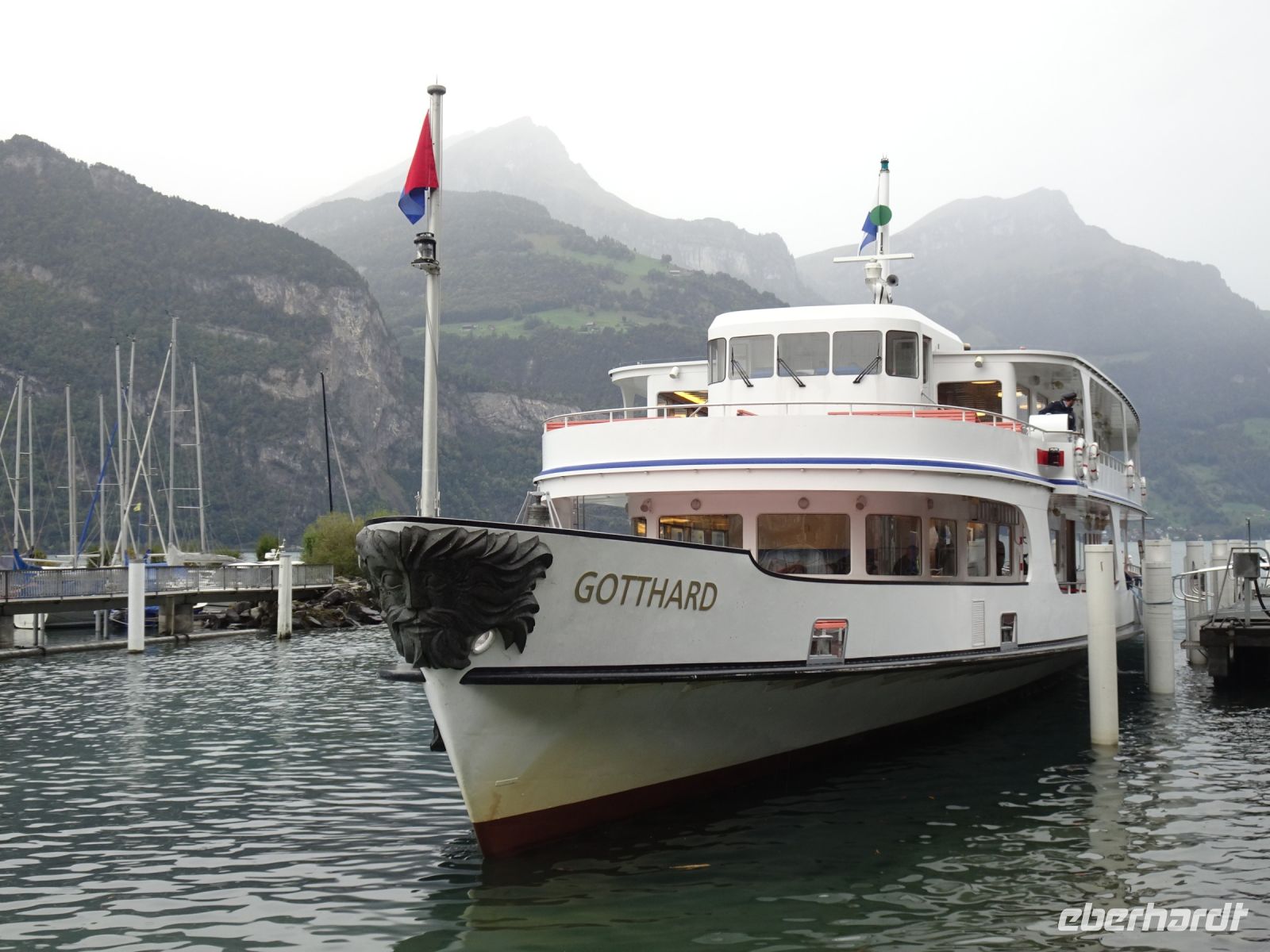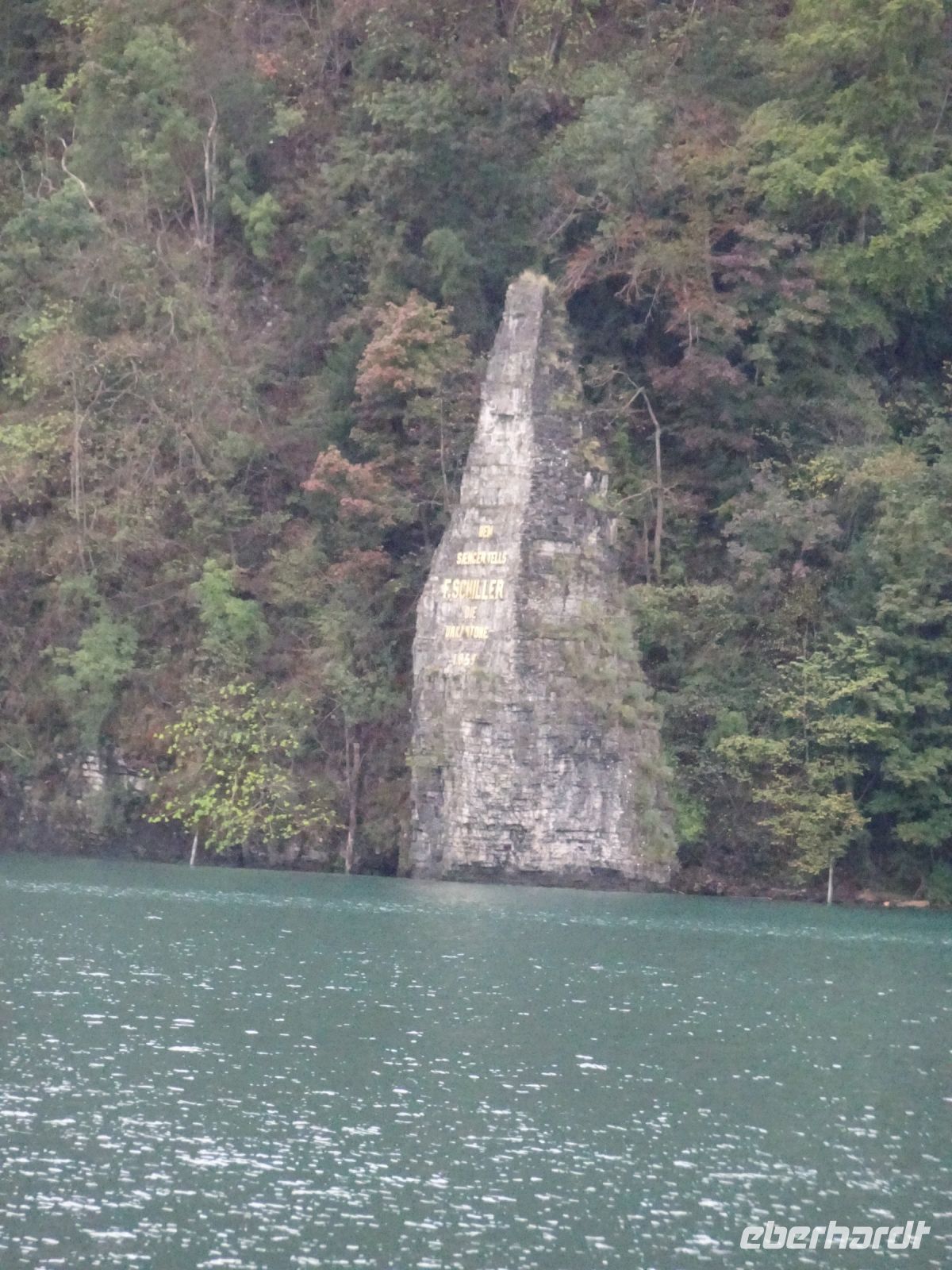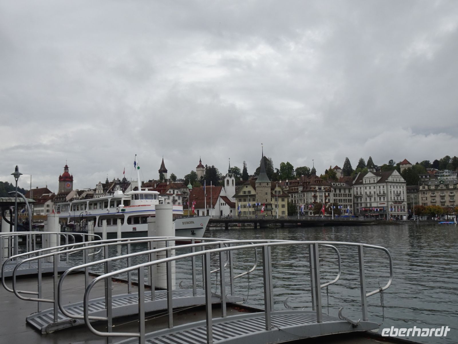 In Fluelen erwartete uns dann auf dem Vierwaldstättersee das Schiff Gotthardt, um vorbei an den Haltepunkten Tellsplatte und Rütli die tratitionsreichen Orte des Tellweges im Überblick kennenzulernen. Kurz zu sehen: der Gedenkstein für Friedrich Schiller im See. Ein Faltblatt an Bord gab weitergehende Erläuterungen. Nach fast 3 Stunden Fahrt, vorbei an den Orten Brunnen, Vitznau mit der Rigi-Auffahrt und Weggis, erreichten wir Luzern. Viele Schausteller am Ufer sorgten zwar für einen bunten Empfang, über ein besseres Wetter mit Sicht auch auf Bürgenstock und den Hausberg Pilatus hätten wir uns mehr gefreut....