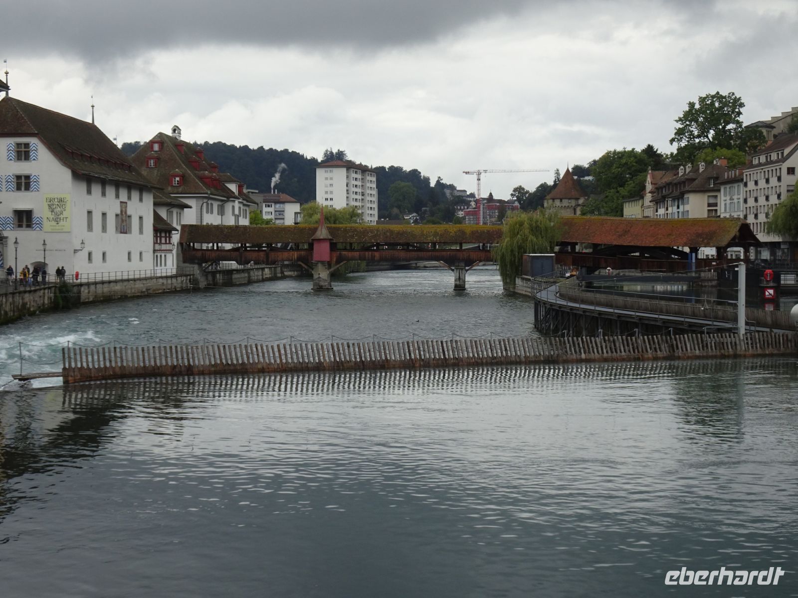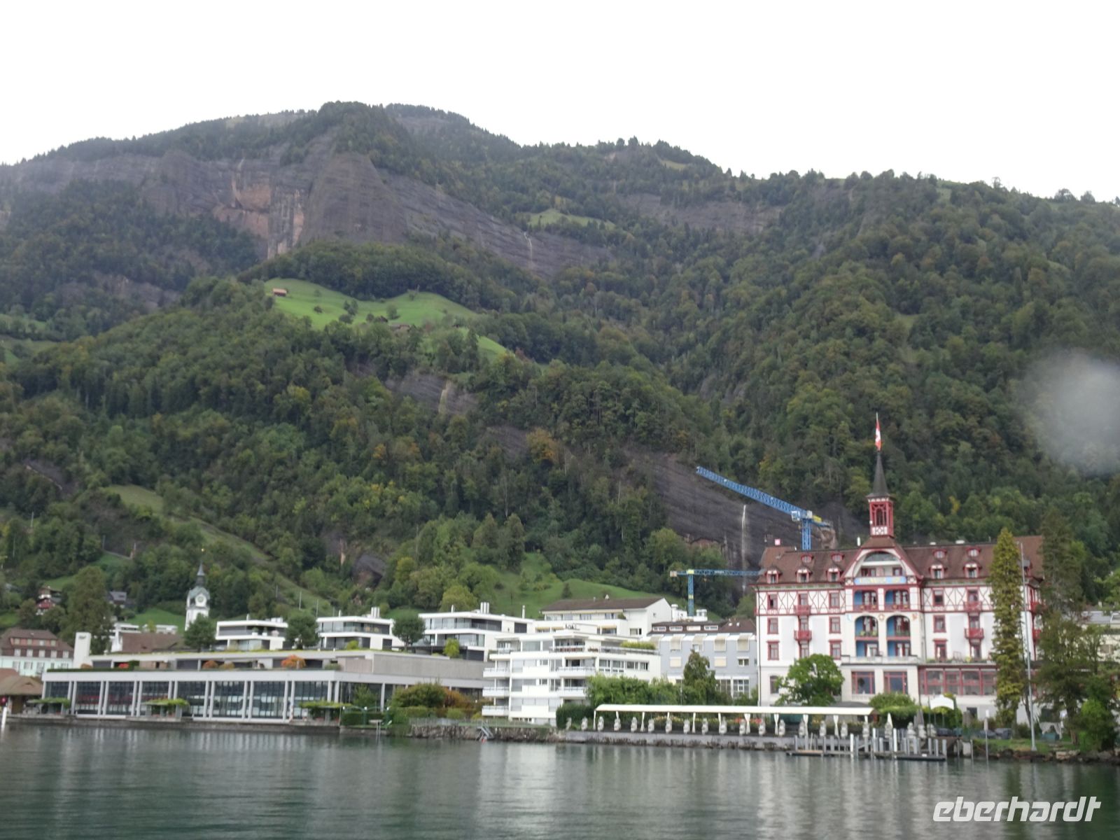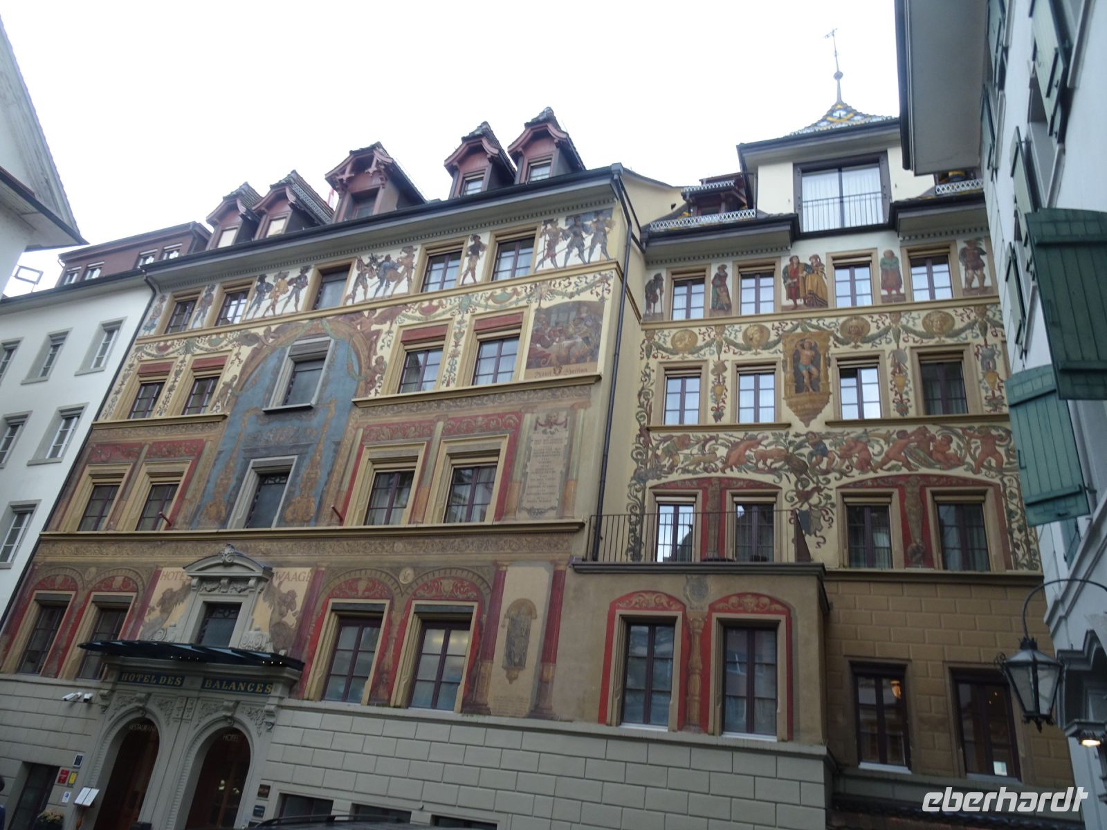 Unser Hotel "Waldstätterhof", direkt am nach dem Brand am 5. Februar 1971 wieder aufgebauten Bahnhof Luzern, war zentral gelegen. Bevor wir am Nachmittag einchecken konnten, zeigte unsere örtliche Stadtführerin uns die innerstädtischen Sehenswürdigkeiten, von Kapellbrücke über Jesuitenkirche bis zum Nadelwehr der Reuss. Mit Blick auf die Stadtmauer Musegg und deren noch erhaltenen 9 Türme ging es über Plätze, Märkte und durch Gassen zum Rathaus. Interessant hier: die Monduhr. Ausleger am Haus der Bäcker, Fassadengestaltung am Hotel "Zur Waage" und die für die Schweiz typischen Brunnen spazierten wir mit fachkundigen Erläuterungen über die Kapellbrücke. Diese nach dem Brand am 18. August 1993 teilweise abgebrannte Brücke wurde komplett wieder aufgebaut. Wir bestaunten die Post aus der Gründerzeit und erreichten dann unser Hotel. Wir konnten einchecken. Der Nachmittag gehörte uns. Empfehlungen gab es für den Löwenbrunnen, das Richard-Wagner-Museum und als typisch für unsere Reise das Verkehrshaus. Davor die originale Bohrkrone der Tunnelbohrmaschine des Gotthardttunnels. Innen dann die hochinteressanten und alle Verkehrsgattungen in ihrer historischen Entwicklung darstellenden typischen Exponate der Schweiz. Interssant: mit unserem Swiss Travel Pass, unserer "Fahrkarte" für alle DFahhrten mit den Zügen aber auch den öffentlichen Verkehrsmittel. Wir konnten das Verkehrshaus, wie auch verschiedene andere Museen, kostenfrei oder mit um 50% ermäßigtem Eintritt besuchen. Aber wenn wir damit alle Möglichkeiten genutzt hätten, hätte unser Reise mindestens doppelt so lang sein müssen!