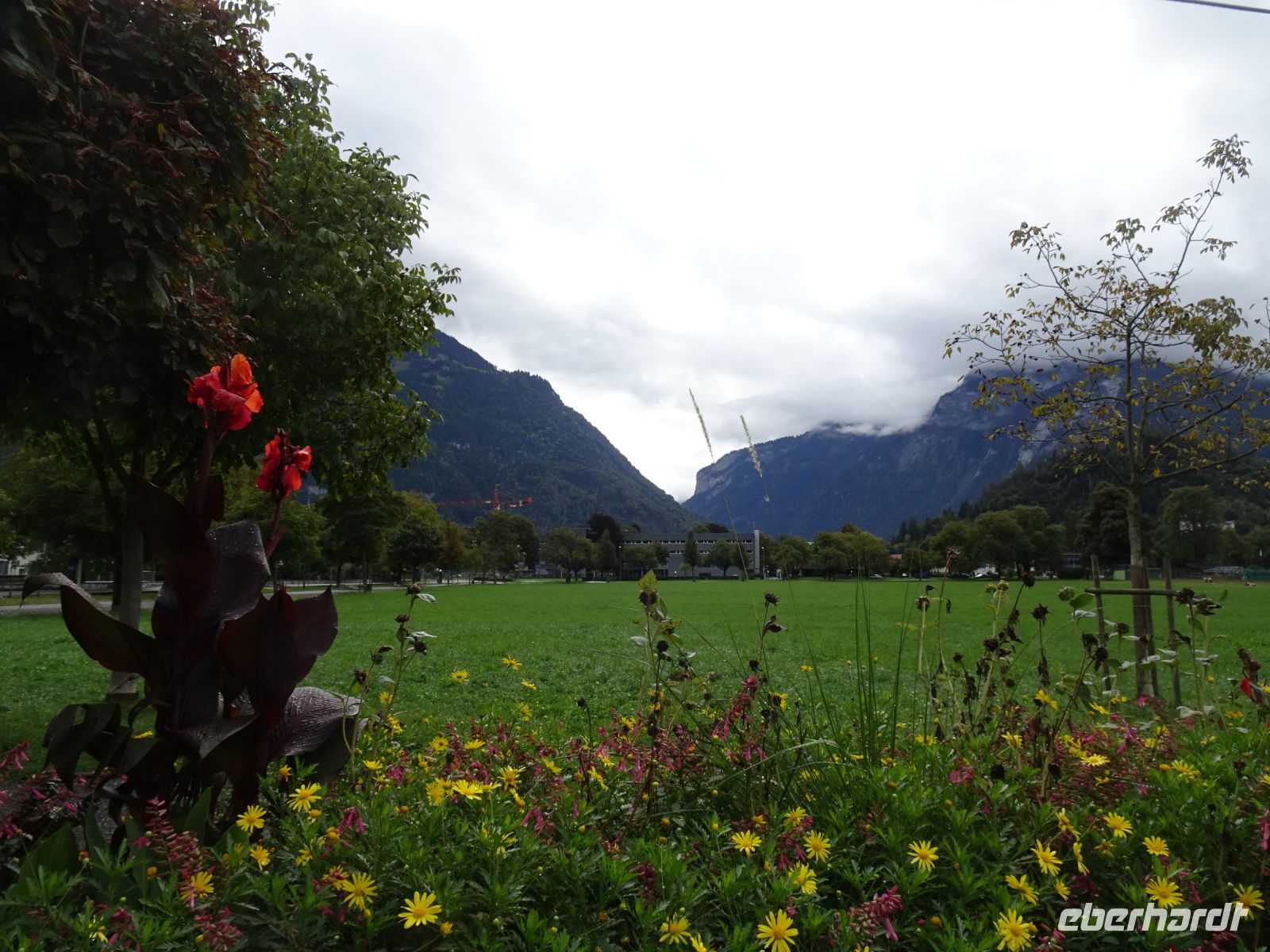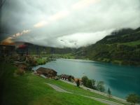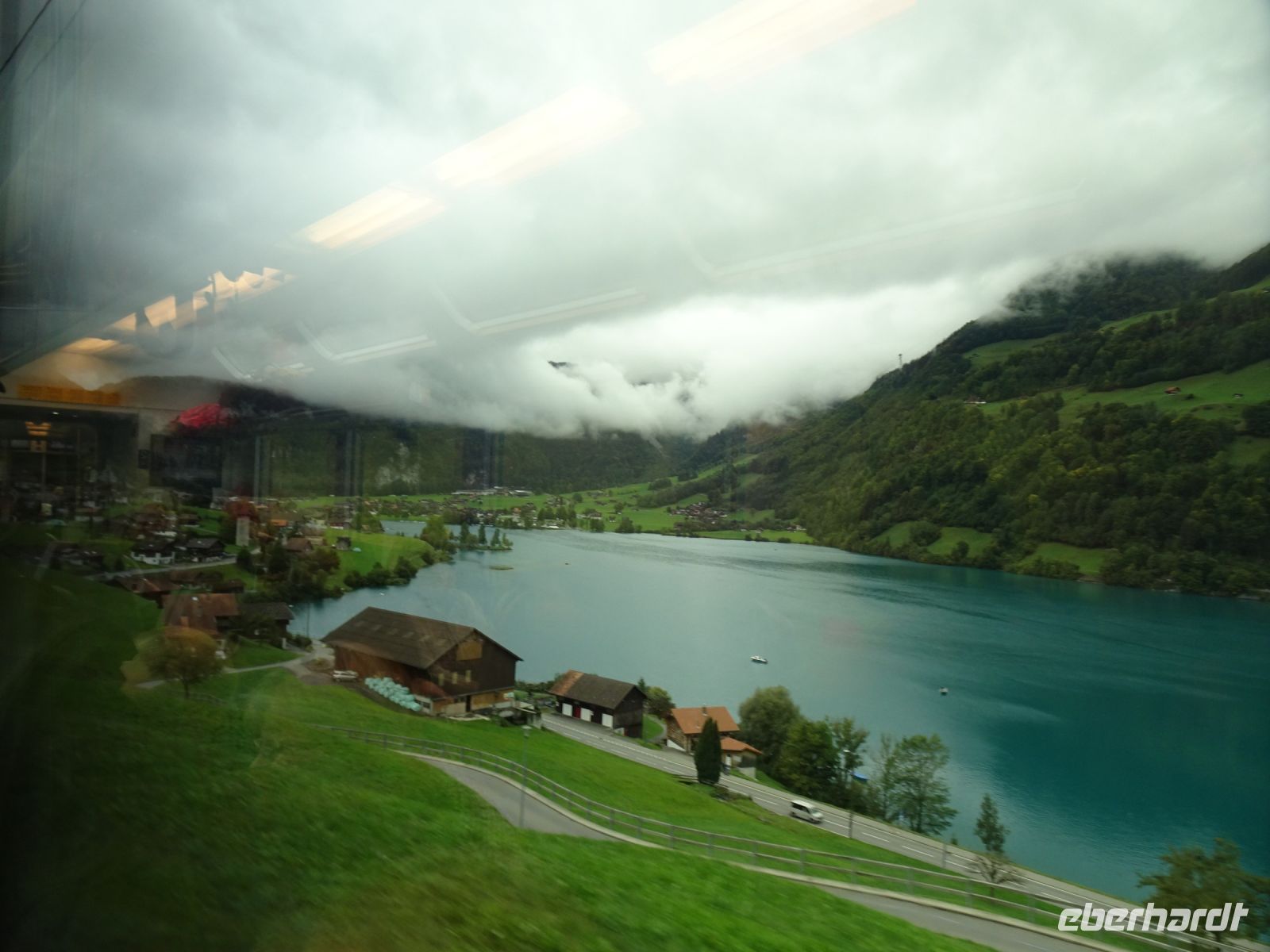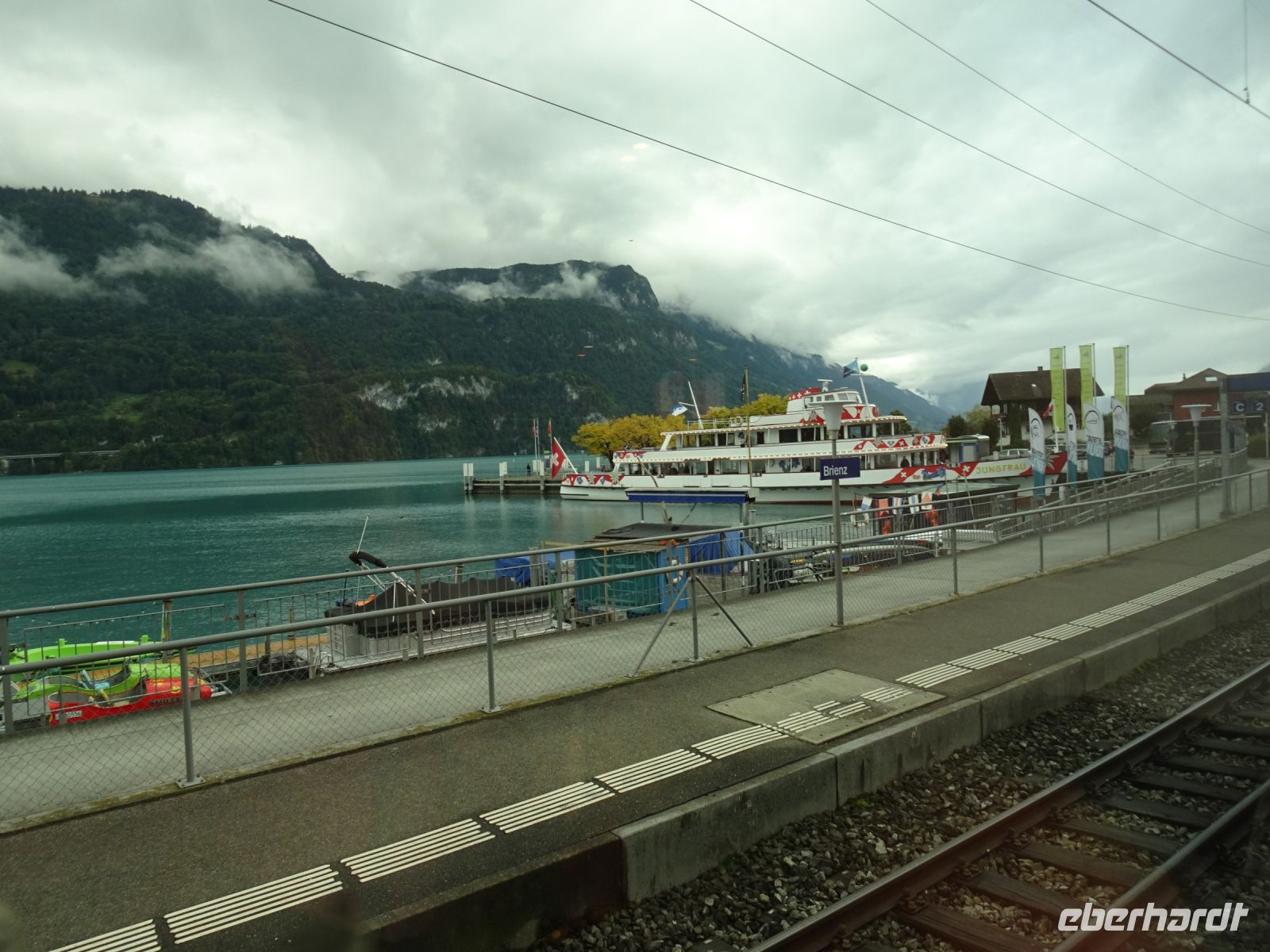 Vorbei an der Pilatus-Auffahrt in Alpnachstadt und dem Lungernsee ging es, teilweise unter Einsatz von Zahnstange bei der Auf- und Abfahrt, mit der 1888 entstandenen Brünigbahn über den Brünig-Pass, mit 1.007 Metern der niedrigste Pass der Schweiz. Angekommen in dem Sherlock-Holmes-Ort Meiringen fuhr unser schmalspuriger Zug entlang der Aare und am Brienzersee vorbei nach Interlaken Ost. Zweimal ging unsere Reise über den Kanal zwischen Brienzer und Thunersee. In Interlaken dann nach einem kurzen Stadtrundgang mit unserem Reiseleiter Weiterfahrt auf Normalspur nach Spiez. Die Berner Alpen, u. a. mit der Jungfrau-Gruppe, waren wolkenverhangen. Erneuter Umstieg an diesem Verkehrsknotenpunkt Spiez, auf dem wir auch ICE nach Hamburg und Güterzüge durch den naheliegenden Lötschbergtunnel sahen.