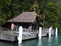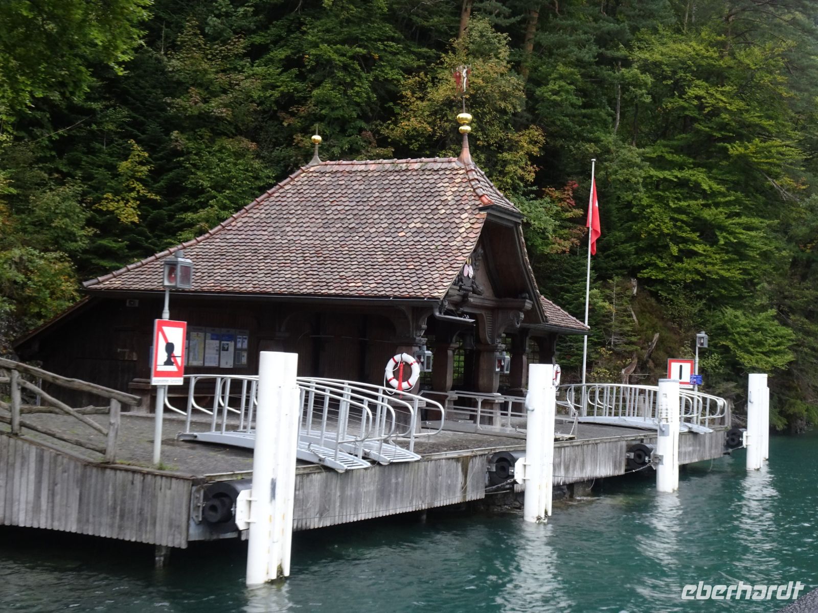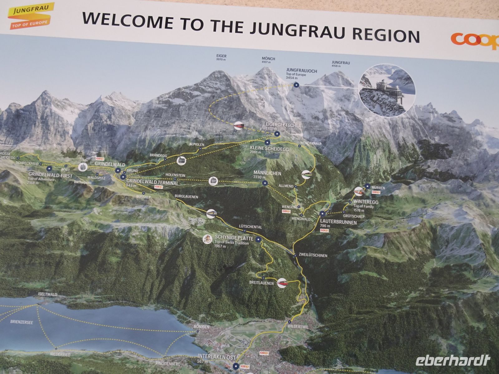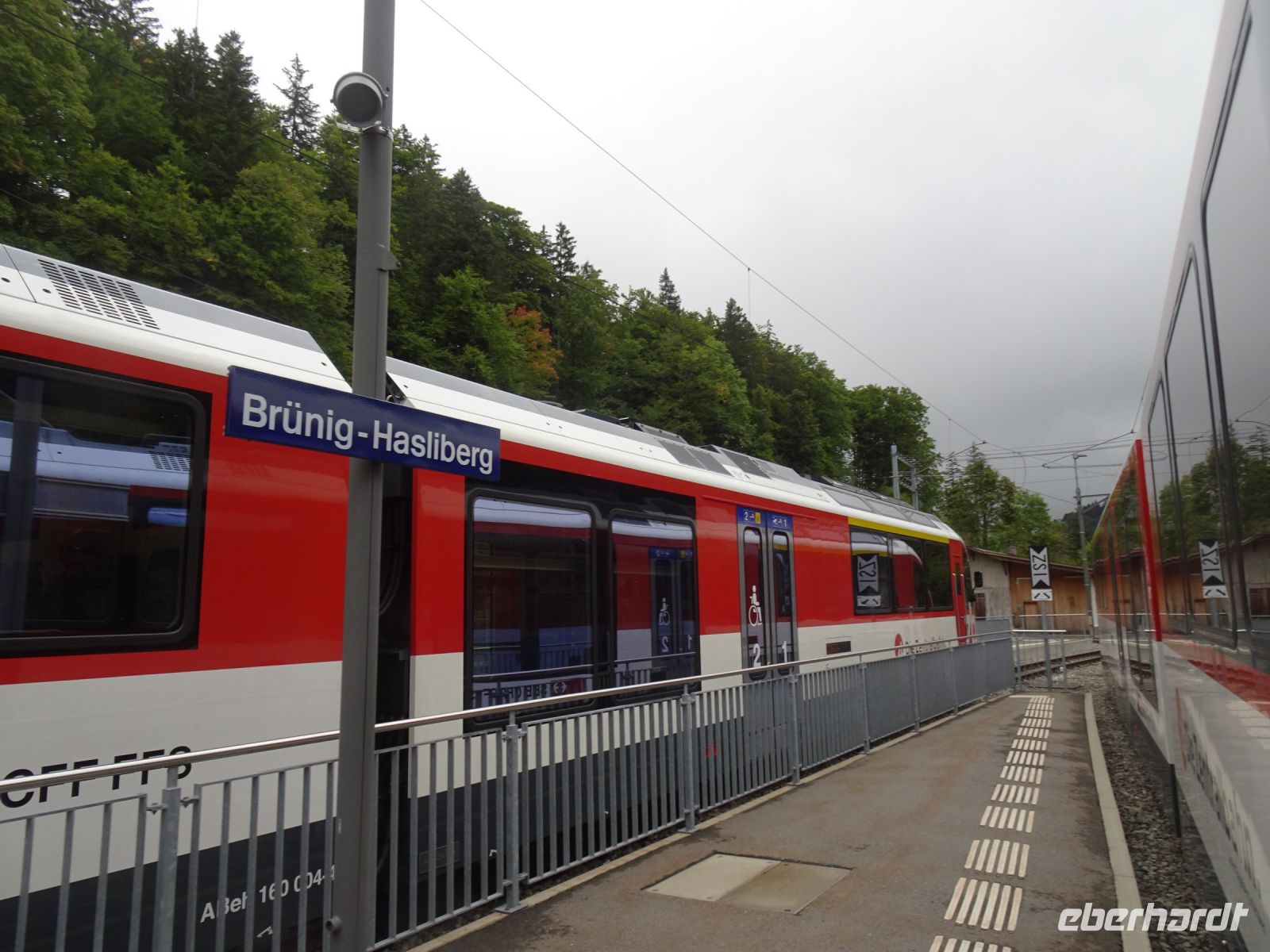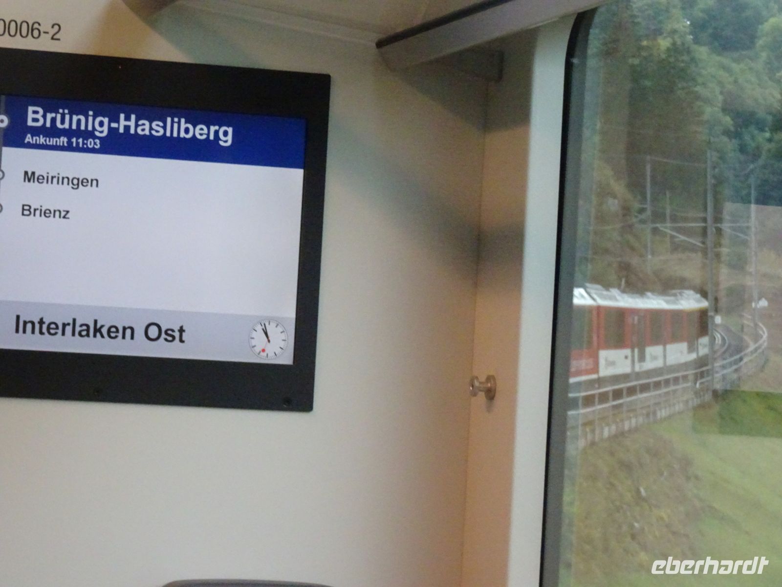 Vorbei an der Pilatus-Auffahrt in Alpnachstadt und dem Lungernsee ging es, teilweise unter Einsatz von Zahnstange bei der Auf- und Abfahrt, mit der 1888 entstandenen Brünigbahn über den Brünig-Pass, mit 1.007 Metern der niedrigste Pass der Schweiz. Angekommen in dem Sherlock-Holmes-Ort Meiringen fuhr unser schmalspuriger Zug entlang der Aare und am Brienzersee vorbei nach Interlaken Ost. Zweimal ging unsere Reise über den Kanal zwischen Brienzer und Thunersee. In Interlaken dann nach einem kurzen Stadtrundgang mit unserem Reiseleiter Weiterfahrt auf Normalspur nach Spiez. Die Berner Alpen, u. a. mit der Jungfrau-Gruppe, waren wolkenverhangen. Erneuter Umstieg an diesem Verkehrsknotenpunkt Spiez, auf dem wir auch ICE nach Hamburg und Güterzüge durch den naheliegenden Lötschbergtunnel sahen.