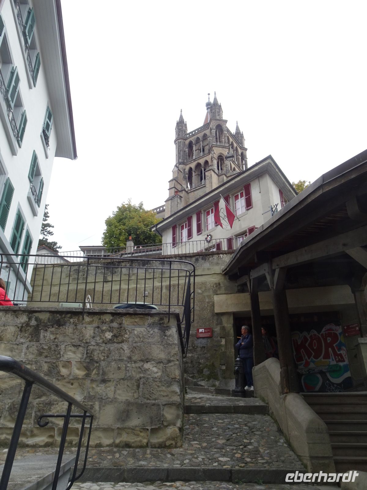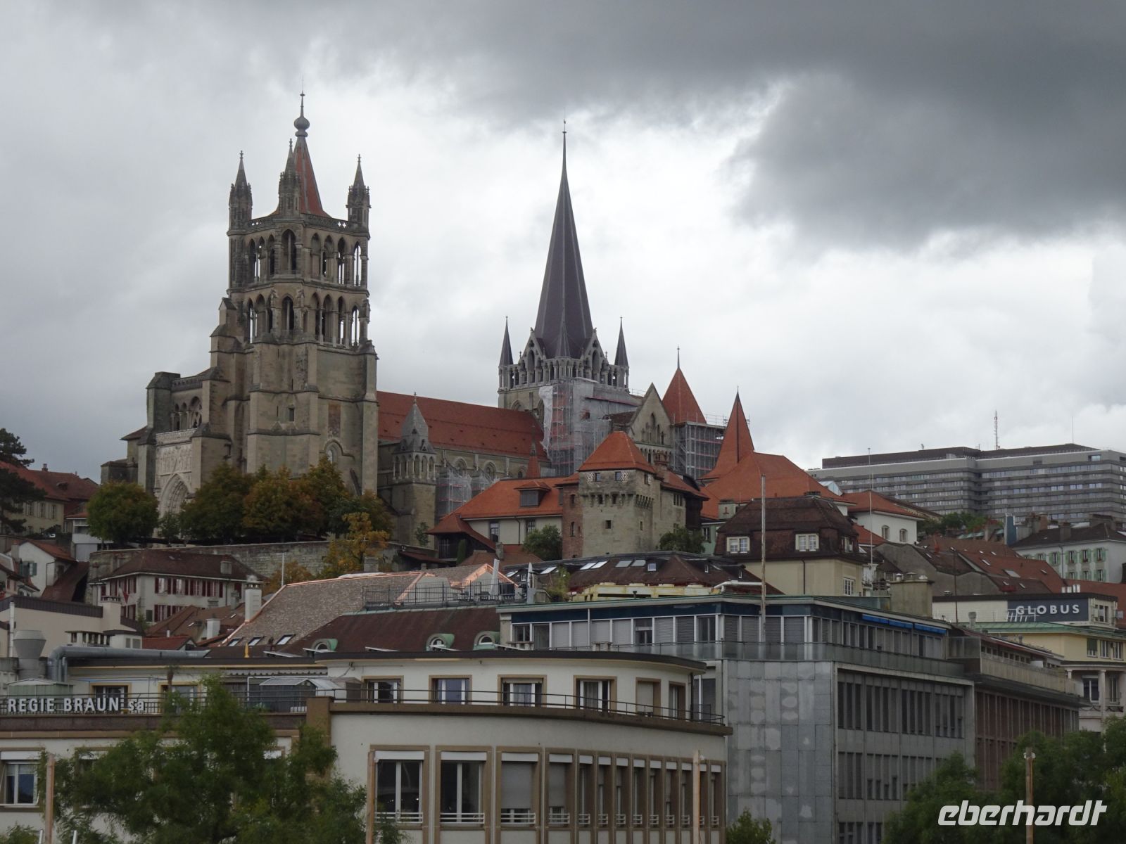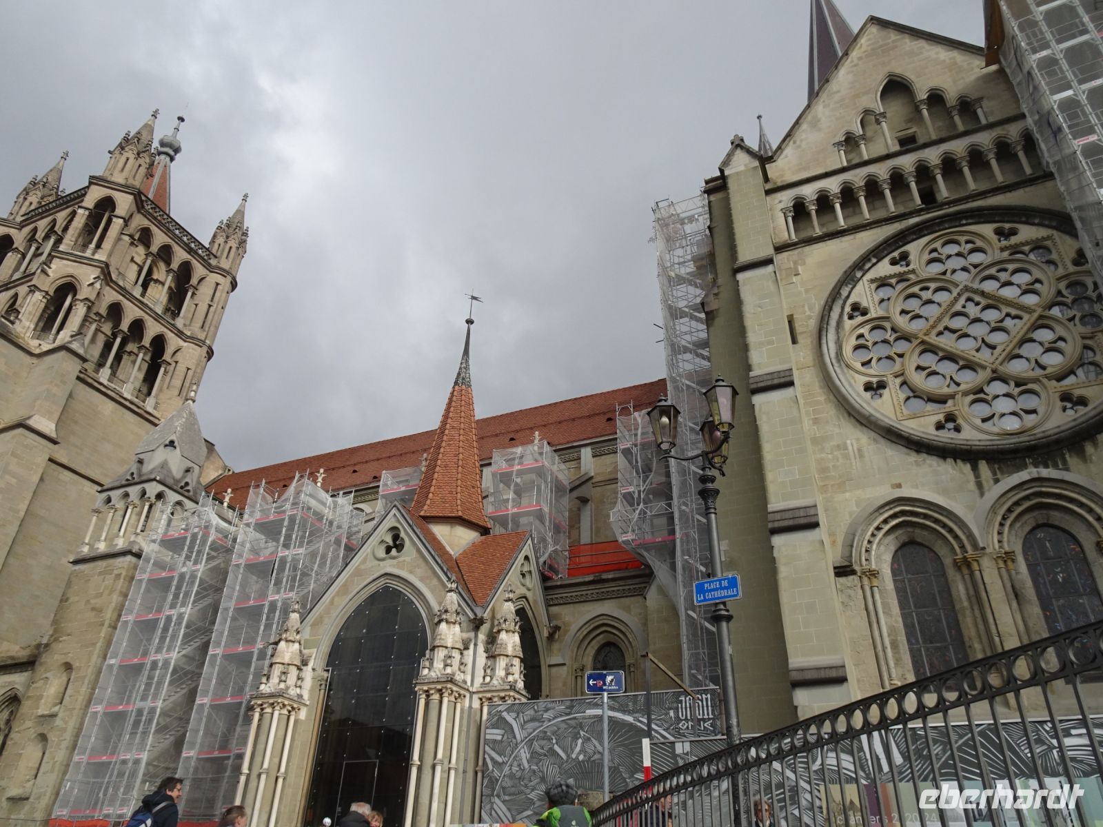 Lausanne, die Olympiametropole, liegt auf drei Bergrücken und zwischen Genfer See und den umgebenden Berghöhen. Wesentlich zur Bewältigung der innerstädtischen Mobilität ist neben einem vielfältigen Verkehrsnetz mit Bussen und O-Bussen vor allem - die "Metro" - sehr interessant. Auch wir nutzten im Rahmen unseres Stadtrundganges die Metro, um zur Kathedrale Notre Dame zu kommen. Nach einer interessanten Führung durch die Kathedrale mit deren prachtvollen Portalen hatten wir von hier oben einen herrlichen Blick über den Osten der Stadt. Zu Fuß über altehrwürdige Stufen zum Rathaus hinabsteigend gab unsere örtliche Stadtführerin uns interessante Details mit auf den Weg. In der ebenfalls besuchten Franziskanerkirche hatten wir sogar Glück und konnten ein kurzes Orgelspiel hören. Auch hier an einer wichtigen innerstädtischen Viaduktbrücke umfassende Bauarbeiten. Da war Vorstellungsgabe mit Blick auf die auf dem Berge thronenende Kathedrale Notre Dame gefragt.