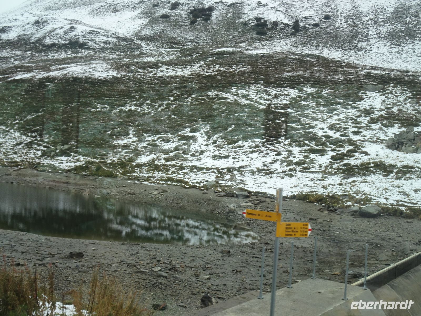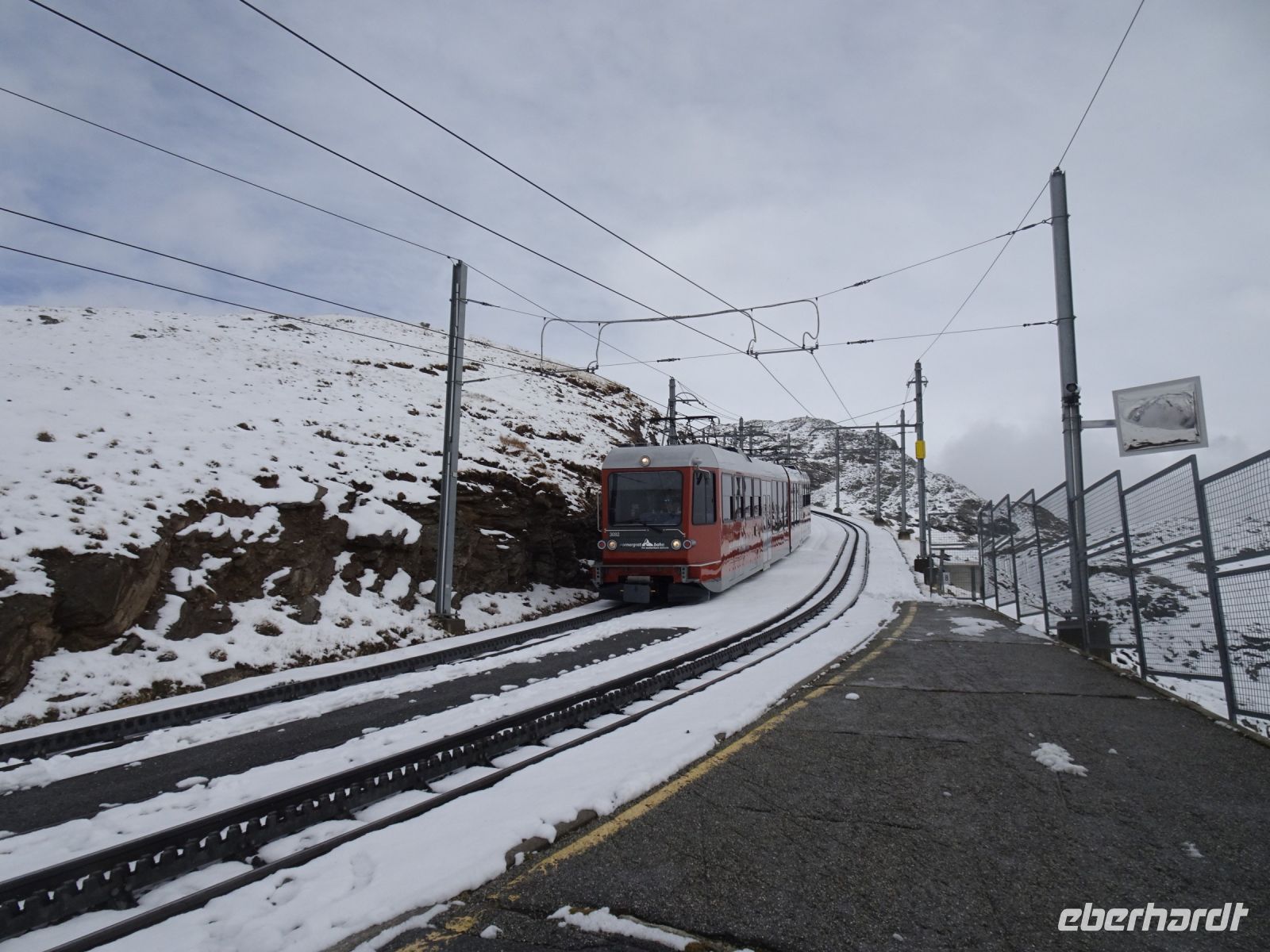 Der Wetterbericht ließ uns hoffen, dass die Wetterverhältnisse für eine Auffahrt mit der höchstgelegenen Zahnradbahn Europas auf das Gornergrat geeignet sind. Anhaltender Regen am Vormittag führte jedoch zu einer veränderten Planung: um 13 Uhr starteten 11 Reisegäste die Auffahrt auf das Gornergrat. Der vom Reisleiter angebotene Zwischenhalt am Rotenboden zum Blick über den Riffelsee zur Matterhornspiegelung fiel buchstäblich ins Wasser, erste Spuren konnten wir dagegen im Neuschnee hinterlassen.
