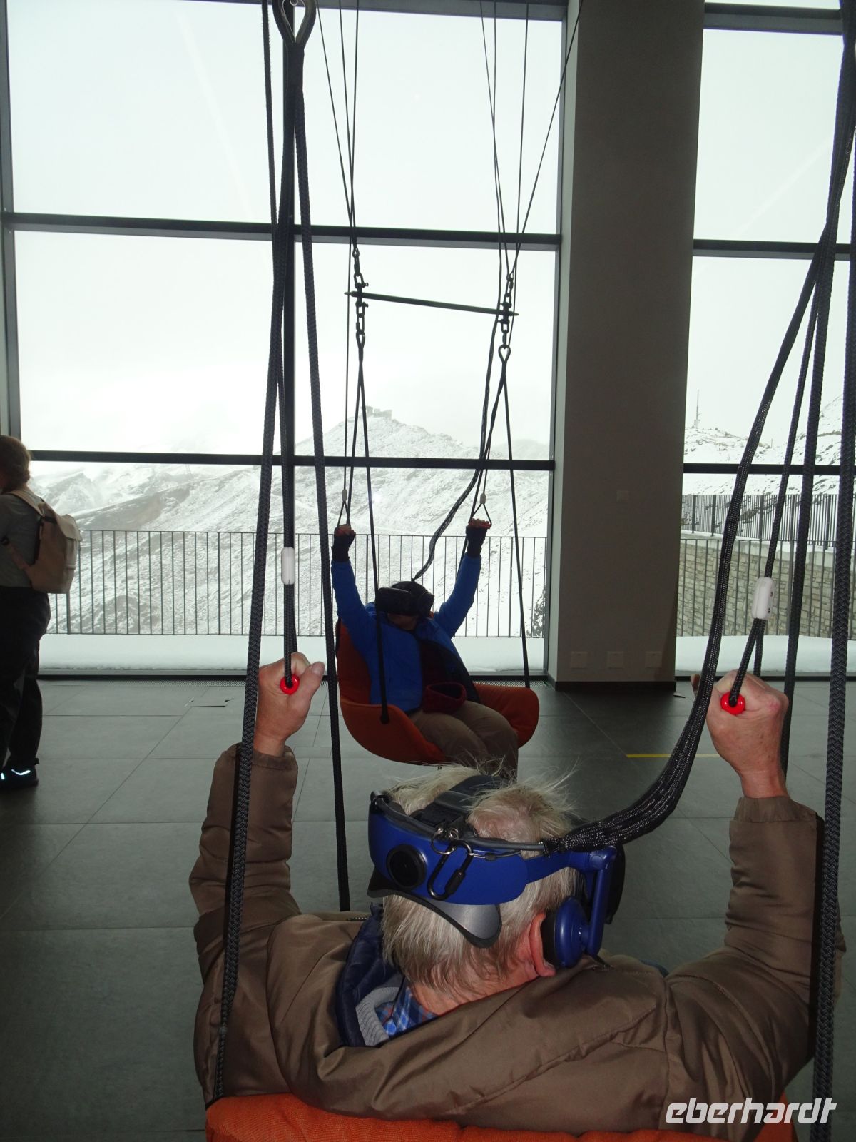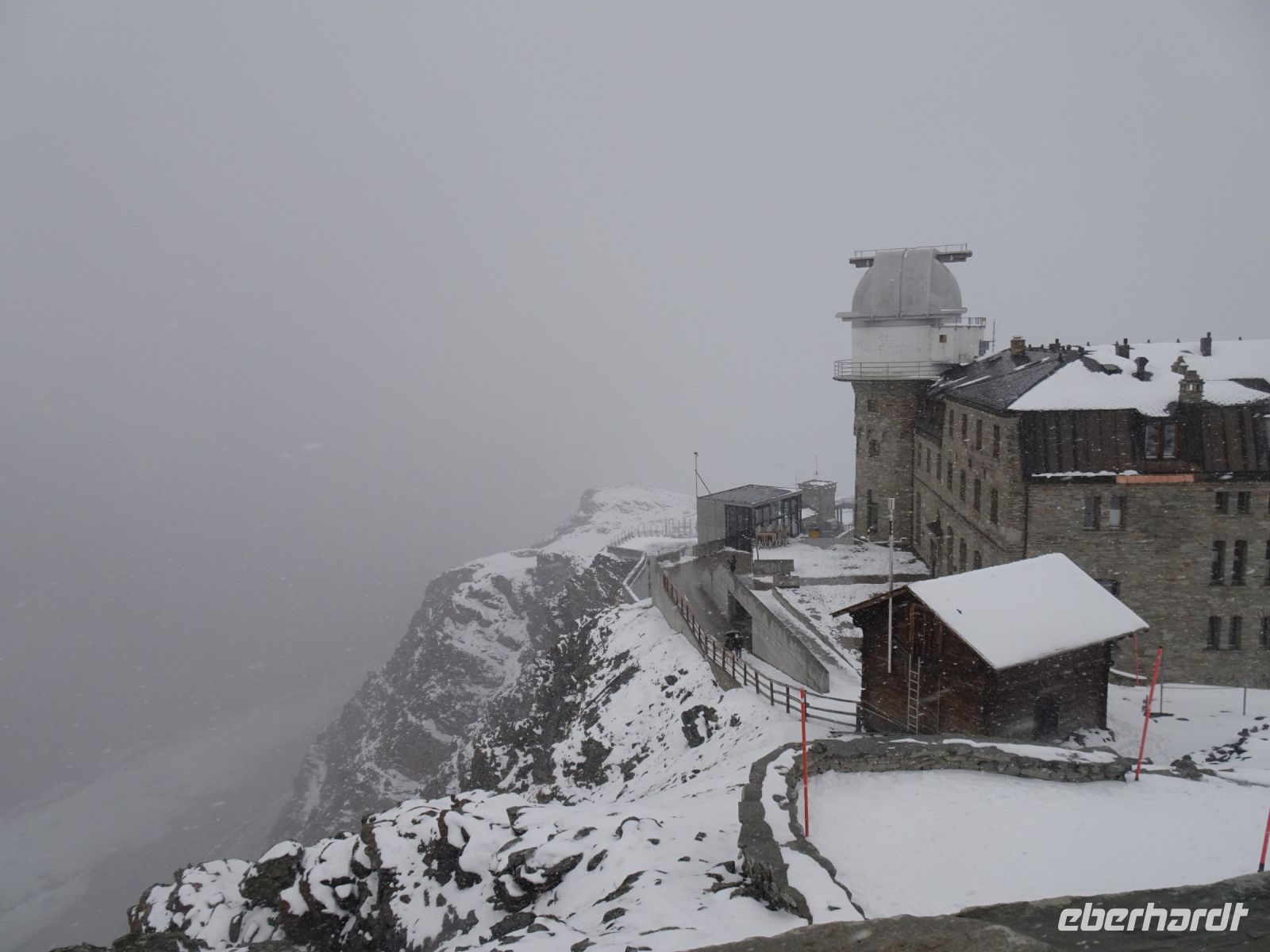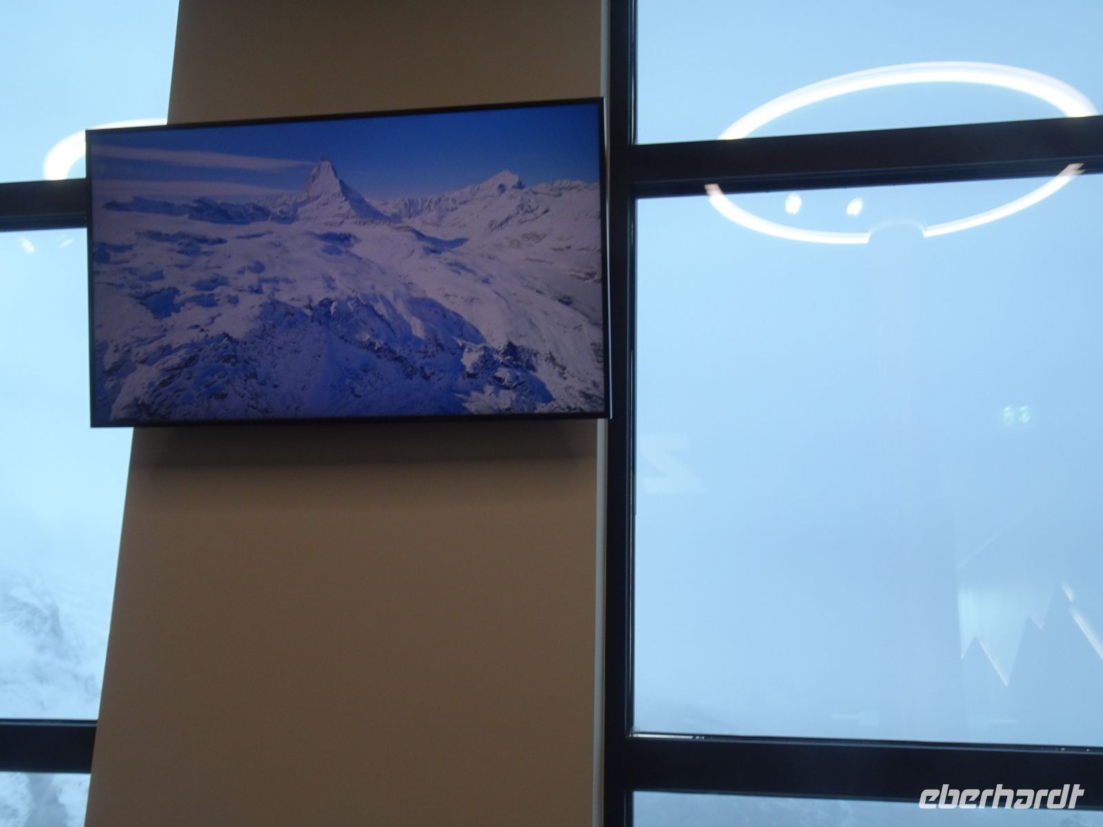 Auf dem Gornergrat bestiegen wir zwar die Aussichtspunkte in über 3.000 m, hatten aber keine Aussicht auf die Gipfel. Trotzdem konnten wir uns in der erst kürzlich eröffneten Multimediaschau "Zooom" ein Bild von das Gornergrat umgebender Landschaft mit dem Matterhorn machen. Interessante Aussichten "aus der Konserve" und ein virtueller Flug um das Matterhorn gaben trotzdem einen guten Eindruck von den Bergen und deren Bezwingern.