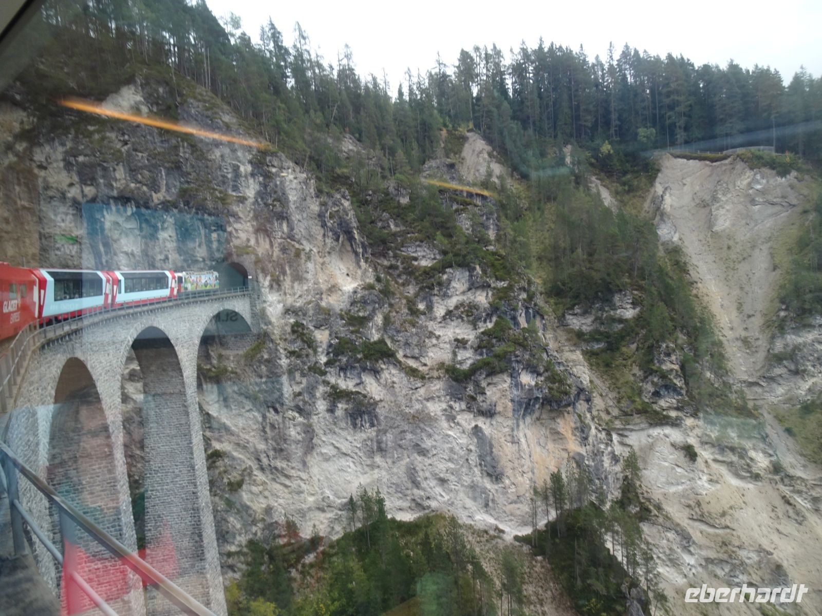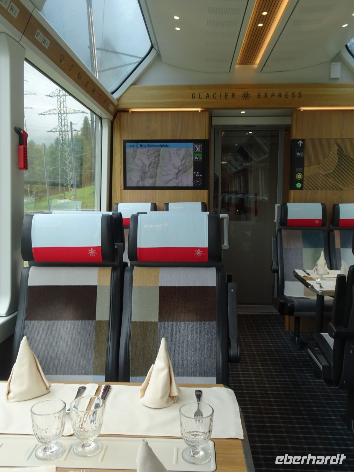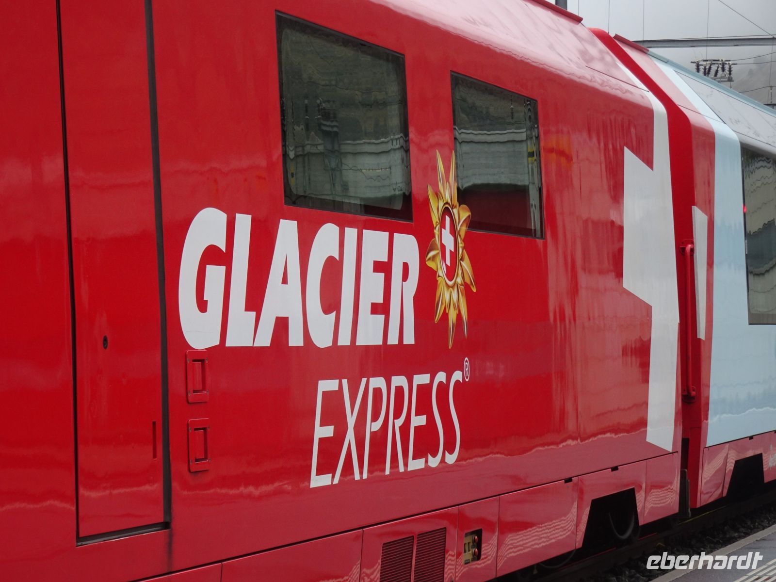 Nach kurzem Fußweg erwartete uns im Bahnhof Zermatt der Glacier Express mit seinen Panoramawagen. Der langsamste Schnellzug der Welt erwartete uns auf seinen 291 km zur Fahrt über 291 Brücken und durch 91 Brücken und Viadukten. Interessante Details sind dabei der Furka-Basistunnel mit fast 15 km Länge, die Solisbrücke bei Tiefenkastel, das Landwasserviadukt bei Filisur, die Kehren beim Ort Bergüm und der fast 6 km lange Tunnel unter dem Albulapass in das obere Engadin.