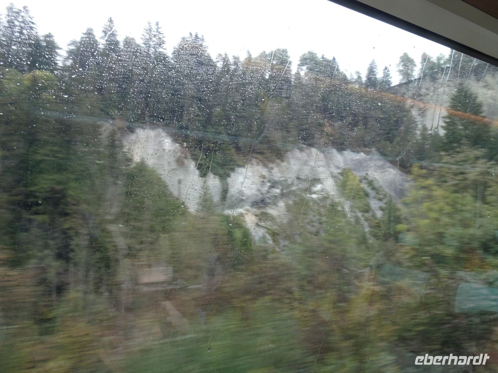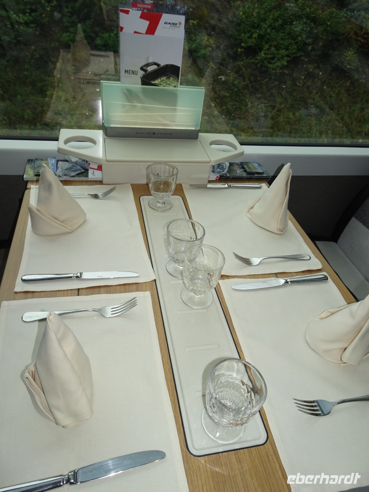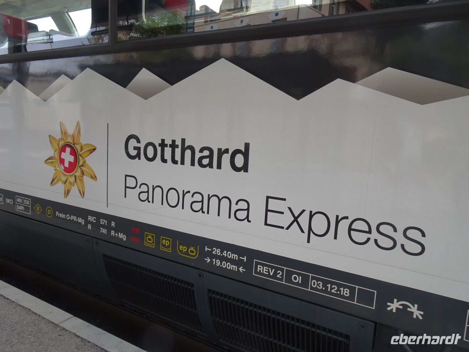 Nach kurzem Fußweg erwartete uns im Bahnhof Zermatt der Glacier Express mit seinen Panoramawagen. Der langsamste Schnellzug der Welt erwartete uns auf seinen 291 km zur Fahrt über 291 Brücken und durch 91 Brücken und Viadukten. Interessante Details sind dabei der Furka-Basistunnel mit fast 15 km Länge, die Solisbrücke bei Tiefenkastel, das Landwasserviadukt bei Filisur, die Kehren beim Ort Bergüm und der fast 6 km lange Tunnel unter dem Albulapass in das obere Engadin.
