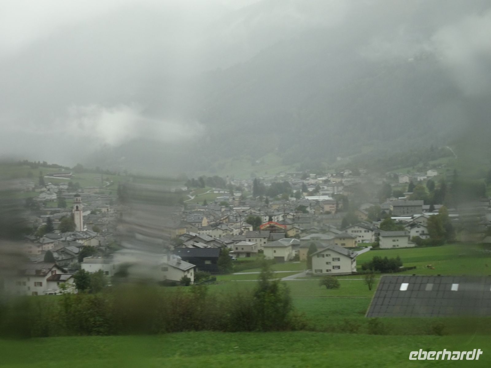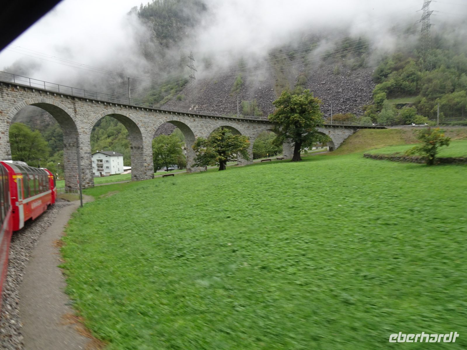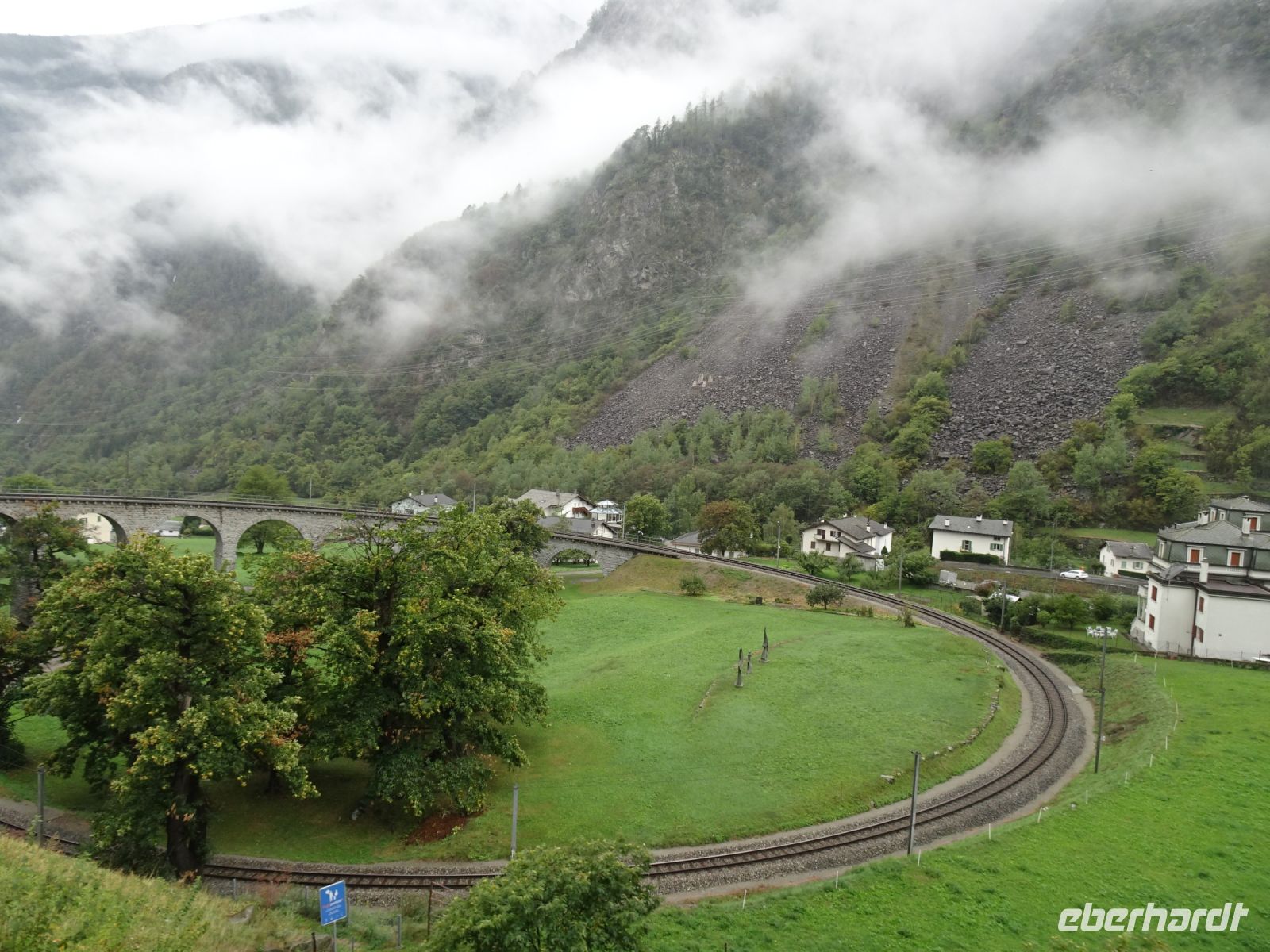Vorbei an Pontresina und dem Morteratschgletscher ging es zum Berninapass in 2.235 m Höhe. Nicht ohne vorher noch an der hier bestehenden Wasserscheide zwischen Nordsee und adriatischem Meer vorbei zu fahren. Die Berge und Gletscher hatten sich auch an diesem Tag verhüllt, nur bei unserem Halt in Alp Grüm, nun schon auf der nach Süden gehenden Fahrt in das Puschlaver Tal, konnten wir die der Stromversorgung des Bernina Express dienenden Wasserkraftwerke bestaunen. Durch Kehren und Galerien ging es vorbei an Le Prese - hier wird der Bernina Express zeitweise zur Straßen-Bahn - weiter zum Kreisviadukt von Brusio - beeindruckend!
